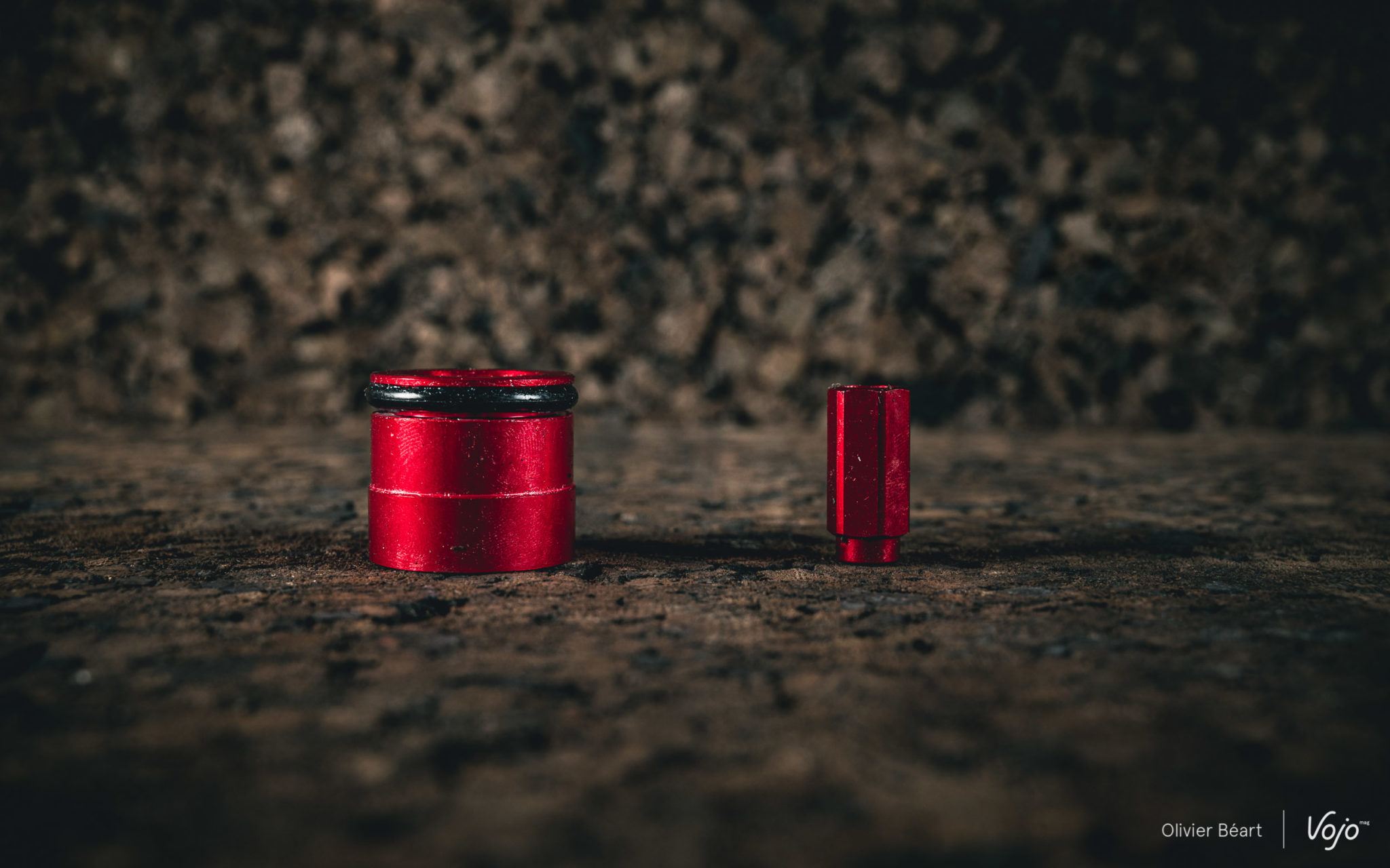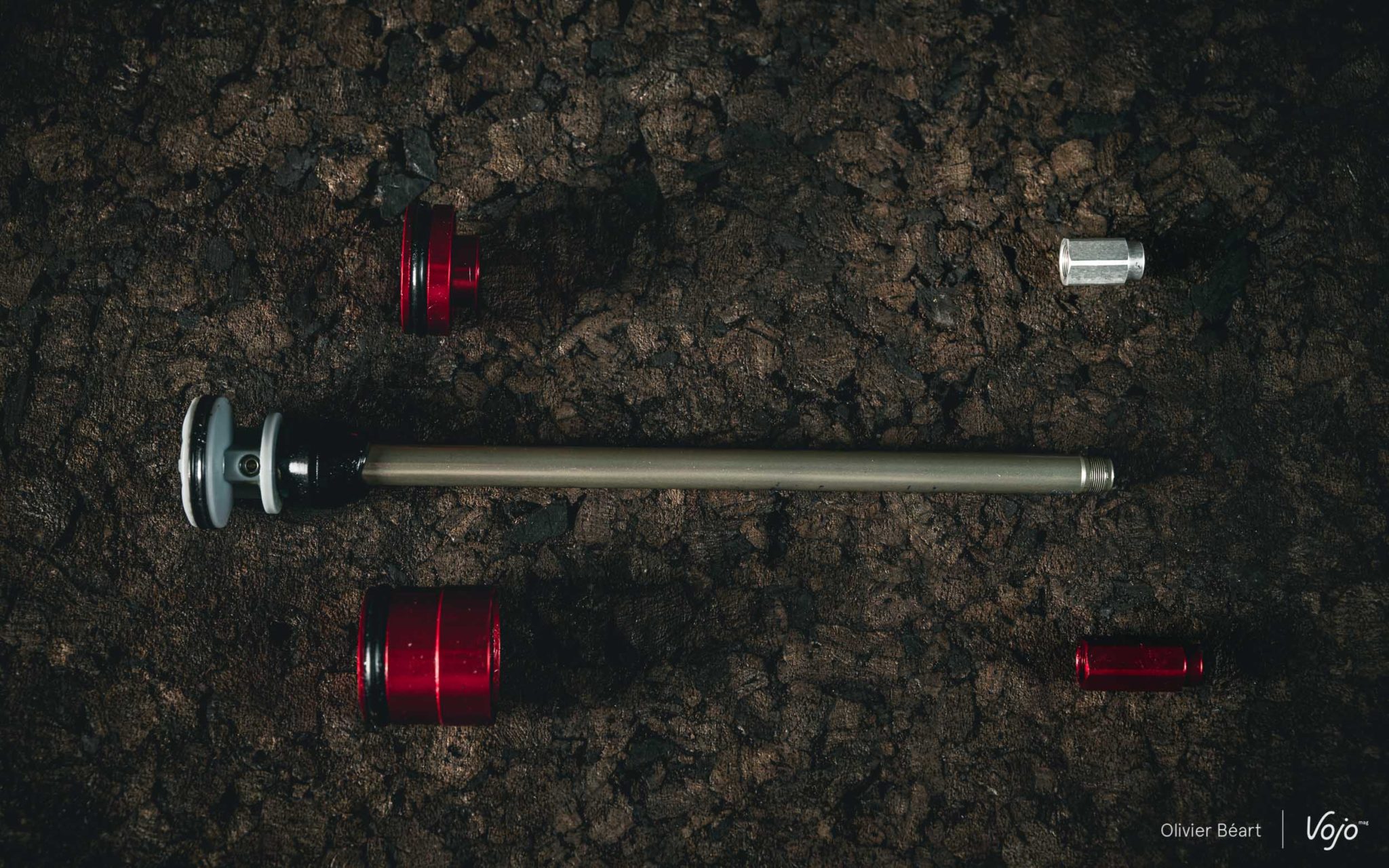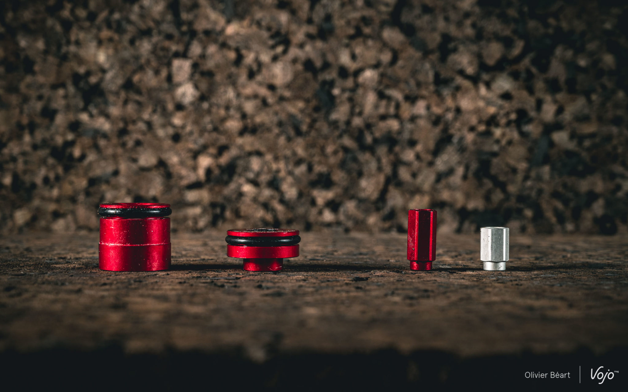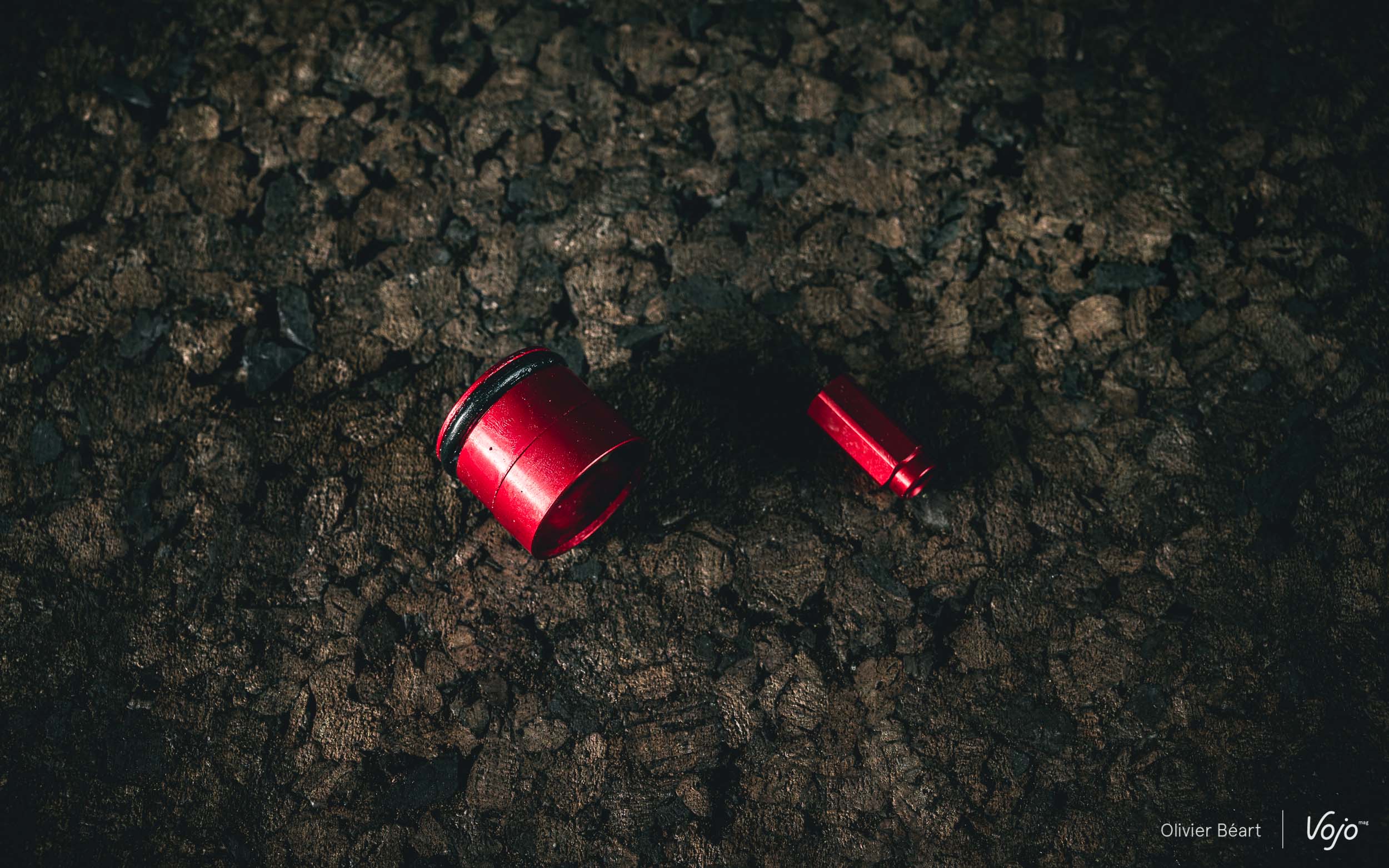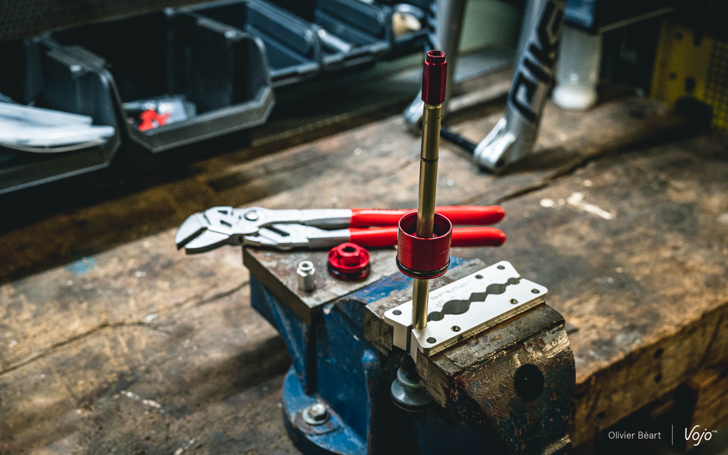 Tout se joue dans la partie gauche de la fourche, celle qui abrite le ressort pneumatique de la fourche (le fourreau droit étant dédié à l’hydraulique). Deux pièces ont été modifiées sur le piston, et ce sont celles que vous pouvez voir en rouge sur l’image ci-dessus.