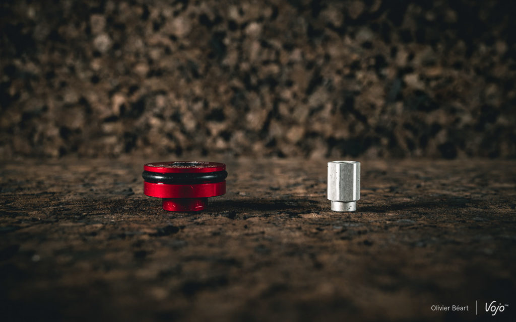 On le voit, les deux nouvelles pièces qui sont le cœur de cette mise à jour du DebonAir (écrou de la tige du piston et la tête d’étanchéité) sont plus grandes (à gauche la nouvelle version, à droite la précédente). Le but est de placer le piston plus haut dans la fourche (+10mm). Cela le positionne désormais le piston pile au niveau du « grain de riz », qui est est le petit orifice creusé dans la paroi du plongeur pour permettre l’équilibrage des chambres positive et négative. Auparavant, cet équilibrage ne se faisait qu’après avoir enfoncé la fourche d’au moins 10mm, ce qui entraînait un fonctionnement moins naturel du passage entre le positif et le négatif. Ici, ce passage se fait de manière beaucoup plus linéaire, et cela dès le départ.