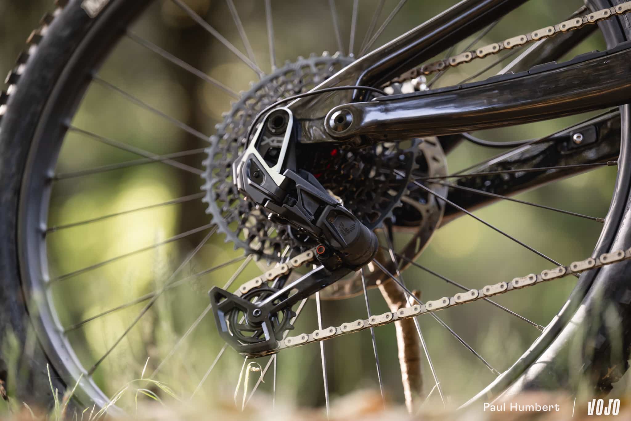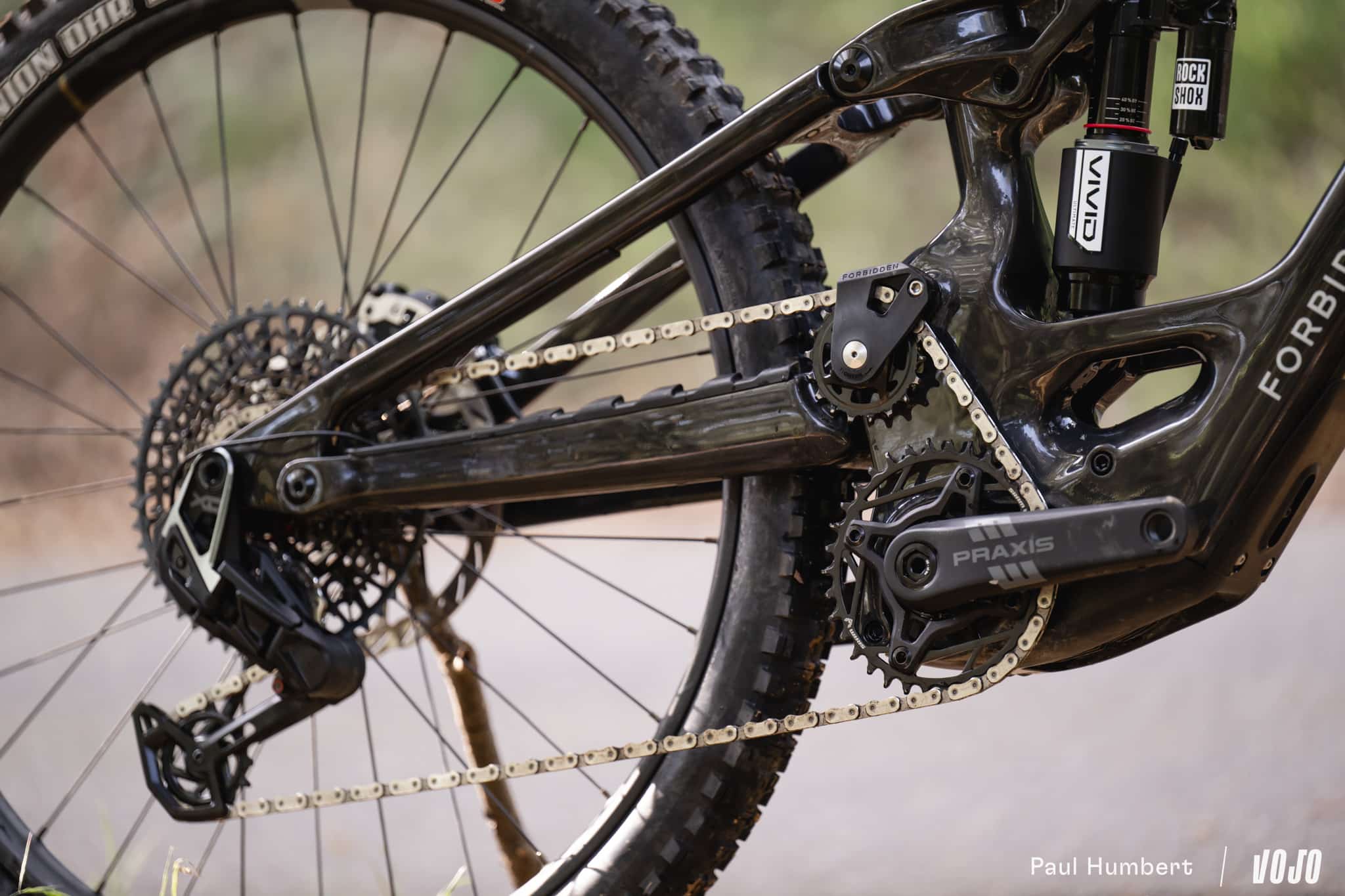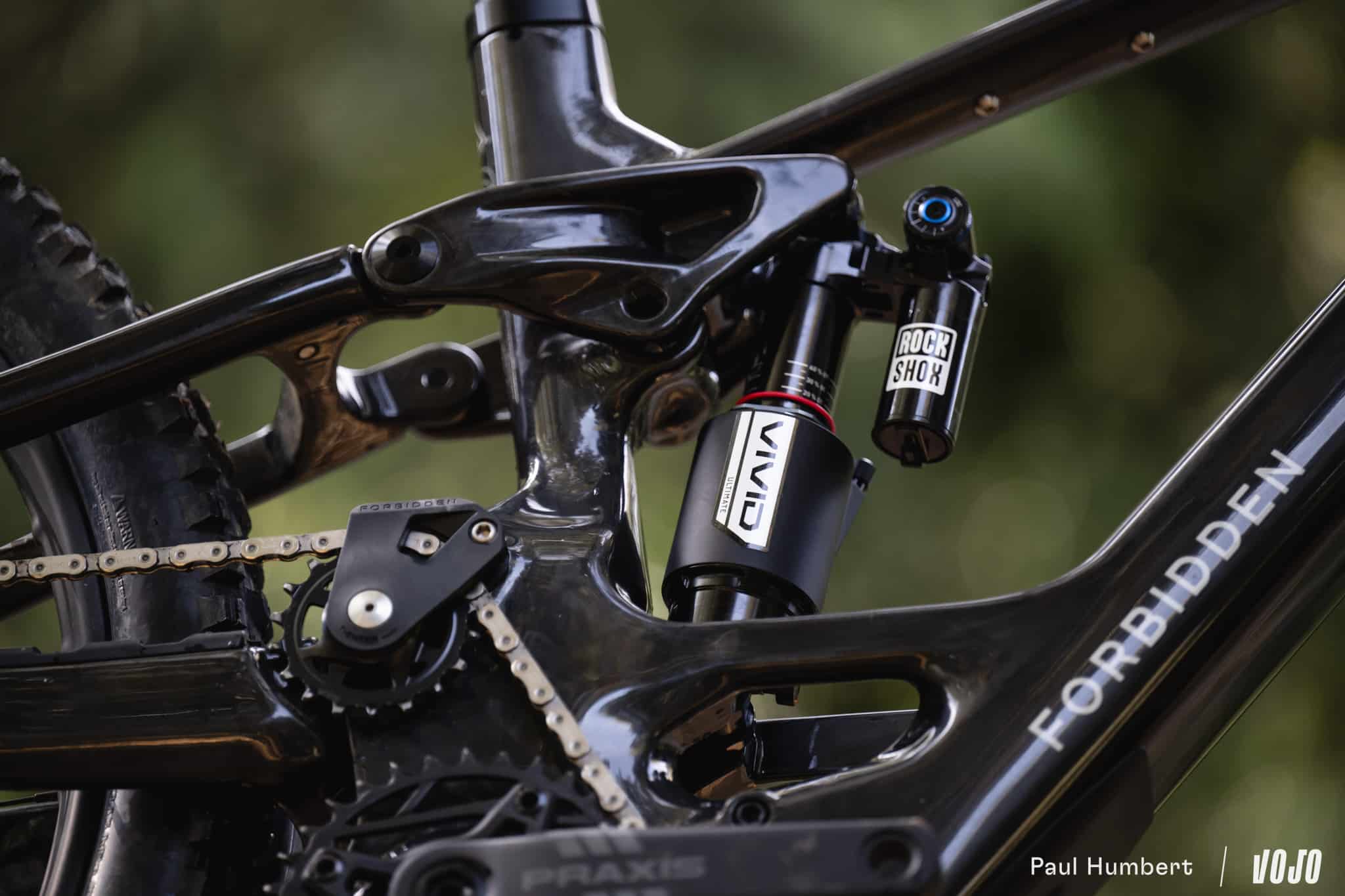 On retrouve le point de pivot haut « signature » de Forbidden, associé à une roulette de renvoi. La marque continue de décliner cette proposition technique dans la recherche du kickback le plus faible, mais n’exclut pas d’opter pour d’autres solutions si elles se révèlent plus adaptées à l’usage du vélo.