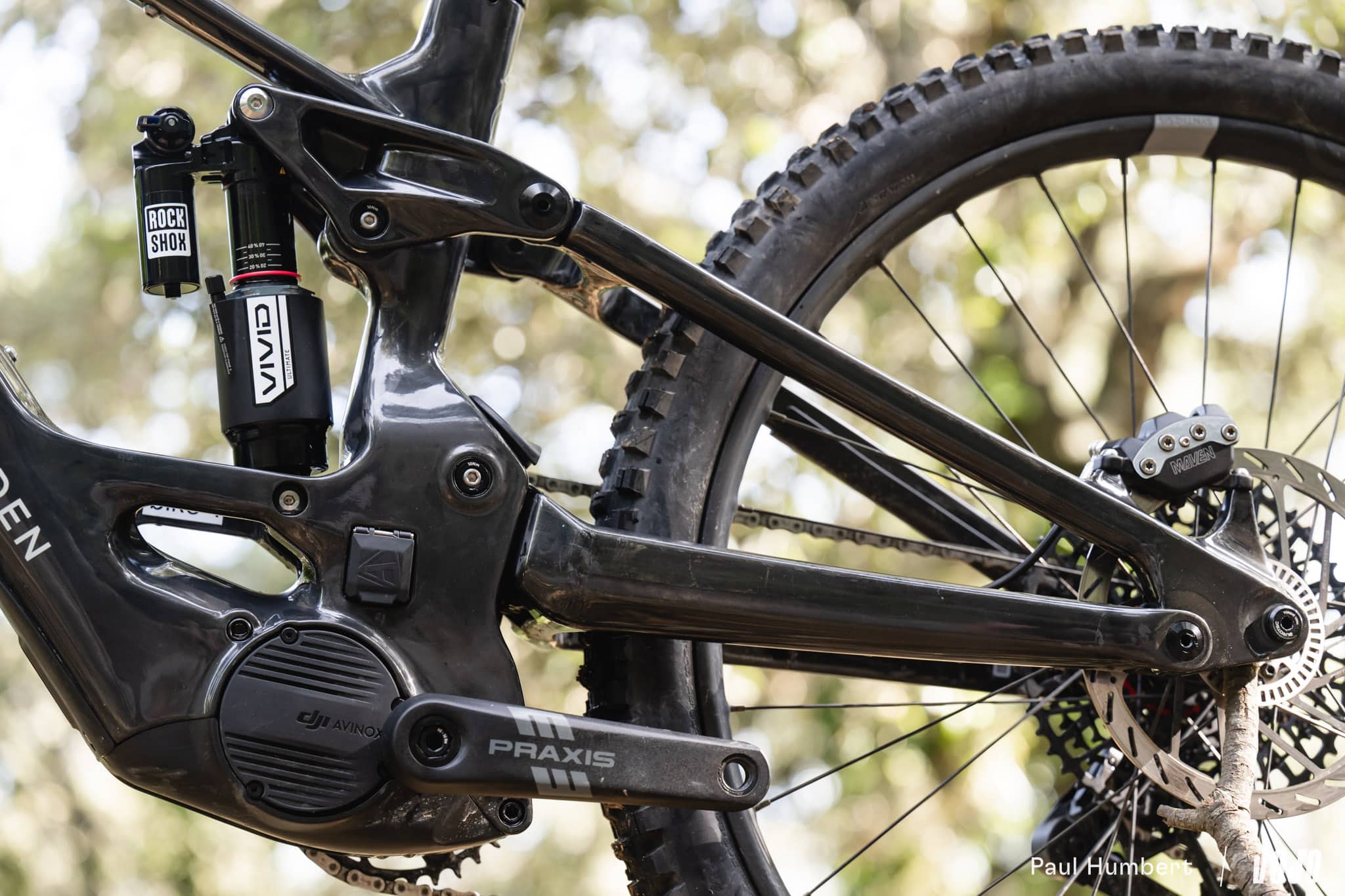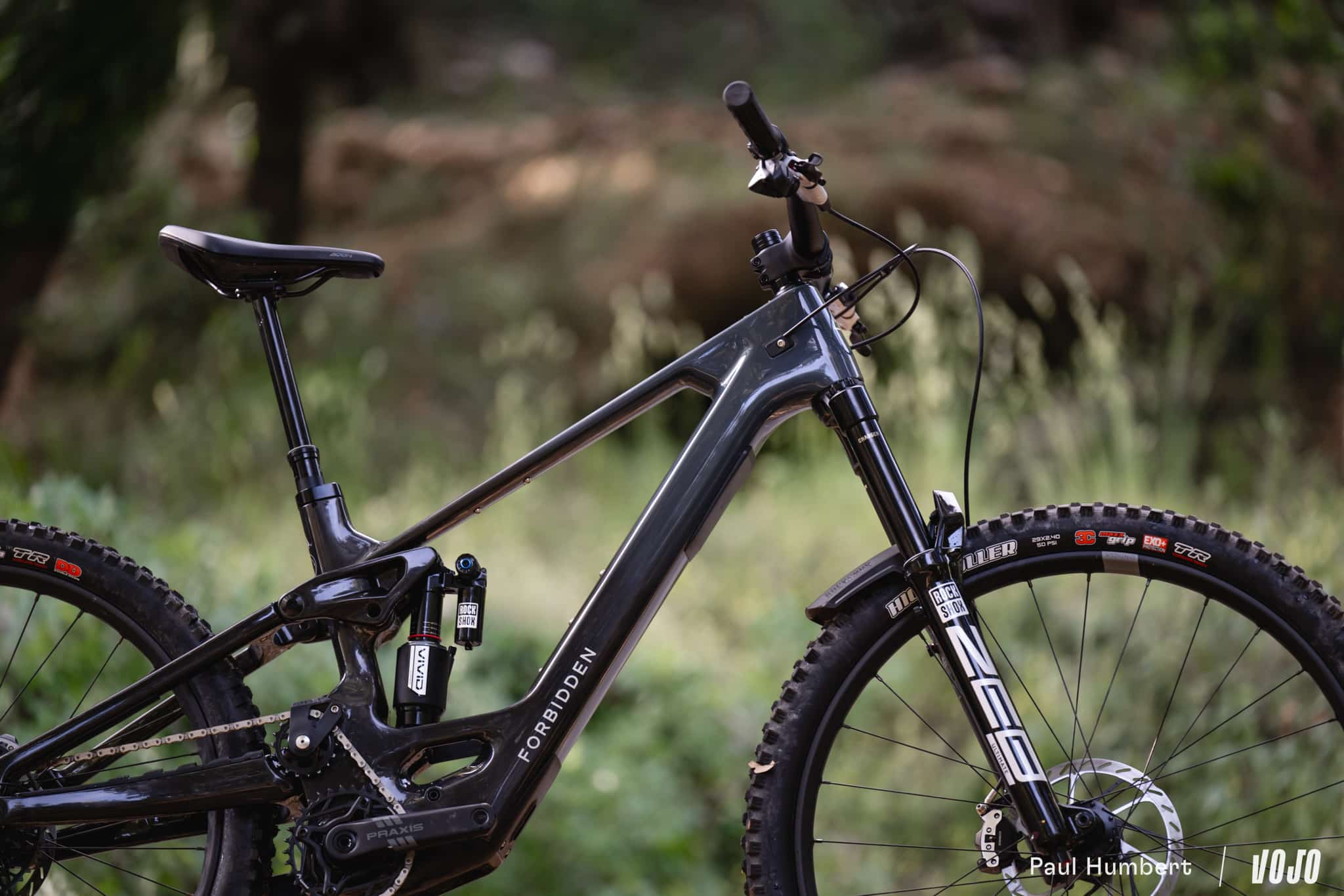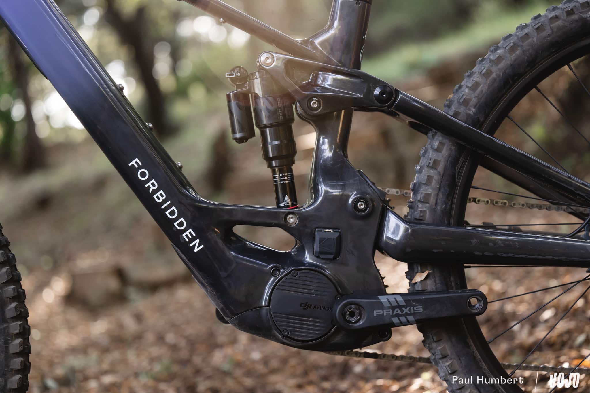 Pour accommoder la présence du moteur, Forbidden décline sa cinématique four bar linkage avec un amortisseur parallèle au tube de selle, un peu comme Santa Cruz qui se détourne du VPP pour ses Vala et Bullit. Cela permet également une grande capacité d’insertion de tige de selle ( jusqu’à 180 mm sur une taille S).