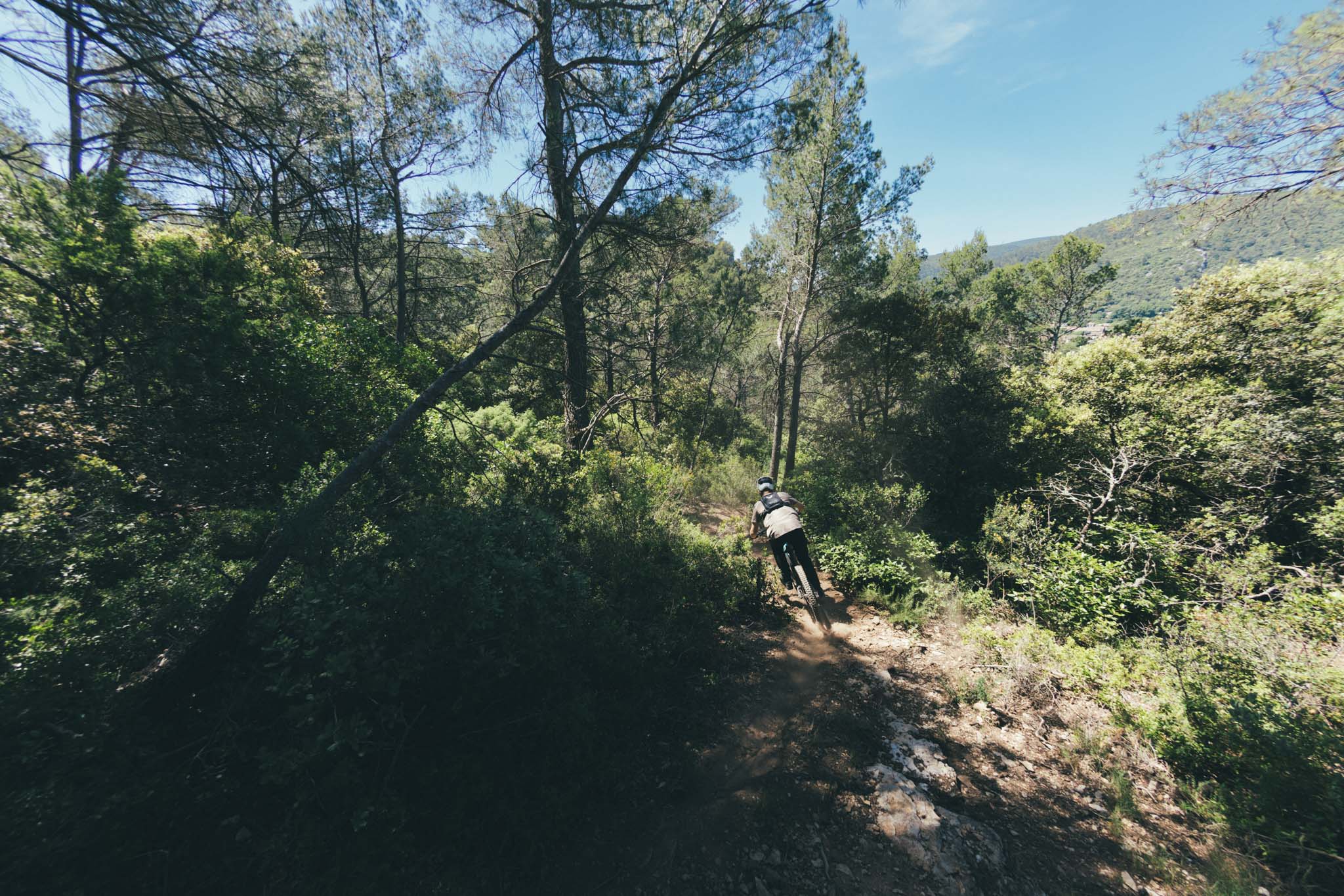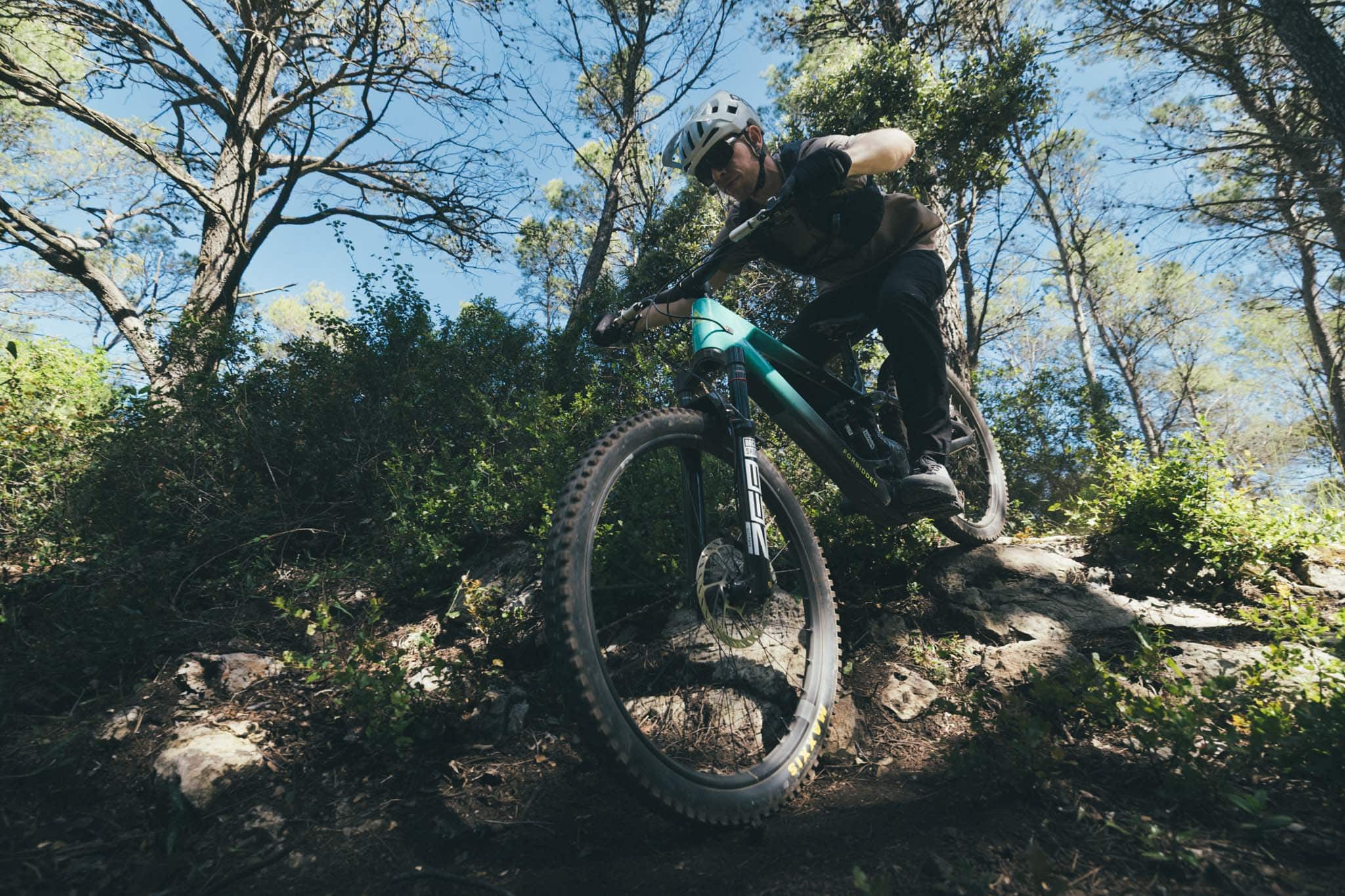 La cinématique à point de pivot haut libère la suspension et le vélo encaisse les chocs sans broncher, et, surtout, stabilise notre pilotage. On se sent ancré sur le sol et assez indéboulonnable, avec beaucoup de grip. Mais le plus surprenant est qu’on arrive à conserver une belle facilité à changer d’angle et à placer le vélo. On sent que le vélo est construit autour du montage « mulet », sans déséquilibre, et le vélo change d’axe en suivant les mouvements d’épaule du rider, mais sans à-coups ou perte de grip.