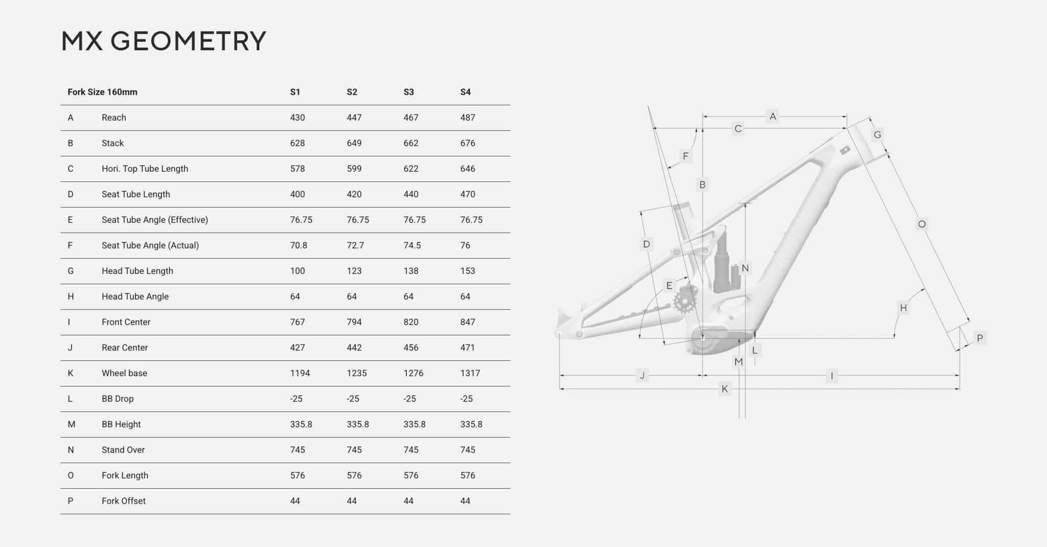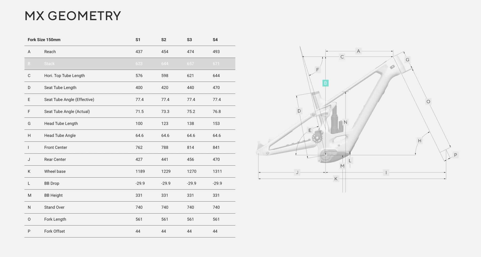 Le reach en taille S3 (équivalent L) affiche un reach de 667 mm (Core) ou 474 (Lite) et un stack de 662 mm (Core) ou 657 (Lite). L’angle de chasse est de 64° (Core) ou 64,5° (Lite).
