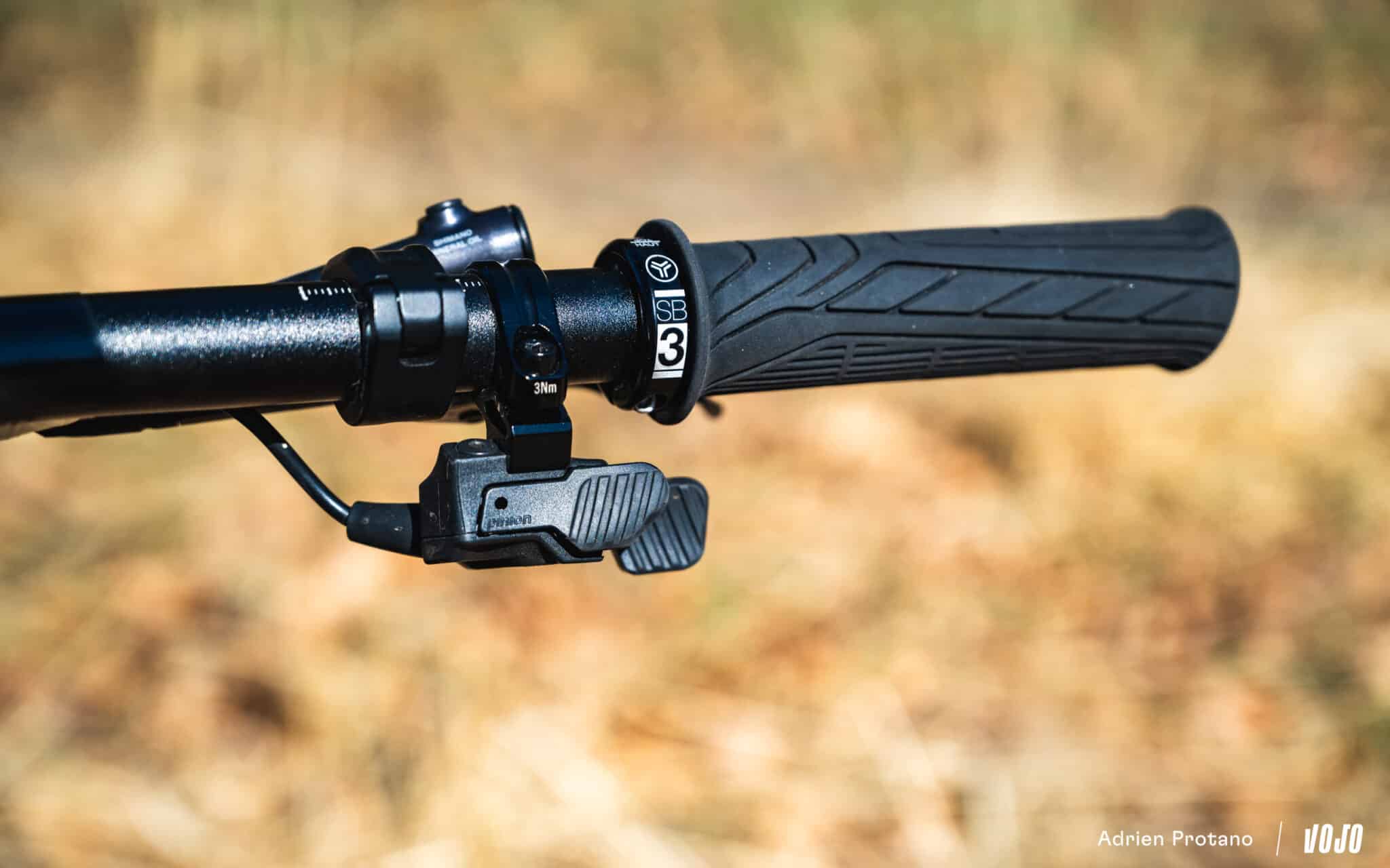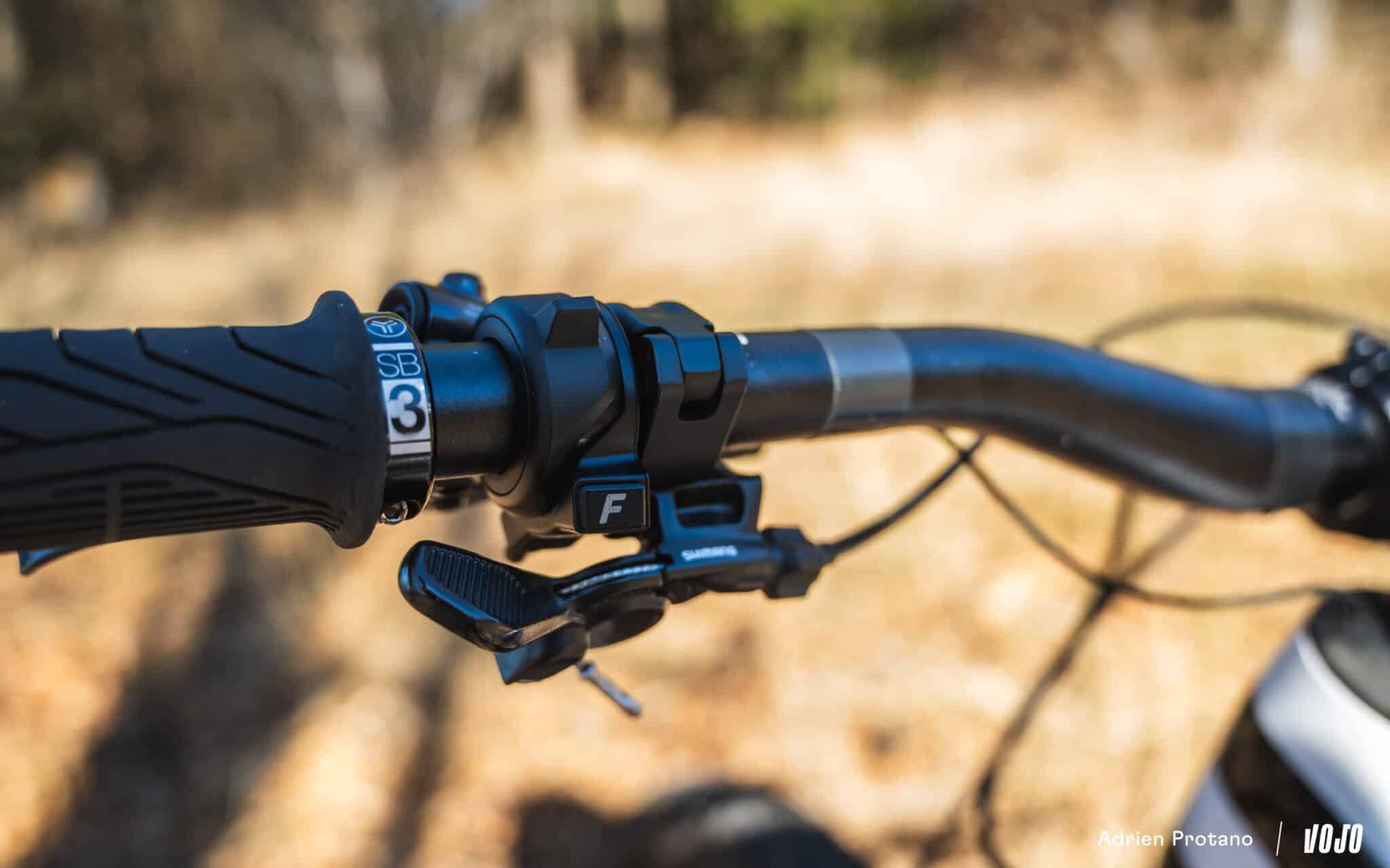 Le Pinion MGU est doté d’un très joli écran coloré intégré dans le tube supérieur, et se commande à l’aide d’un anneau qui rappelle celui de chez Fazua. Le petit bouton estampillé « F » que vous pouvez apercevoir sur le bas de la commande peut être configuré sur l’application smartphone de la marque pour en choisir sa fonction (mode boost, changement d’affichage sur l’écran…). Le passage des rapports s’effectue quant à lui au moyen d’une commande assez classique placée sur le côté droit du cintre.