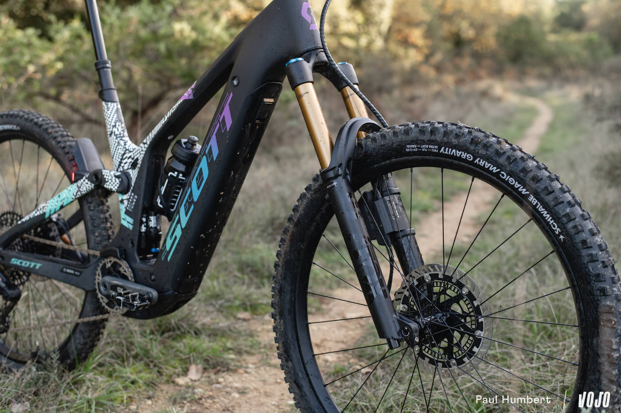 Le premier qu’on remarque, c’est l’arrivé de l’ABS Bosch sur les deux modèles haut de gamme. Dans un premier temps réfractaire, Andreas est aujourd’hui un des défenseurs du produit chez Scott. Avec la mise à jour « ABS Pro » sortie lors du renouvellement du moteur, il est « convaincu de l’intérêt de l’ABS. On a une limite de concentration possible à investir dans des décisions quand on roule, ça libère du temps de cerveau. Une gestion « traditionnelle » du freinage sera peut-être meilleure sur une spéciale, mais plus c’est long, plus on enchaîne, moins on est précis. L’ABS peut nous éviter des chutes idiotes. On peut freiner à fond et le système vient empêcher le blocage. Il faut prendre du temps pour faire confiance, mais Bosch annonce que l’ABS apporte une plus-value sur 50 % des rides et peut convenir à tout le monde. C’est vraiment convaincant. »