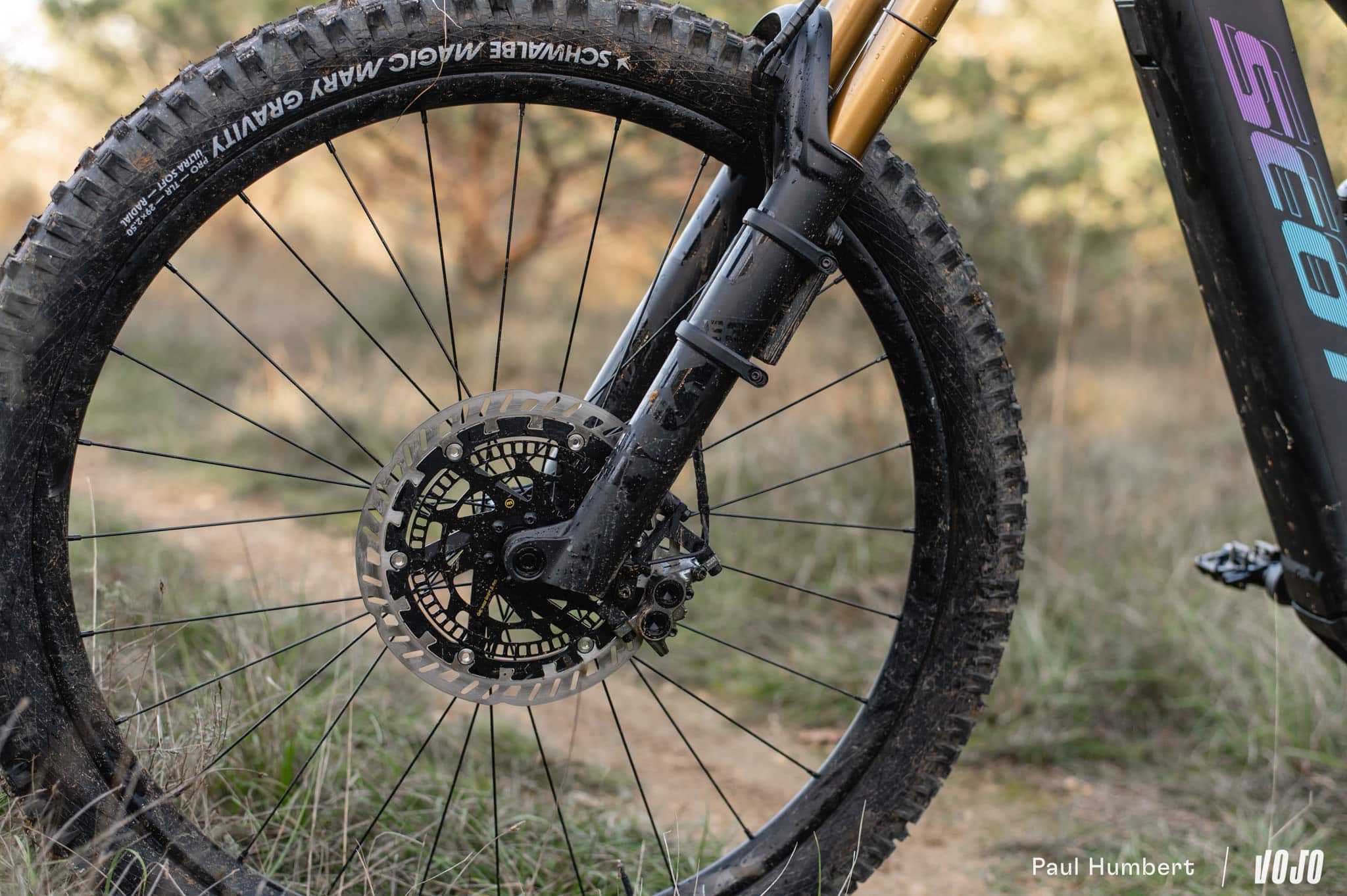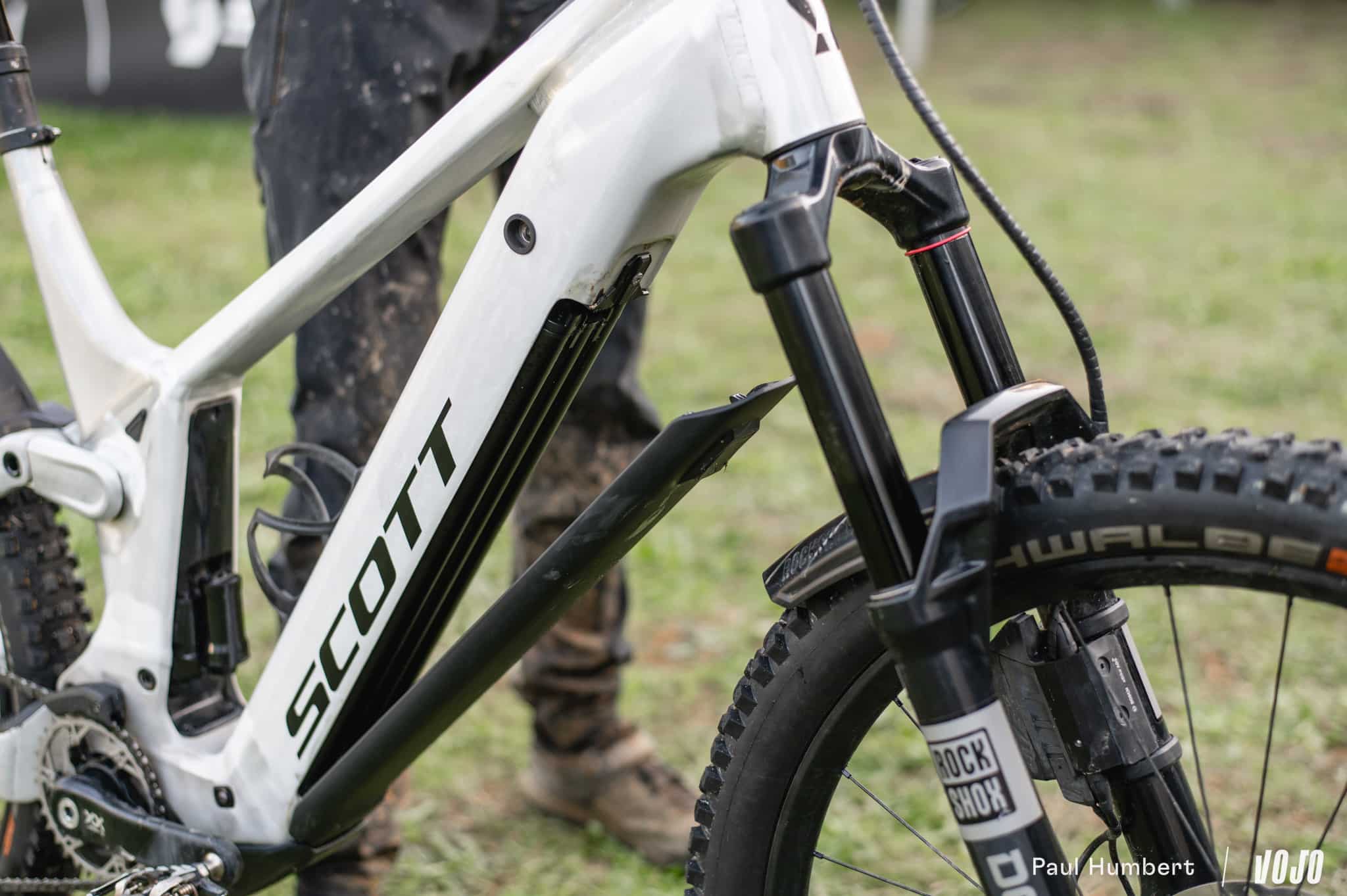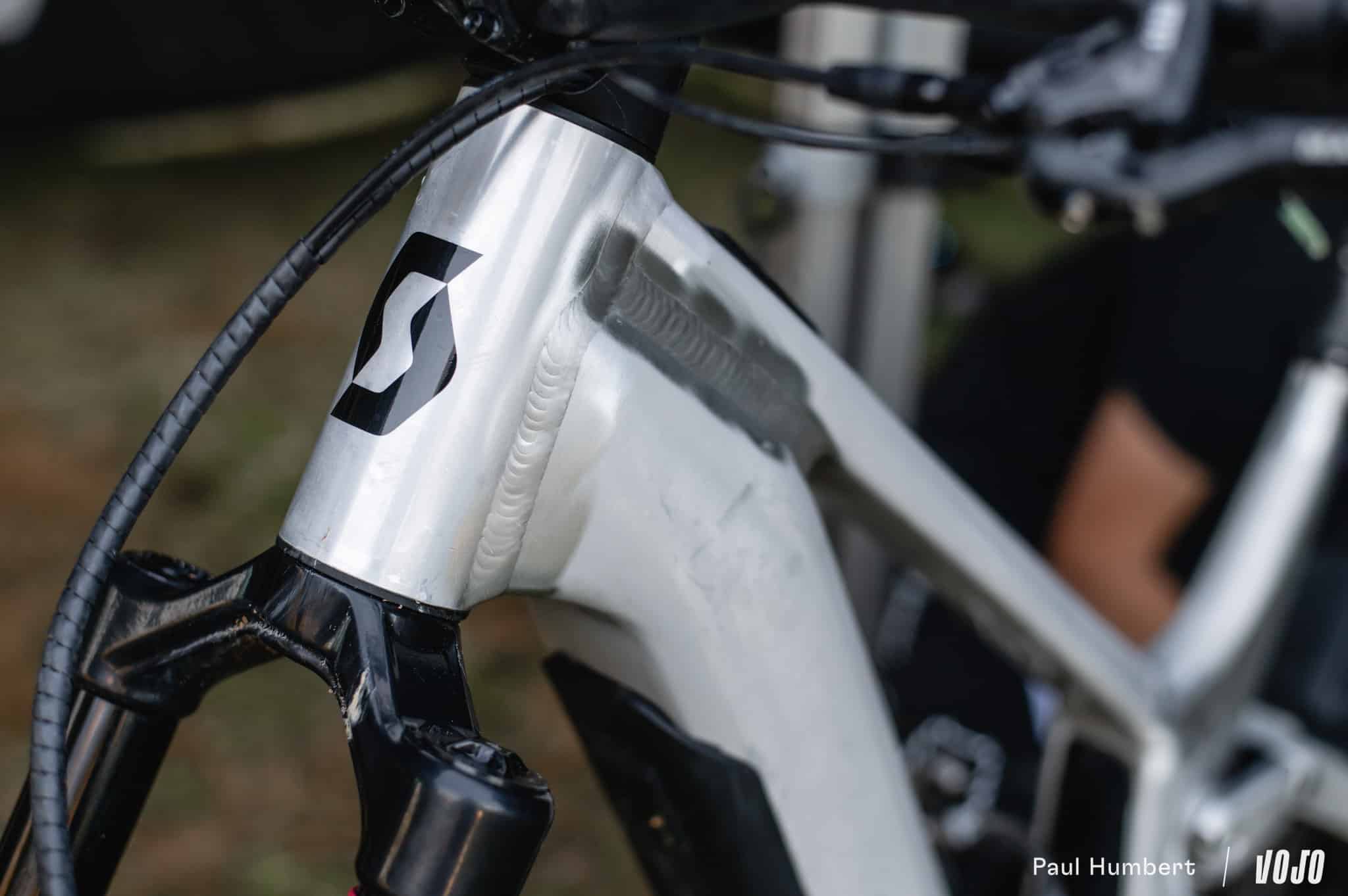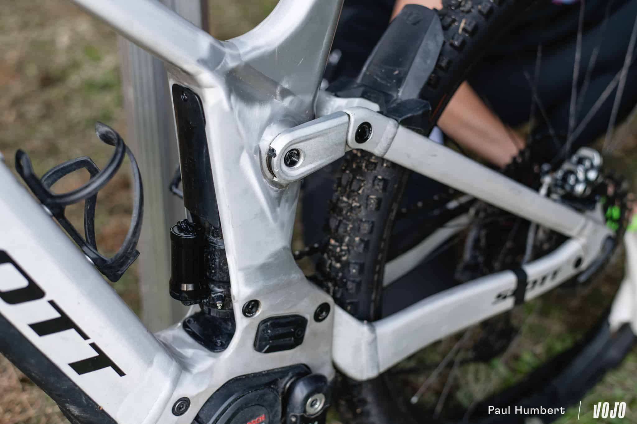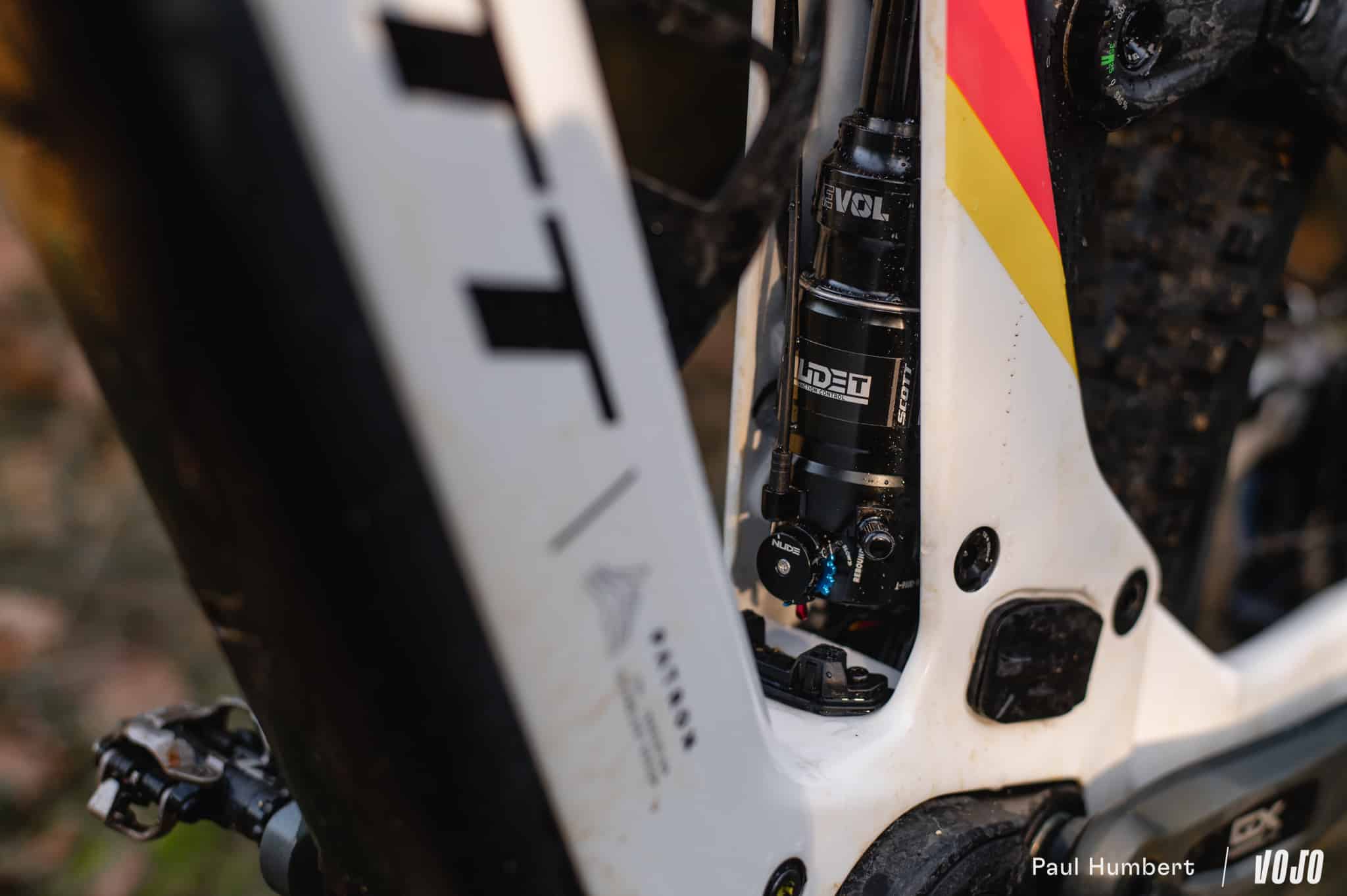L’intégration des amortisseurs permet d’assurer une protection supplémentaire pour ces derniers. Fox a d’ailleurs accepté de livrer Scott avec des roulements dans le pied de l’amortisseur si la marque garantissait une protection aux éléments.