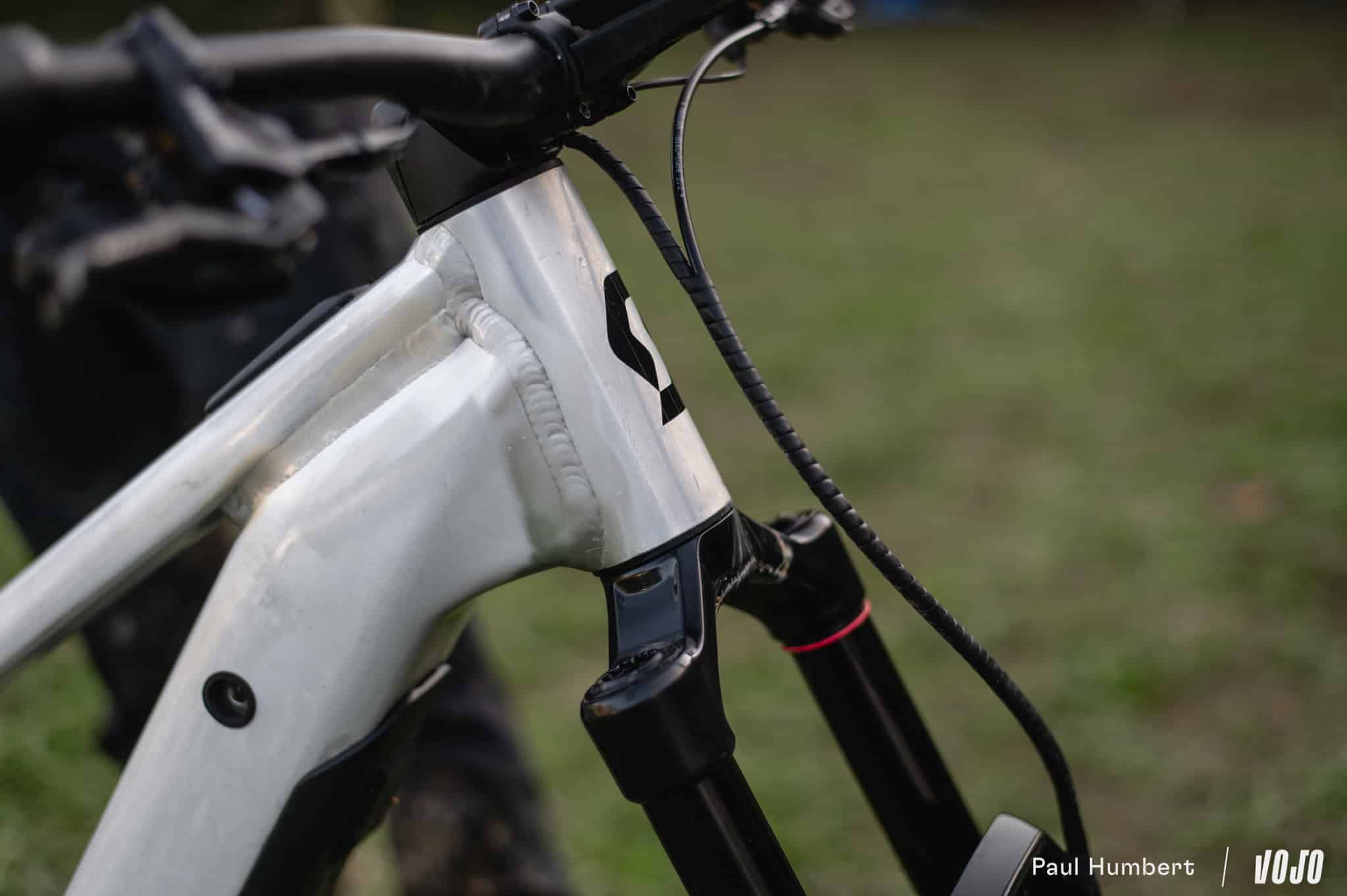 En partant d’une cinématique maîtrisée, il a fallu proposer un cadre robuste mais ouvert pour laisser la batterie accessible. La marque s’est reposée sur une nouvelle technique de positionnement du carbone sur un moule complet (et pas des portions comme par le passé) pour une meilleure constance en production. Et pour renforcer la rigidité du triangle avant, c’est au niveau de la jonction du tube supérieur et du tube inférieur que le travail est fait en ajoutant des renforts de carbone, ou d’aluminium.
