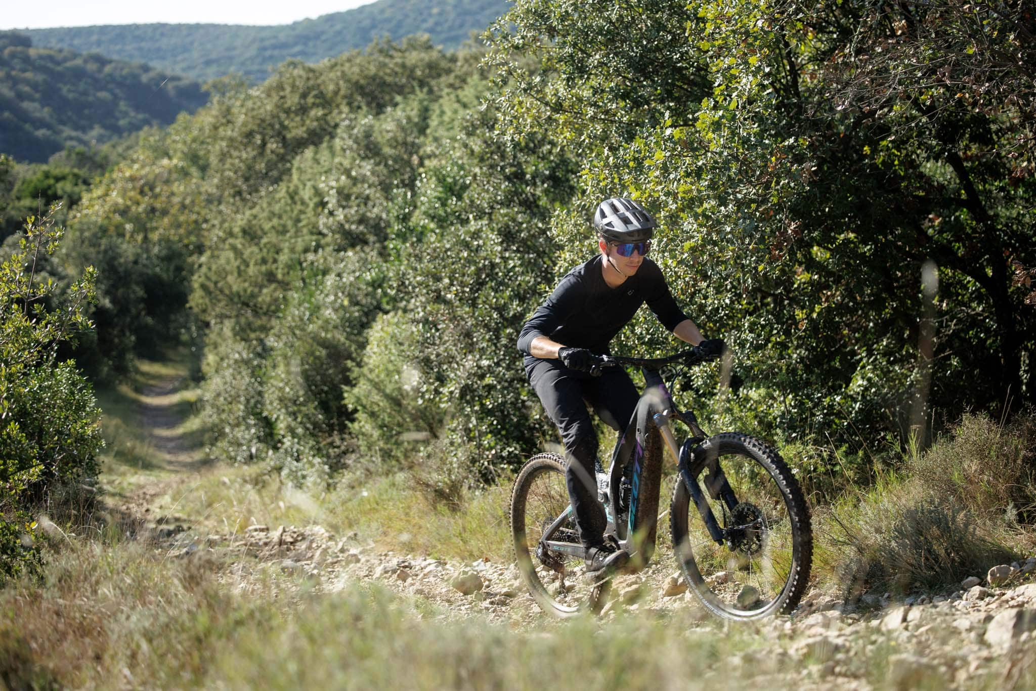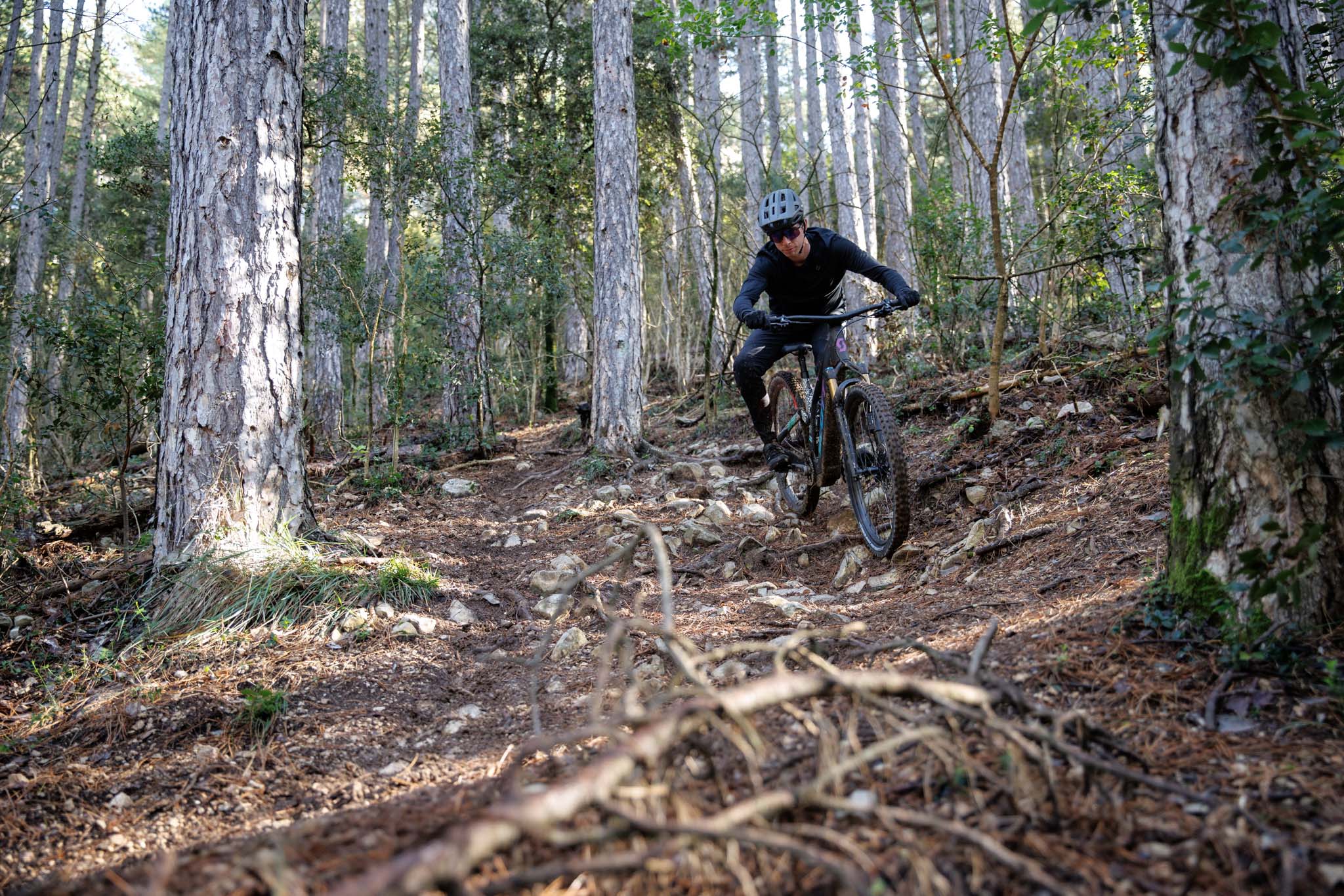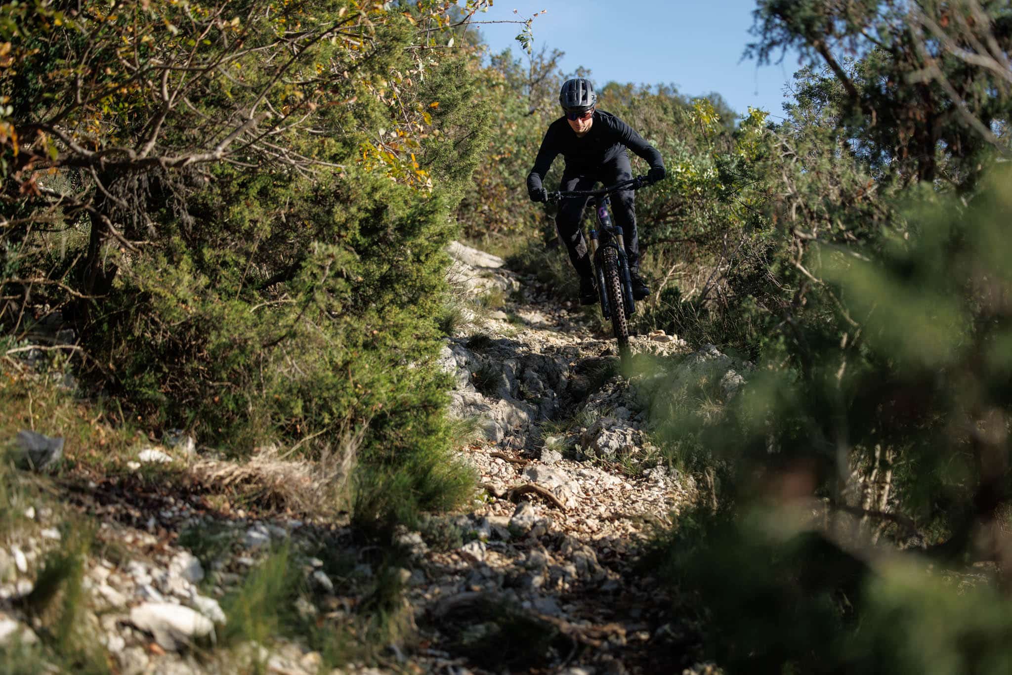 Le cadre à la rigidité bien dosée et cette belle plateforme de suspension apportent d’abord du confort et du grip, mais surtout une belle facilité de changement d’angle. On appuie légèrement sur les pédales et le vélo vire de bord sans sourciller. Dans les sentiers étroits et les pierriers ardéchois, c’est une qualité bienvenue.