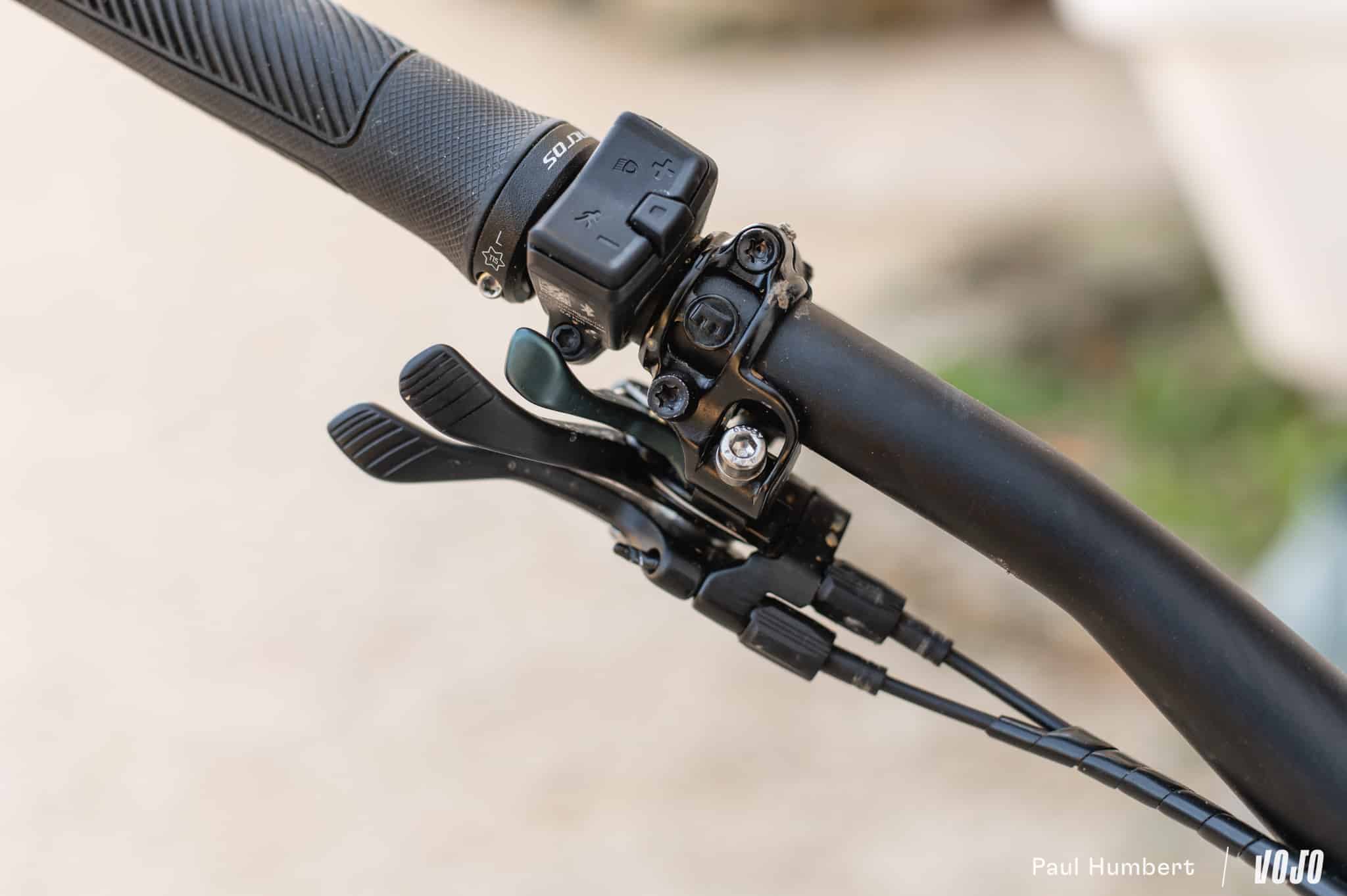 Sur les deux vélos, on retrouve la commande au guidon 3 positions « Tracloc » propre à Scott. Elle intervient uniquement sur l’amortisseur (quand la « Twinloc » intervient sur fourche et amortisseur sur d’autres vélos). On évolue entre un mode ouvert, un mode intermédiaire qui vient fermer une portion de la chambre d’air tout en travaillant librement dans un volume plus réduit, et un mode « bloqué ». Les « blocages » agissent différemment sur les deux vélos également : sur les 900, le vélo se bloque entièrement et sur les Patron ST, la compression est fermée, mais le verrouillage de l’amortisseur est moins radical.