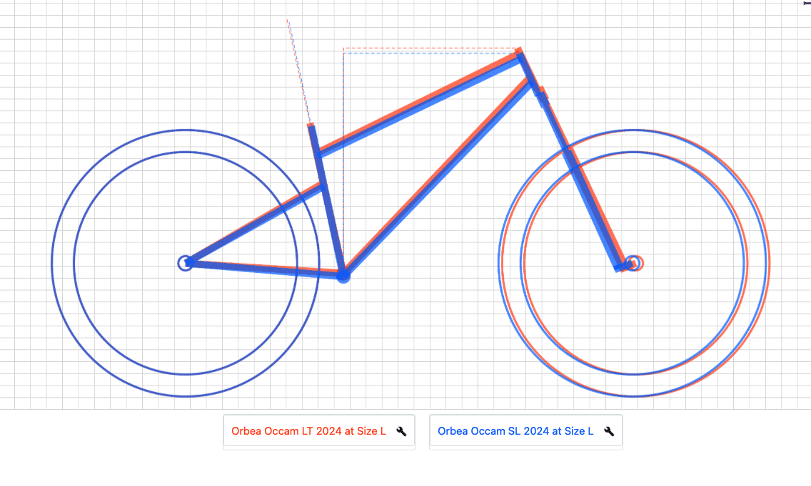 On l’a dit, l’Occam SL partage exactement le même cadre que la version LT. Pourtant, la différence de débattement (et le yoke différent de l’amortisseur) a pour conséquence de faire varier la géométrie entre les deux frères presque jumeaux. On le voit clairement sur cette illustration comparative (image du dessus), la version LT – en rouge – est plus haute et un peu plus courte que la version SL.