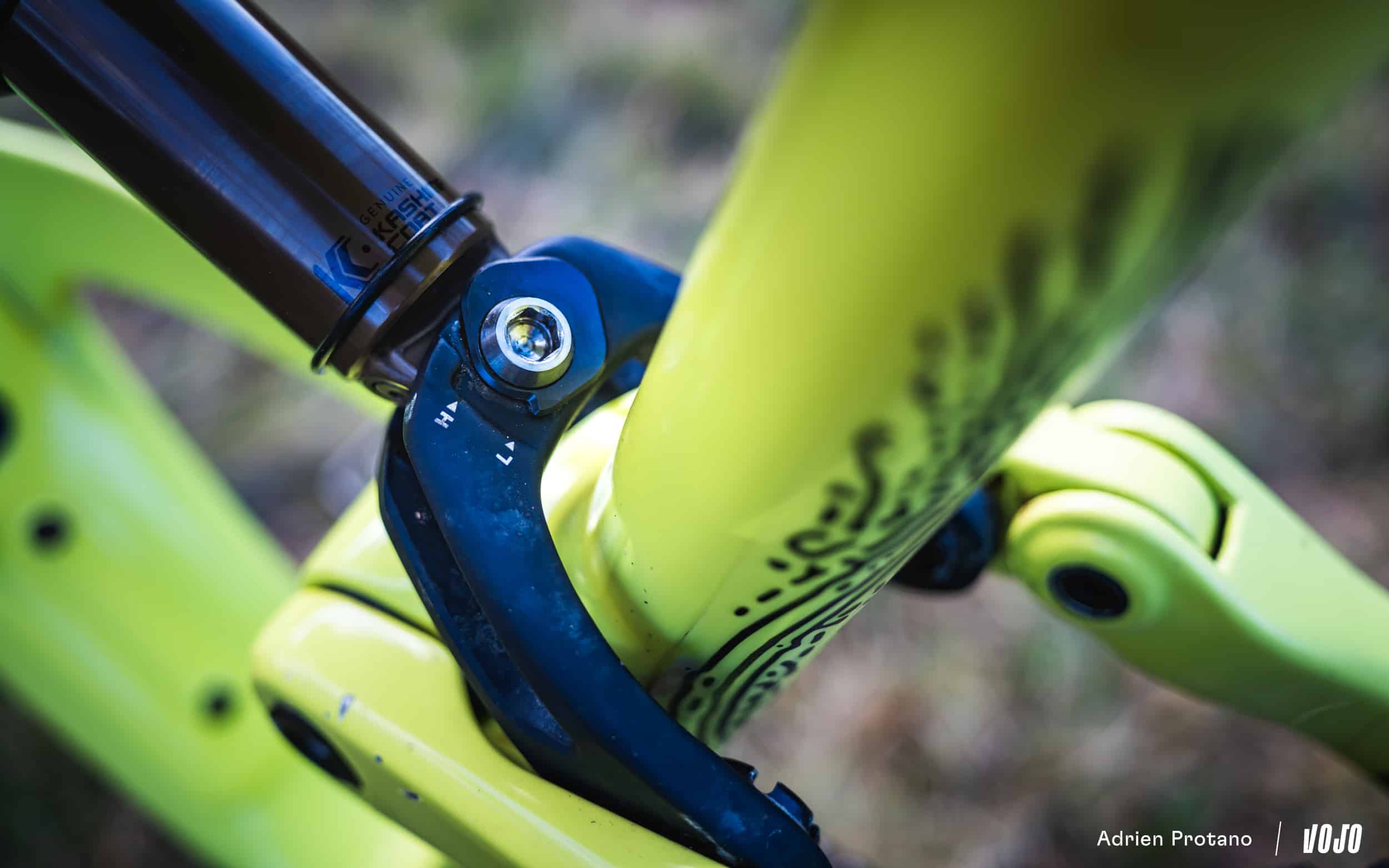 Pour permettre le passage à un plus grand débattement au niveau de la roue arrière tout en conservant un même et unique cadre, c’est au niveau du yoke de l’amortisseur que la magie opère.