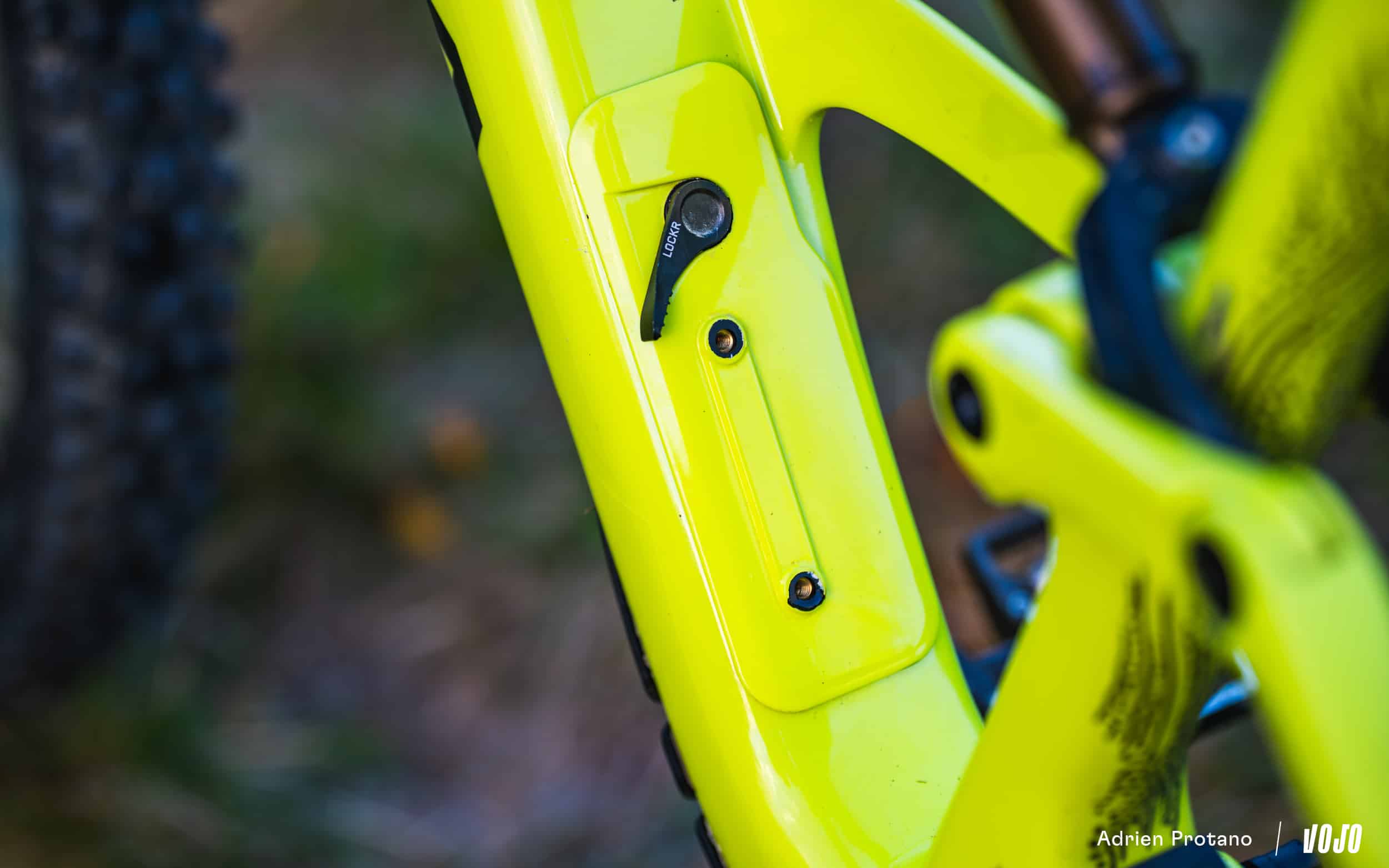 Les deux modèles sont également équipés d’une boîte à gant au sein du cadre. On notera aussi la présence de cet ingénieux multi-outils au niveau d’un des roulements du point de pivot supérieur, ou encore de la clé hexagonale de 6 mm présente dans le levier amovible de l’axe de roue arrière.