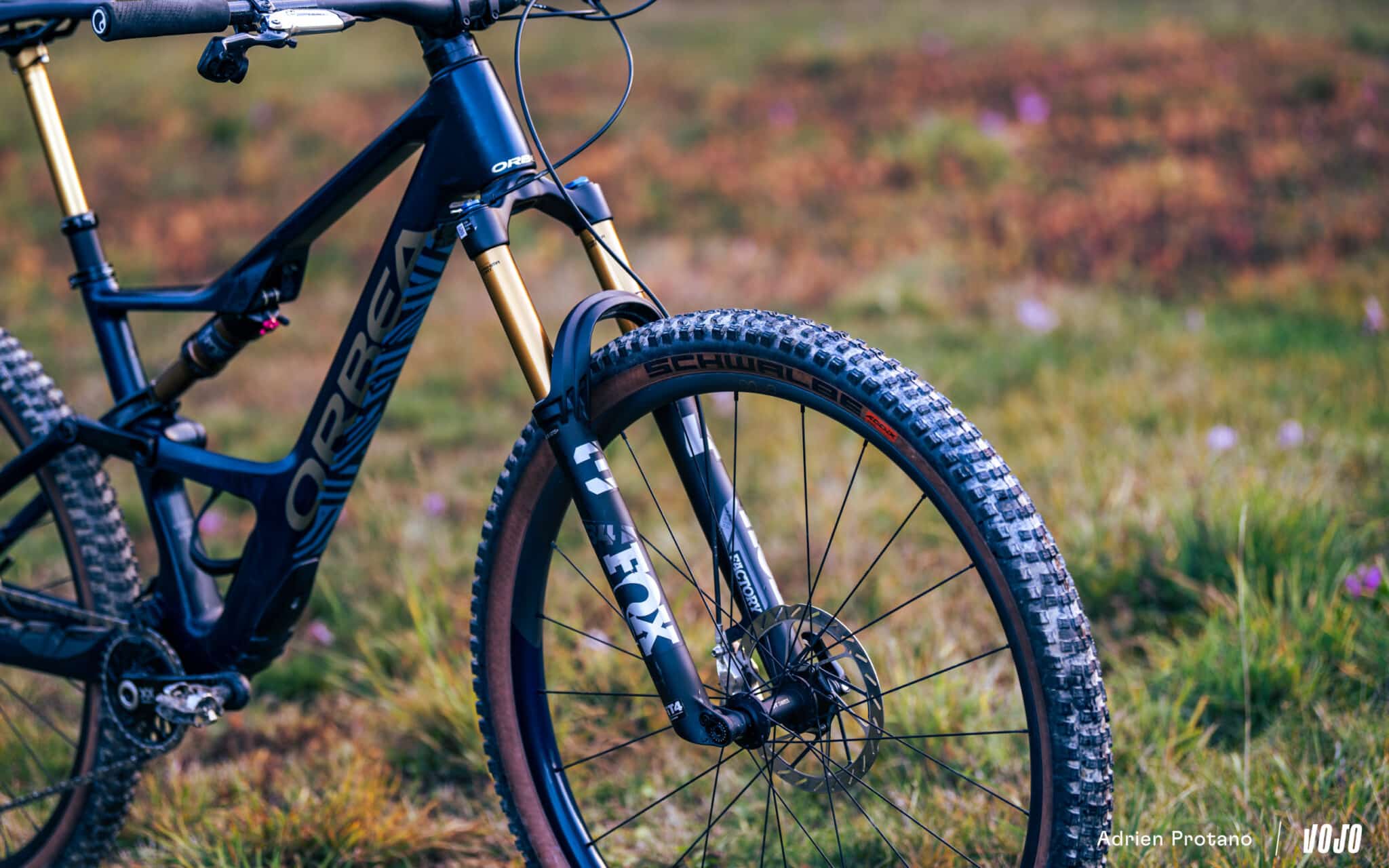 Le second facteur majeur de différenciation se trouve du côté du train roulant. Sur l’Occam SL, l’accent a été mis sur la légèreté et le dynamisme avec une paire de Oquo Performance MP30LTD, à savoir la paire de roues en carbone maison de chez Orbea. Celles-ci sont chaussées de pneumatiques Schwalbe Wicked Will Evo (2.4, Super Race, Speed Grip), à l’inspiration XC et très portés sur l’efficacité au pédalage.