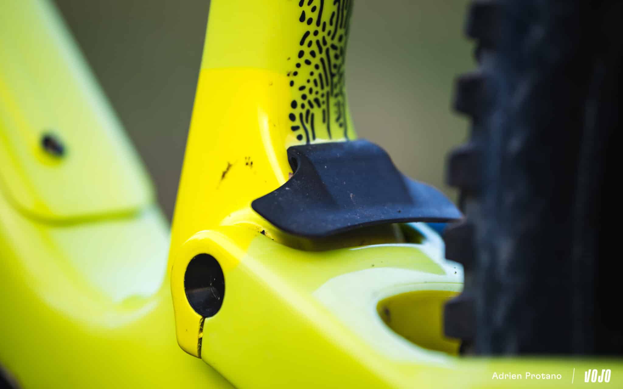 Comme sur le Oiz de la marque, Orbea a fait le choix de masquer complètement le câble de blocage de l’amortisseur en le faisant passer dans le tube supérieur.