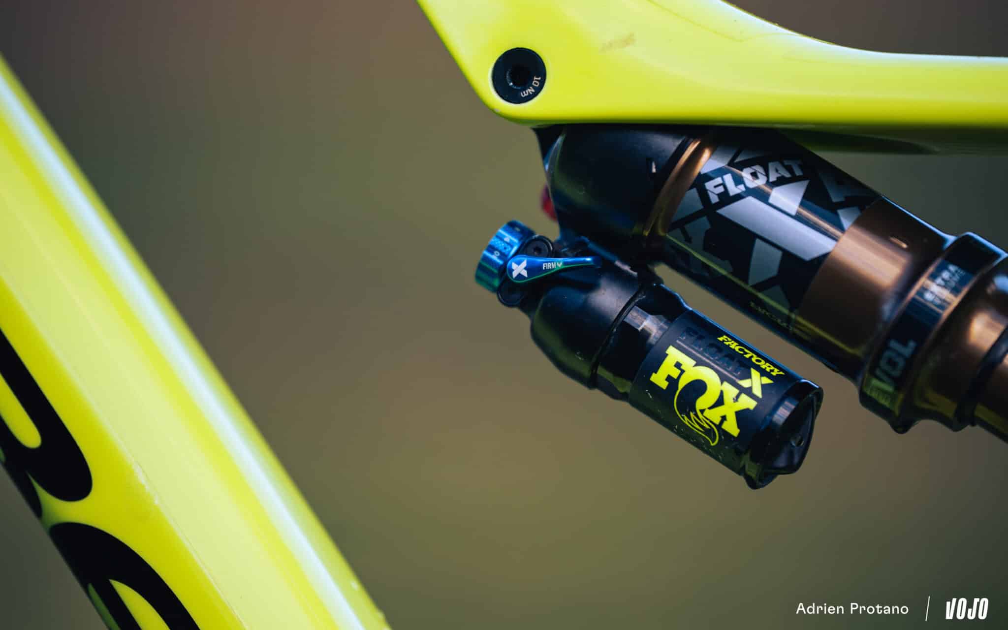Si la version SL bénéfice d’une pièce en composite, l’Occam LT accueille un plus « gros » débattement grâce à l’utilisation d’un yoke différent, et cette fois en aluminium. Pour notre version d’essai, c’est Fox qui est aux commandes des suspensions avec un duo Float 36 Grip2 Factory et Float X Factory. On notera qu’il est possible de faire le choix du ressort hélicoïdal sur cet Occam LT, ce qui avait davantage plu à Léo lors de sa prise en main (cf. Test nouveauté | Orbea Occam 5 : deux vélos pour une troisième voie).
