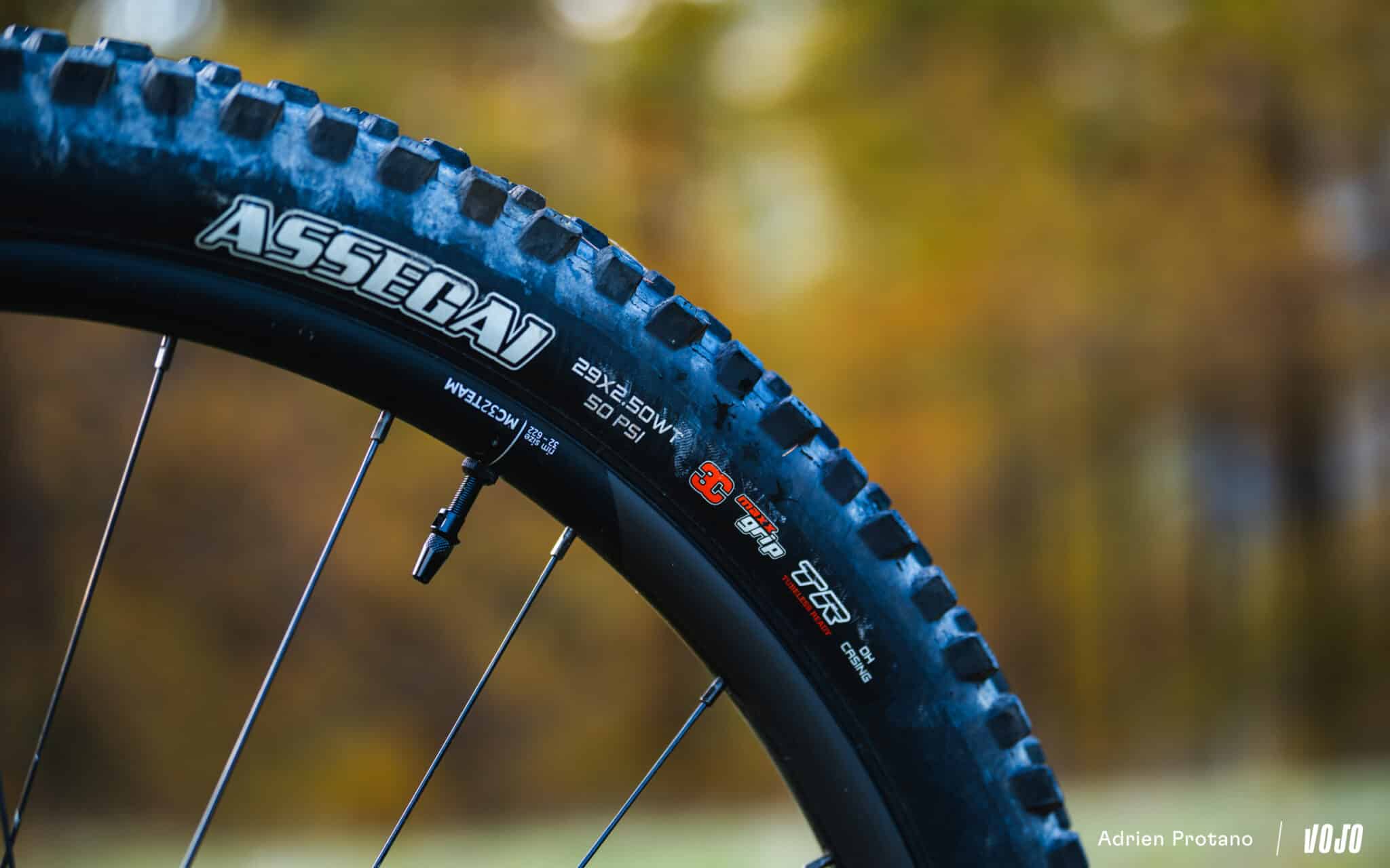 La version LT est quant à elle équipée d’un train roulant qui se veut plus orienté montagne avec des roues plus robustes et des pneus plus cramponnés. C’est ainsi une paire de roues maison Oquo Mountain Control MC32TEAM en aluminium, ainsi qu’une paire de Minion DHR II à l’arrière (2.4, carcasse DH, 3C Maxxgrip), et Assegai à l’avant (2.5, carcasse DH, 3C Maxxgrip) que l’on retrouve. On notera toutefois que ce combo de pneus à la carcasse renforcée est une option offerte sur le configurateur en ligne de la marque (moyennant un supplément de 39€), c’est normalement un duo de Maxxis Dissector en 2.4 et carcasse EXO que l’on retrouve… La carcasse EXO+ aurait toutefois été plus pertinente à notre sens.