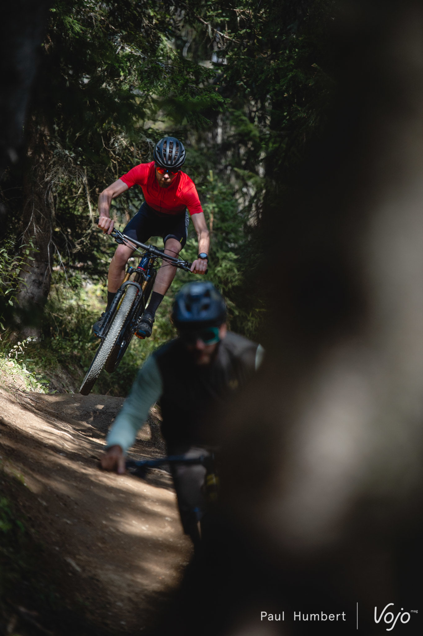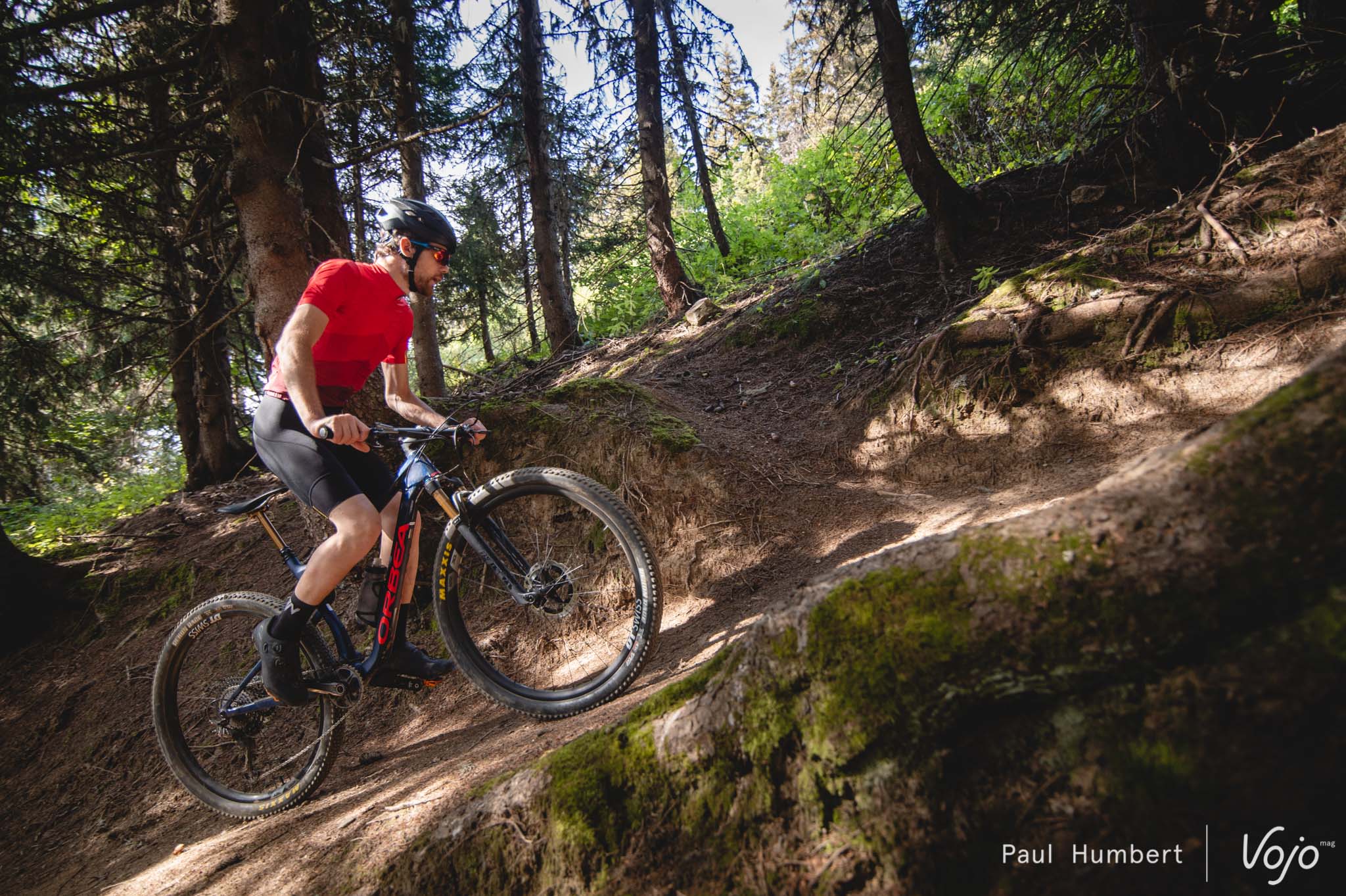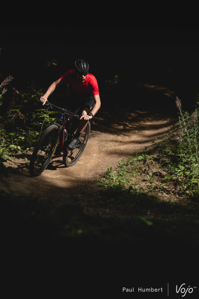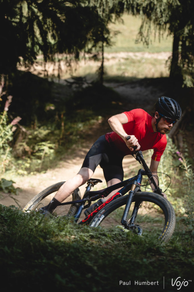 A ce sujet, on apprécie la présence d’un mode « intermédiaire » où l’amortisseur reste fermé (pas complètement verrouillé, ce qui permet d’avoir une petite marge de sécurité) mais la fourche est ouverte. On se retrouve plus ou moins avec un semi-rigide, où l’avant est capable d’encaisser les chocs sans déstabiliser le pilote tandis que l’arrière offre un bon rendement, avec une once de grip en plus par rapport à un véritable semi-rigide. C’est quelque chose qui nous avait manqué sur les premières versions (qui n’avaient que deux positions, tout ouvert et tout fermé) et c’est clairement le mode sur lequel nous avons passé le plus de temps, ne revenant sur le tout ouvert que pour les descentes ou les sections réellement techniques en montée.
