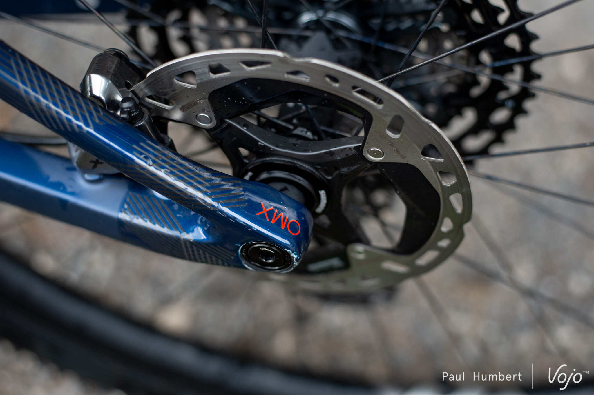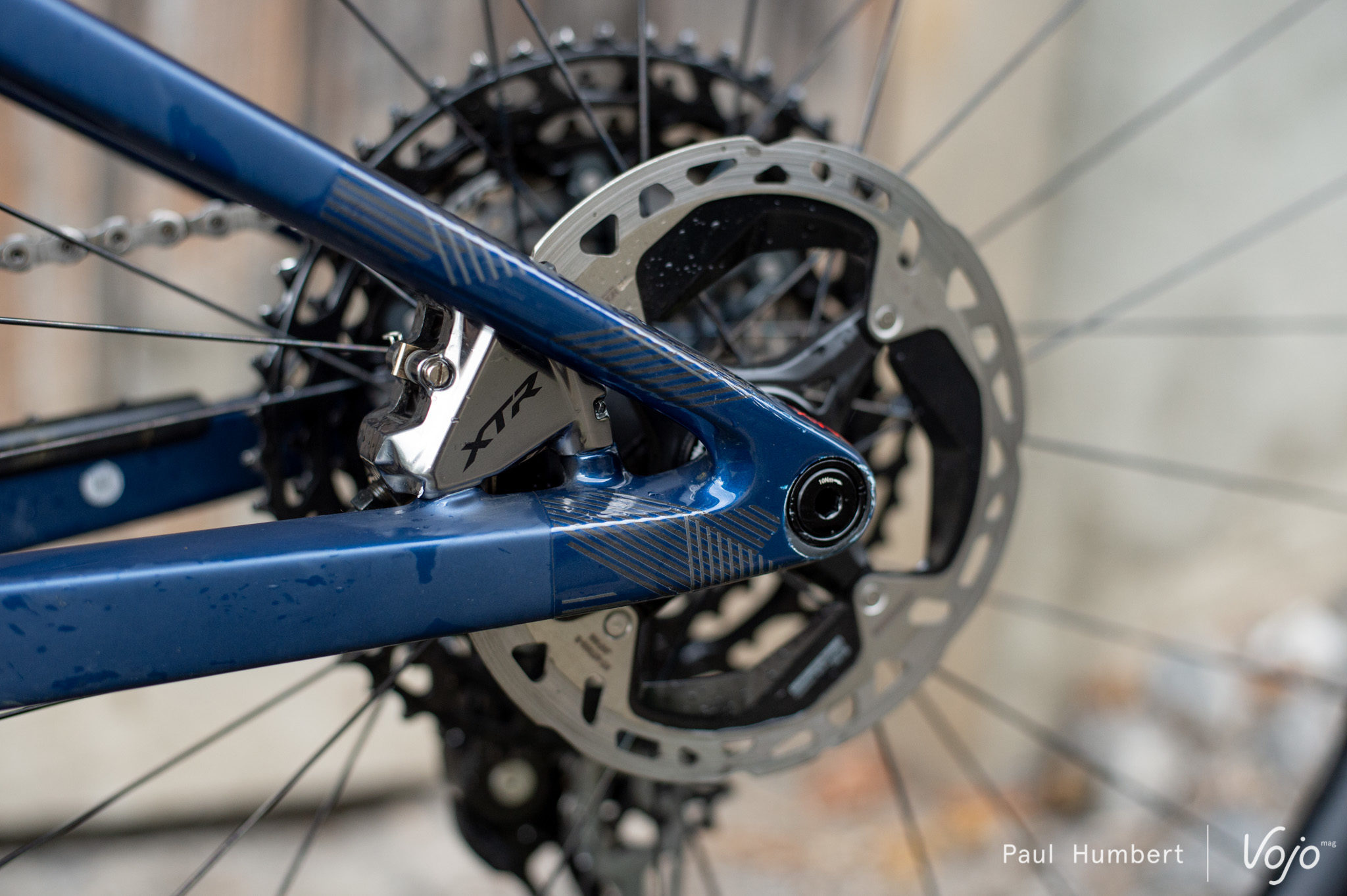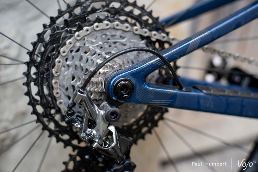 Les roues sont les toutes nouvelles DT Swiss XRC 1501 en carbone en 30 mm de largeur interne, les remplaçantes des célèbres XR1501 en aluminium très populaires en première monte pour du milieu/haut de gamme. Elles sont chaussées de pneus Maxxis Rekon Race en section de 2,35″ et carcasse 120 tpi EXO. On remarque au passage que le souci du poids a été poussé jusqu’à l’axe de roue arrière, affiné au centre pour gagner quelques grammes.