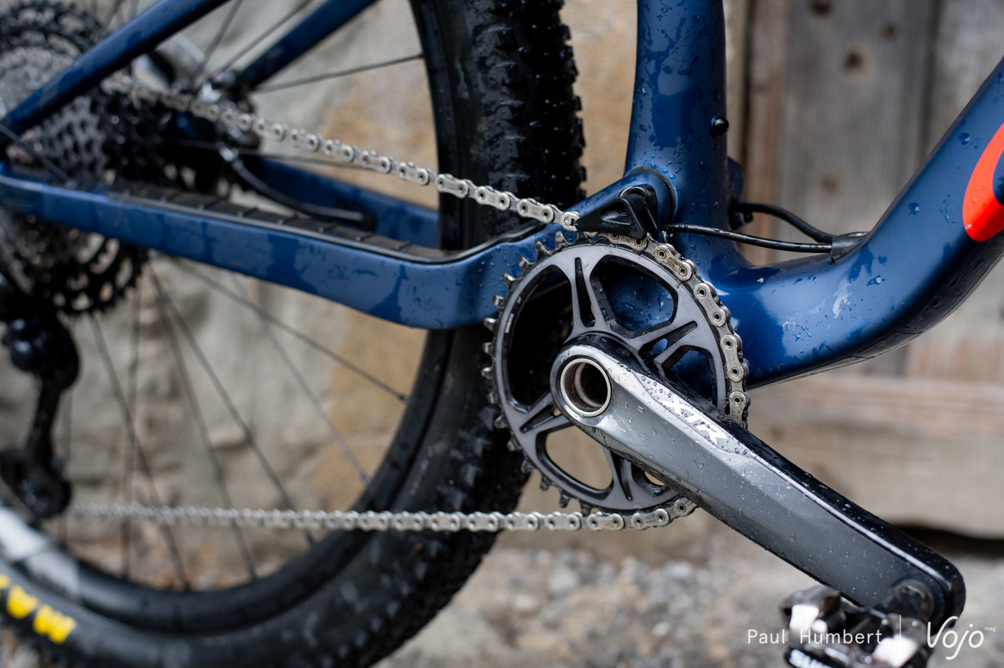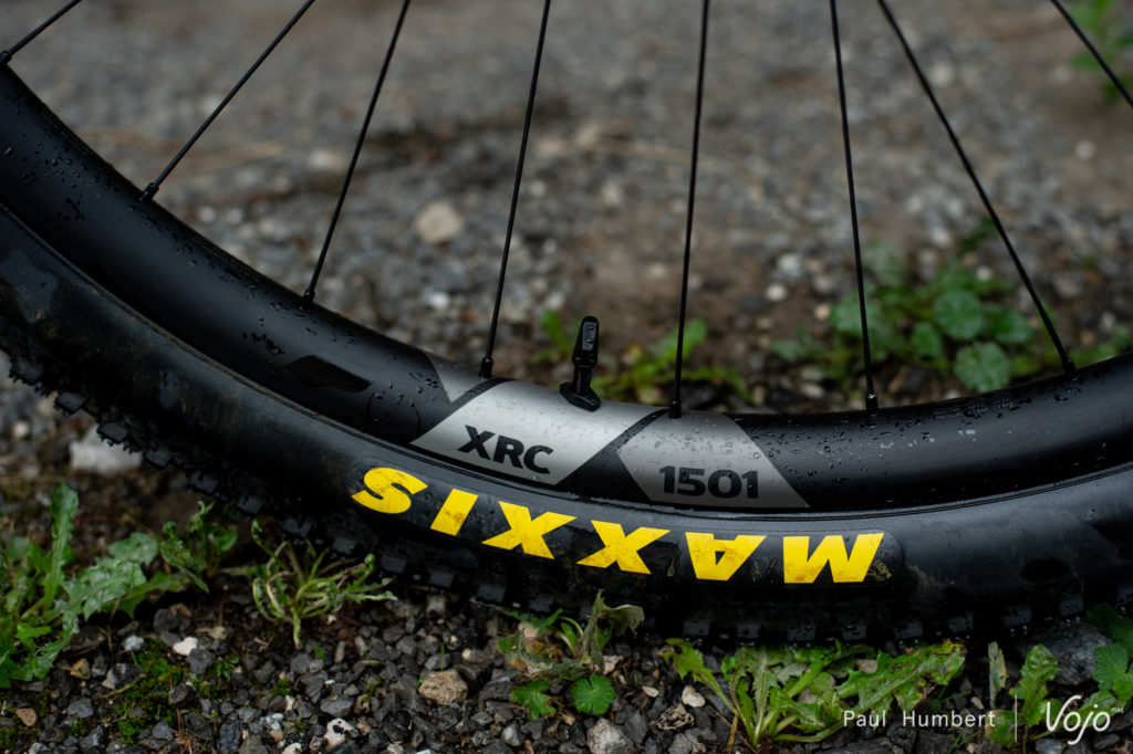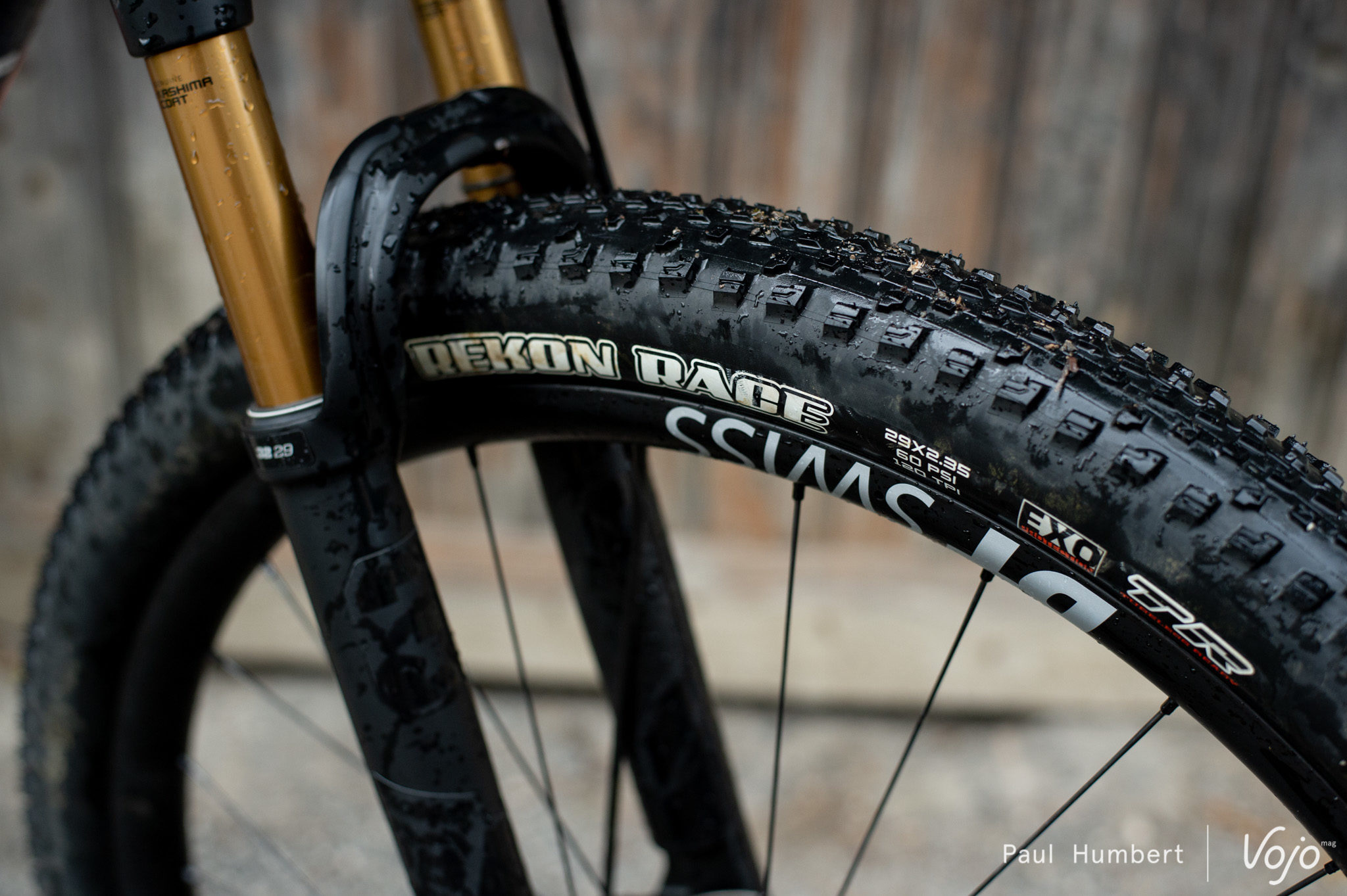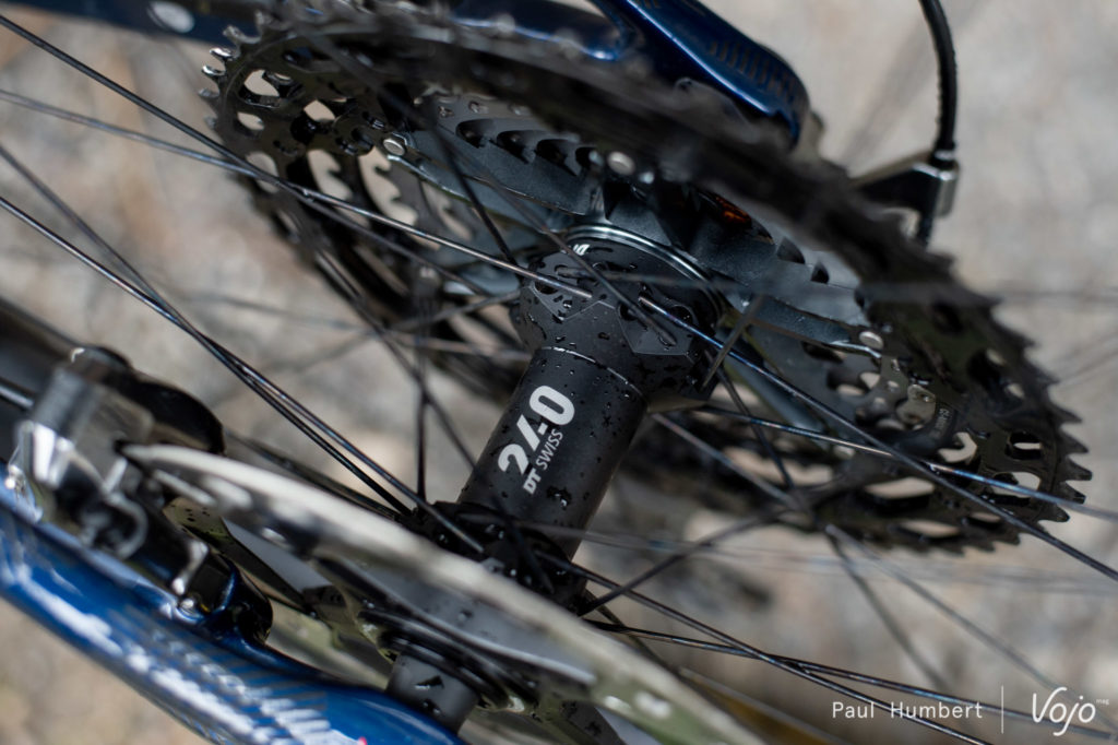 Les roues sont les toutes nouvelles DT Swiss XRC 1501 en carbone en 30 mm de largeur interne, les remplaçantes des célèbres XR1501 en aluminium très populaires en première monte pour du milieu/haut de gamme. Elles sont chaussées de pneus Maxxis Rekon Race en section de 2,35″ et carcasse 120 tpi EXO. On remarque au passage que le souci du poids a été poussé jusqu’à l’axe de roue arrière, affiné au centre pour gagner quelques grammes.