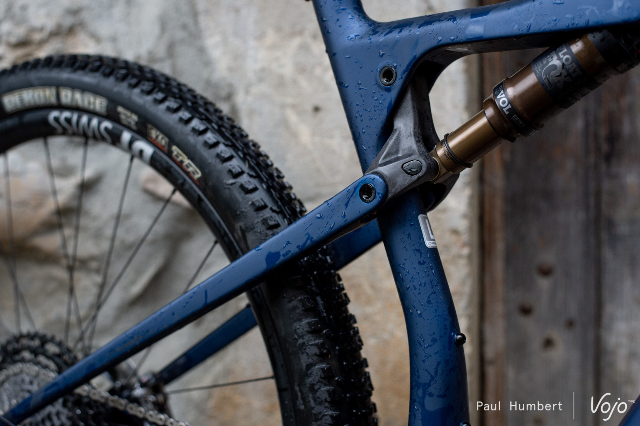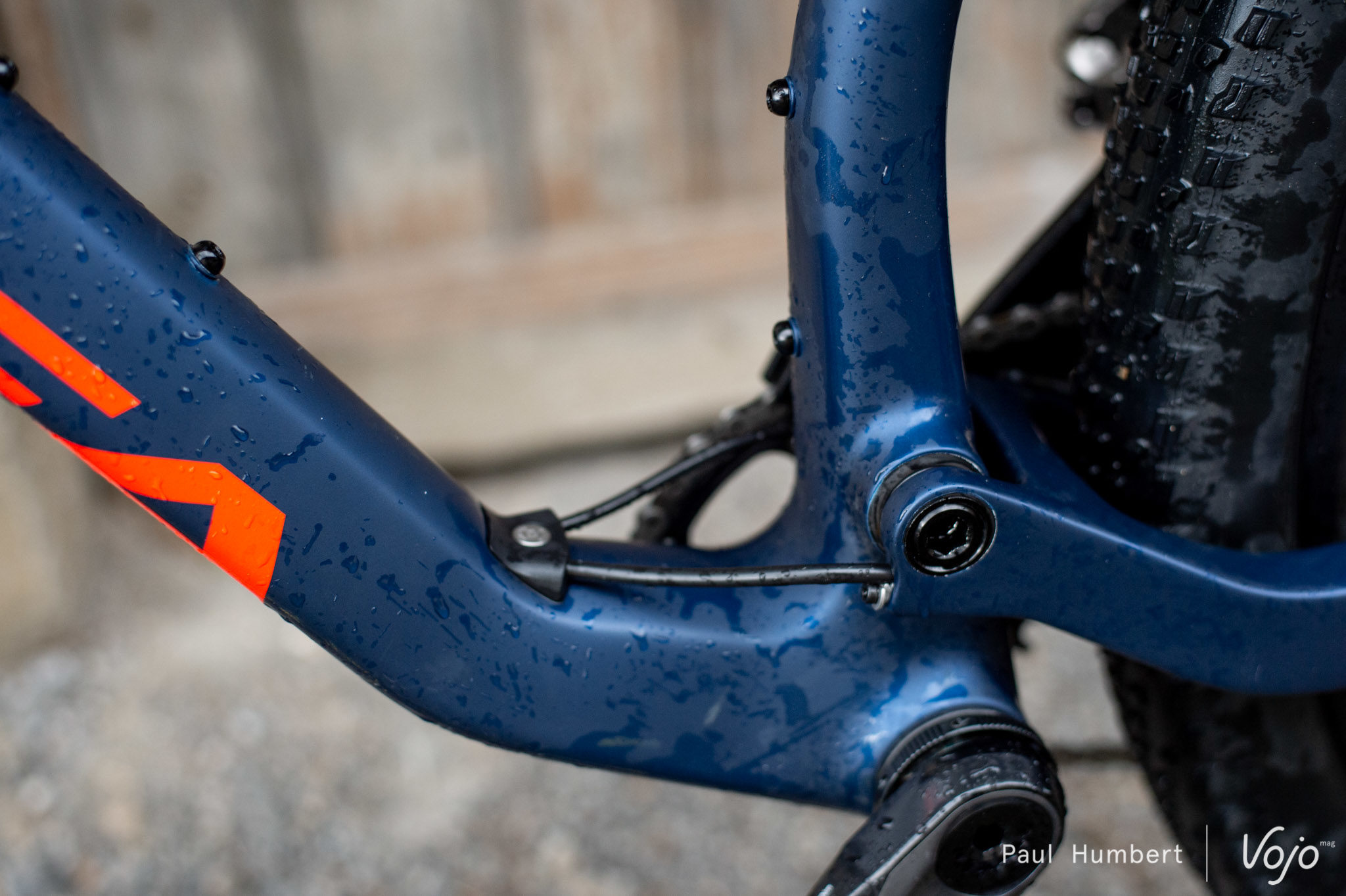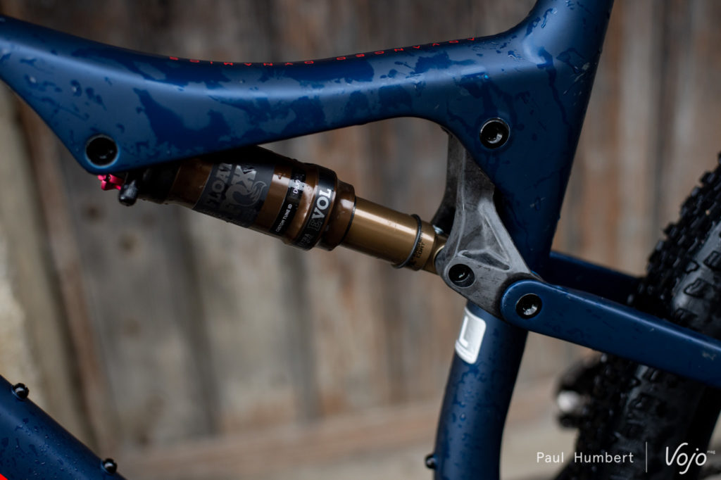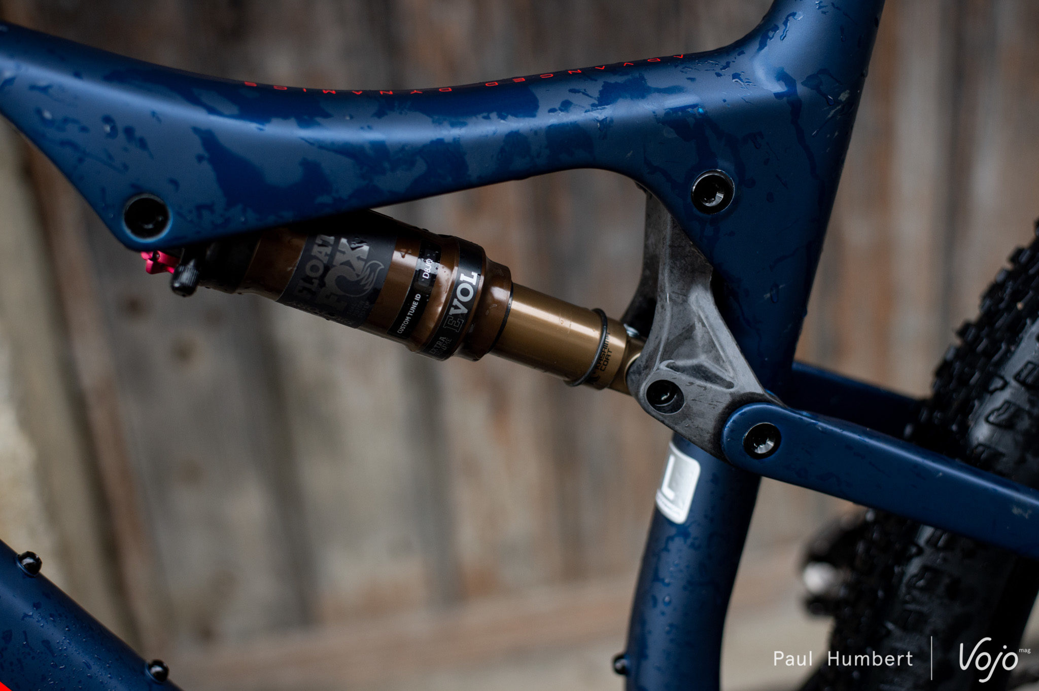Notre modèle est une version « XC », avec un amortisseur en 190×40 qui permet à la suspension de développer 100 mm de débattement, comme à l’avant. Sur notre modèle haut de gamme, c’est Fox qui s’occupe de gérer tout ça avec un amortisseur spécifique au cadre, le I-Line DPS Factory (rebond et compression identiques à un DPS classique mais tête et système de blocage différent pour réduire l’encombrement) et la bien connue 32 Stepcast Factory devant.
