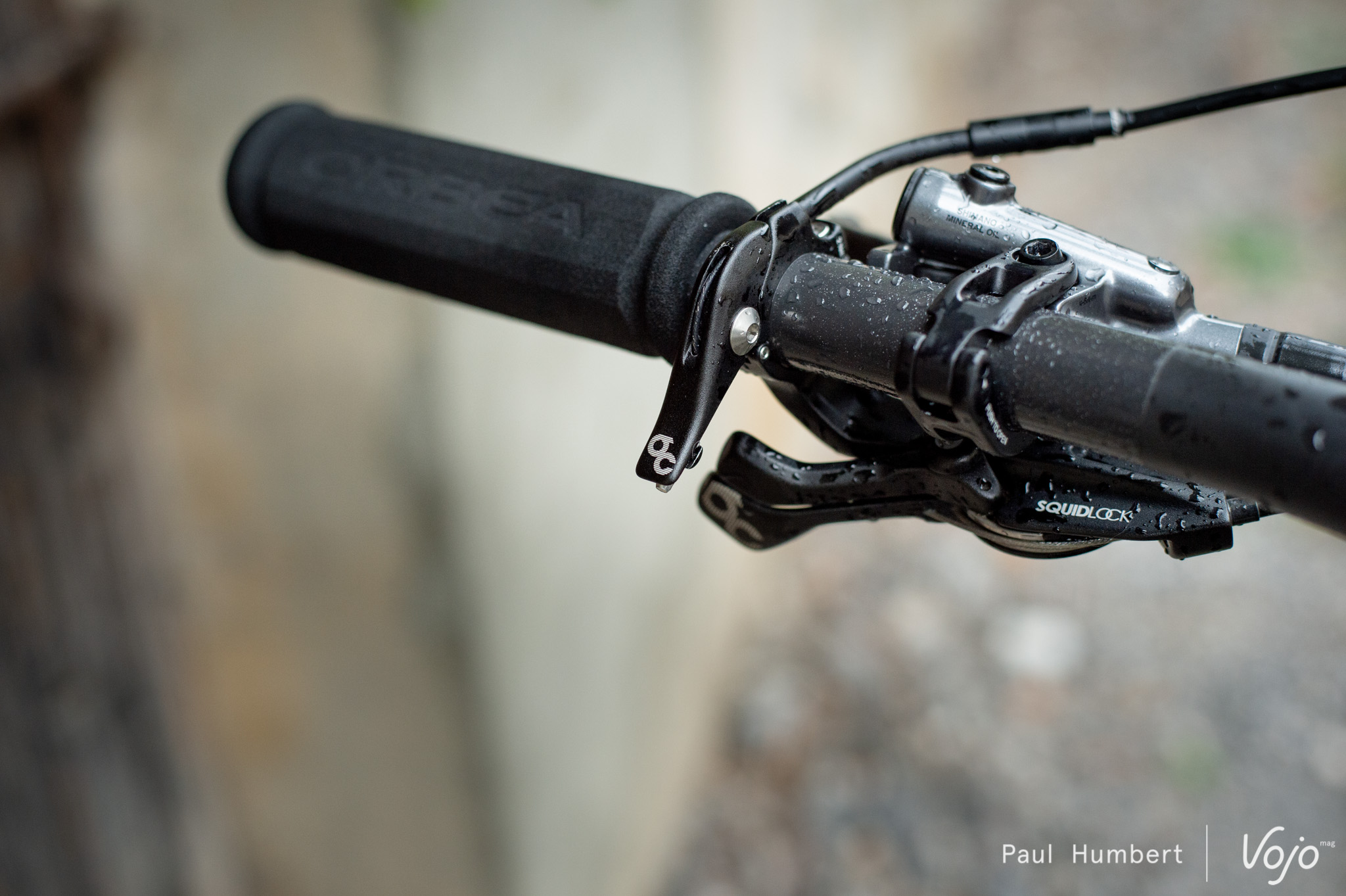 Fourche et amortisseur sont commandé simultanément par ce petit blocage Orbea SquidLock à trois positions dont la forme rappelle beaucoup le bien connu Scott Twinlock. Petite subtilité sur ce modèle, le fonctionnement est « inversé » : lorsque le câble est détendu et le levier principal en position de départ, tout est bloqué. Il faut pousser une première fois sur le levier pour passer en mode intermédiaire, puis pousser à nouveau dessus pour ouvrir entièrement les suspensions.