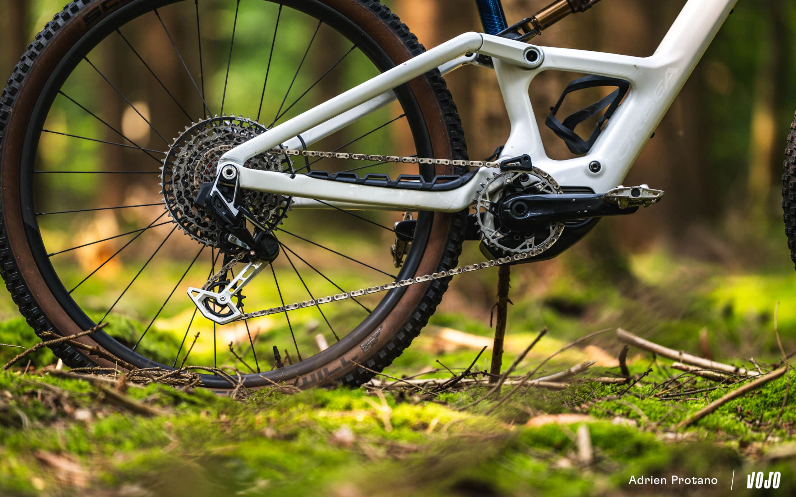 La transmission est une Sram XX T-Type, avec un plateau de 34 dents et une cassette 10-52. Pour plus d’infos sur cette excellente transmission électronique, c’est par ici : Test | Sram Eagle AXS 2023 : sans égal.