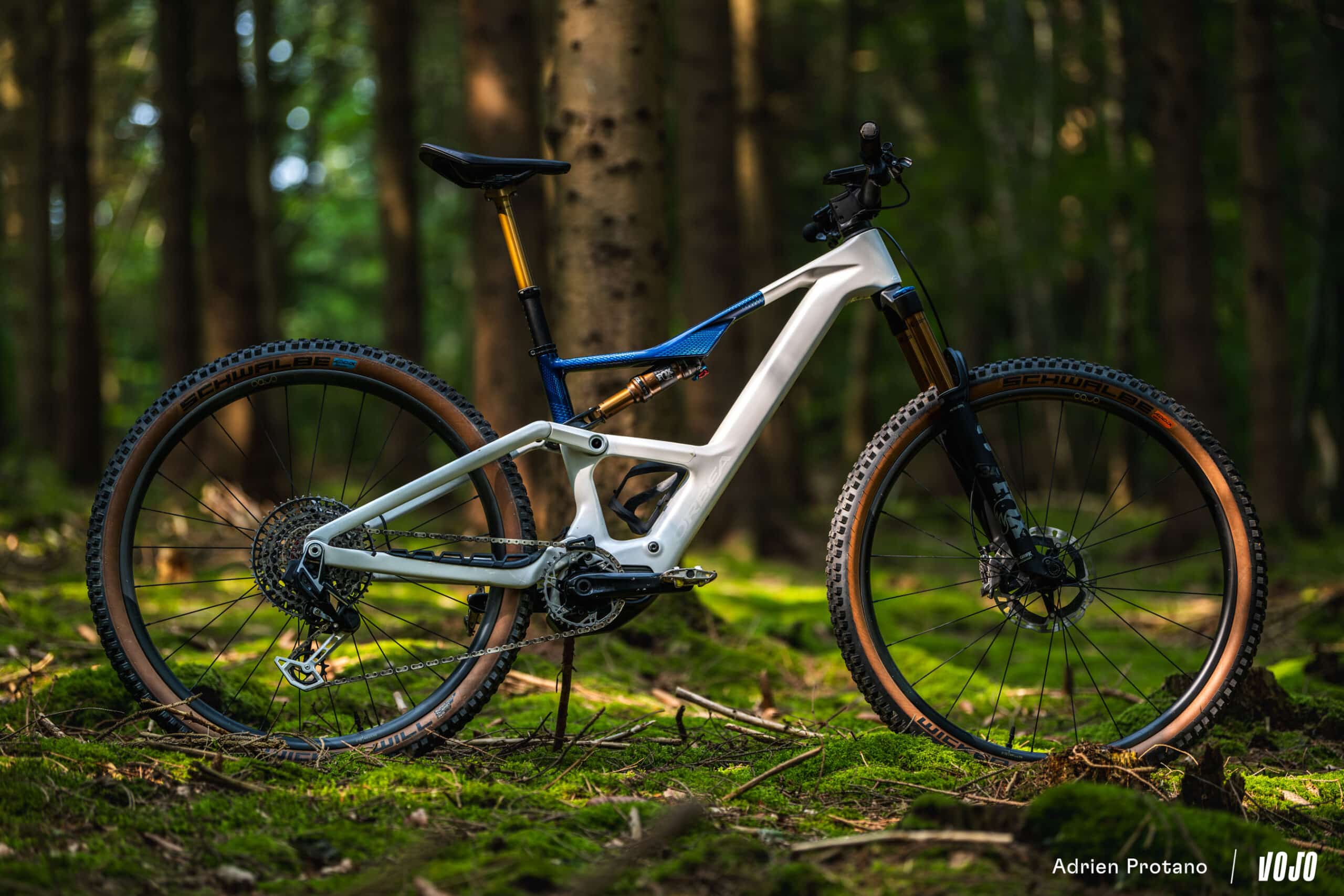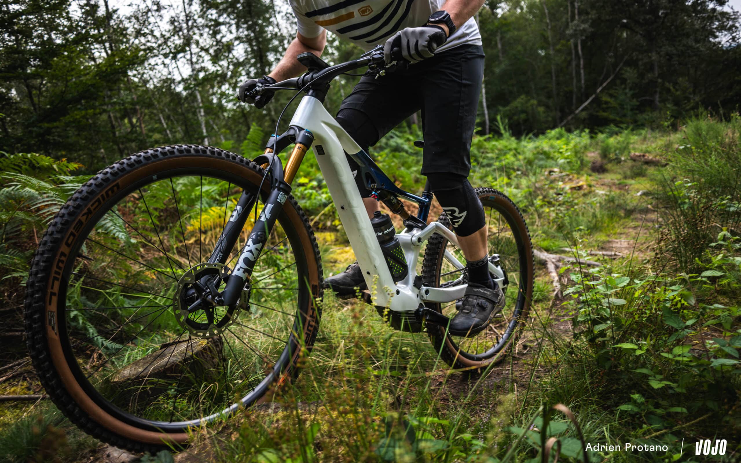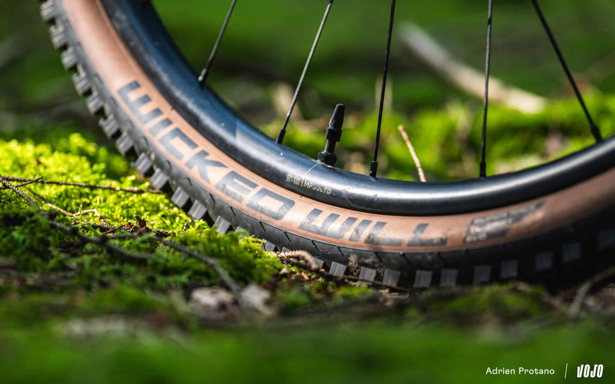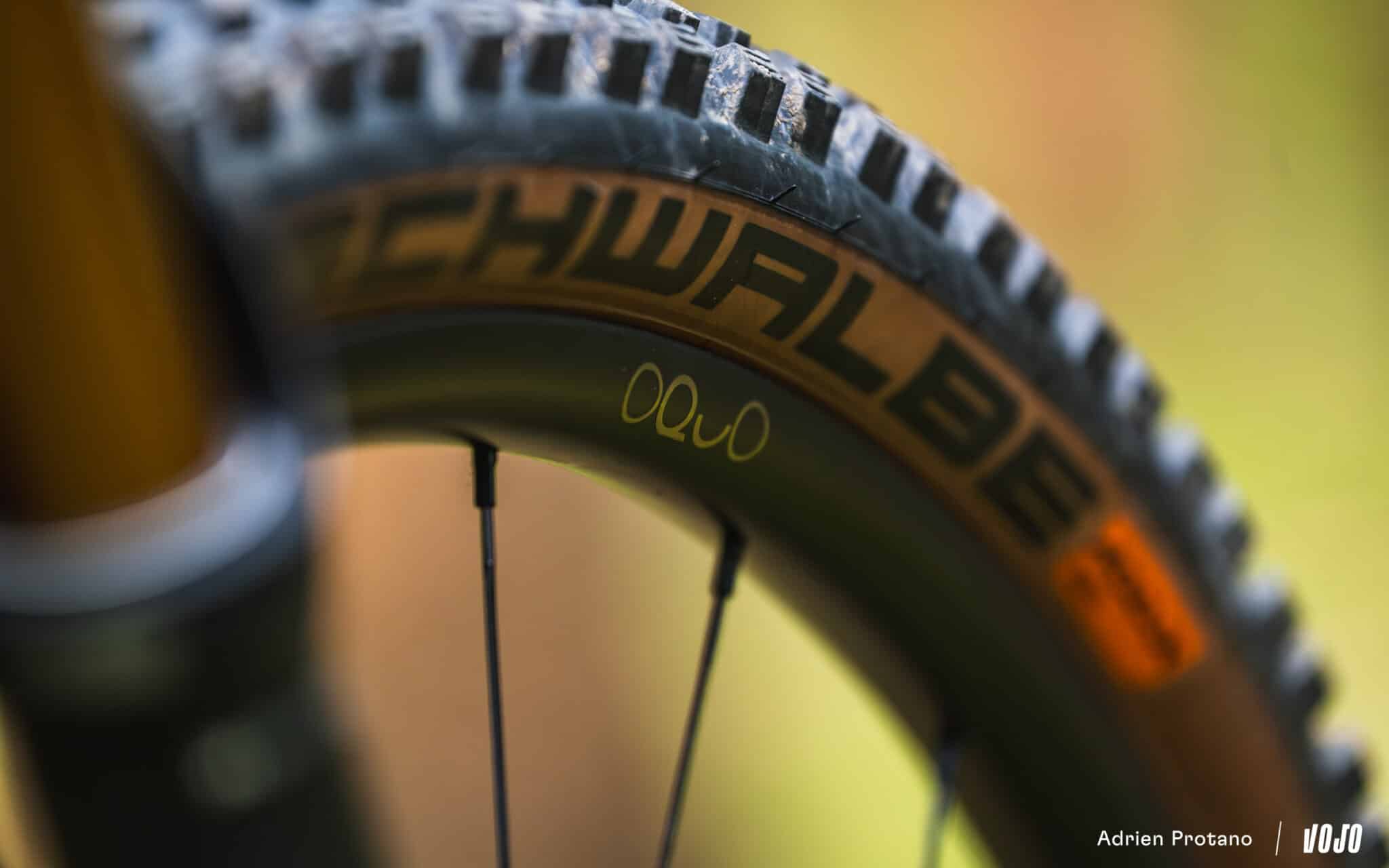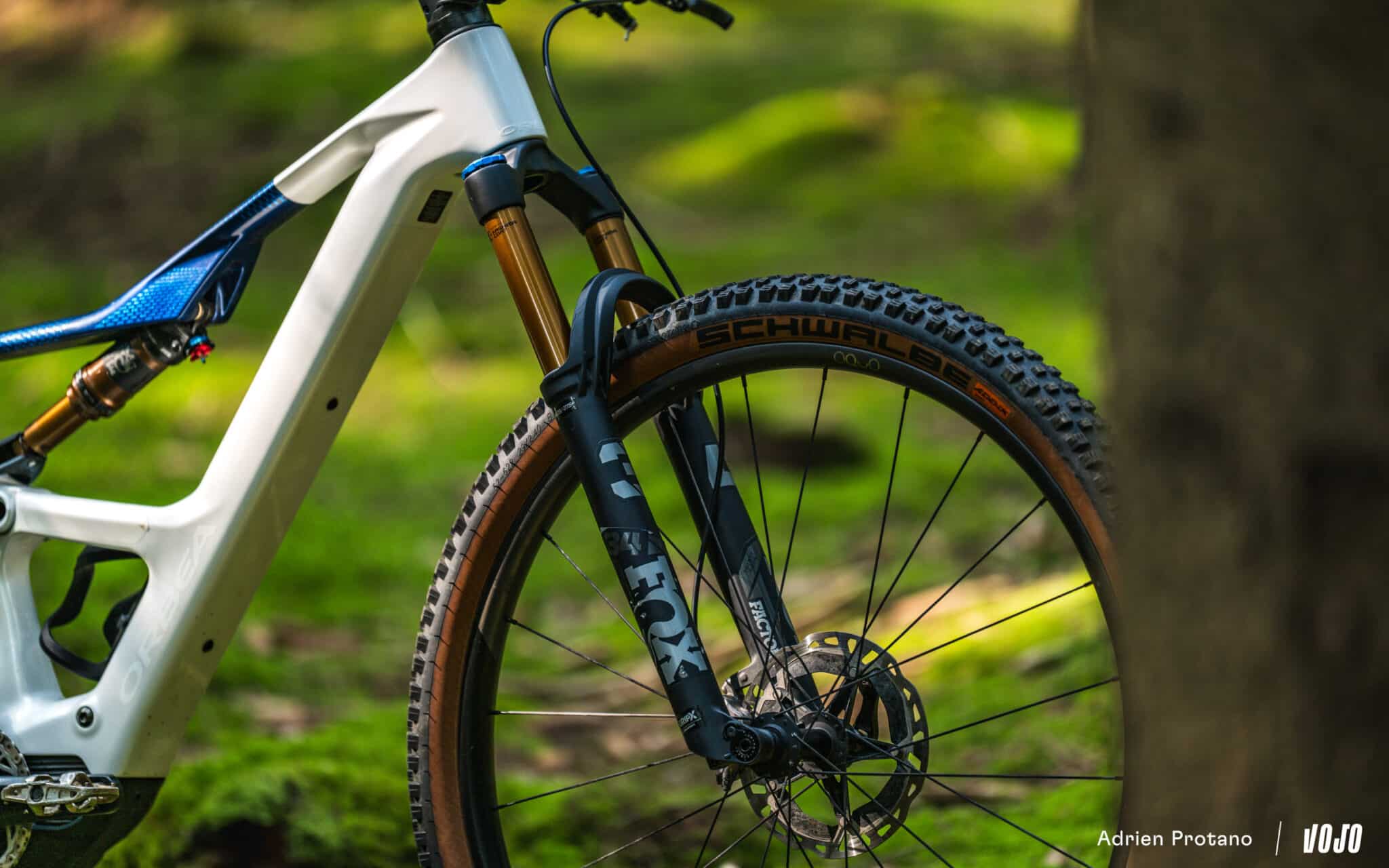 Puis, il y a aussi les roues Oquo (la marque d’équipements d’Orbea) qui sont presque des roues de XC et qui contribuent beaucoup à l’impression de légèreté que dégage ce vélo. Pour autant, elles n’ont montré aucune faiblesse lors de ce test qui a, au final, été assez varié puisque nous avons aussi emmené le vélo sur la Transmaurienne en plus de nos trails habituels et des trail centers belges. On a moins apprécié les pneus, faussement polyvalents. Les Schwalbe Wicked Will se font vite prendre en défaut quand c’est humide et même sur le sec ils peuvent se montrer piégeurs. Côté rendement, ils ne peuvent pas non plus rivaliser avec de vraies gommes de XC. Bref, on n’a pas été convaincus et on aurait presque préféré qu’Orbea joue la carte du SL jusqu’au bout en montant des Schwalbe Racing Ralph/Ray qui sont, eux, de vrais pneus XC, mais dotés d’une vraie polyvalence.