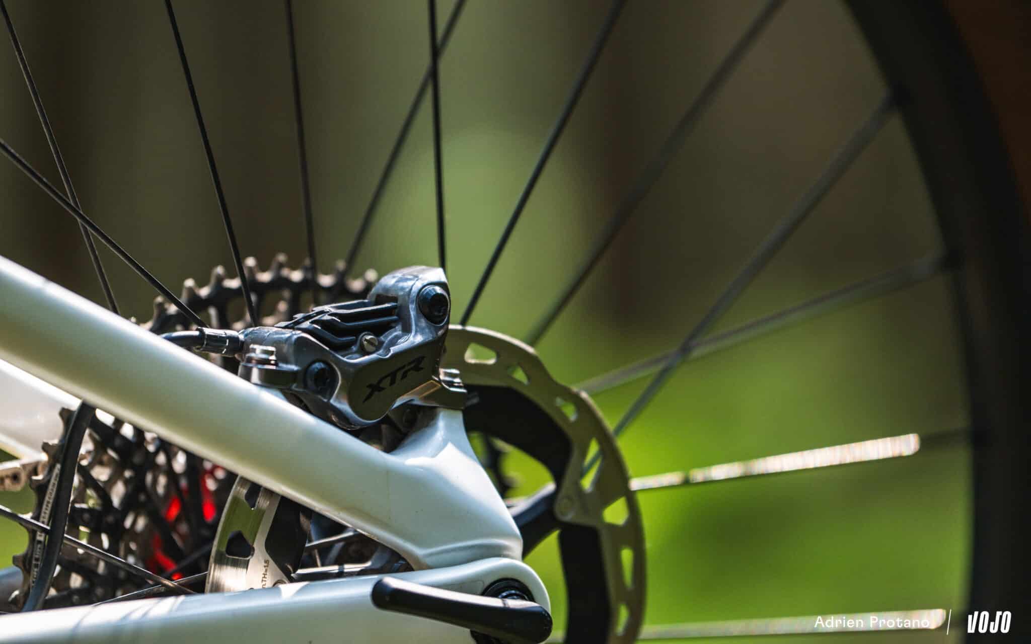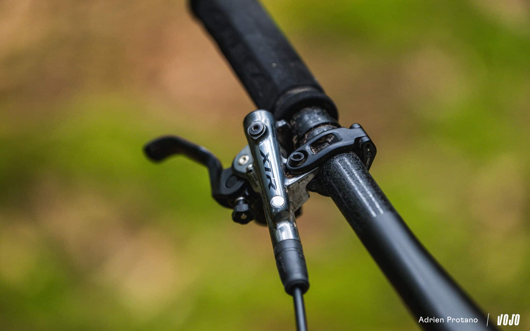 Changement de crèmerie pour les freins avec une paire de Shimano XTR M9120, associés à des disques de 180 mm avant/arrière.
