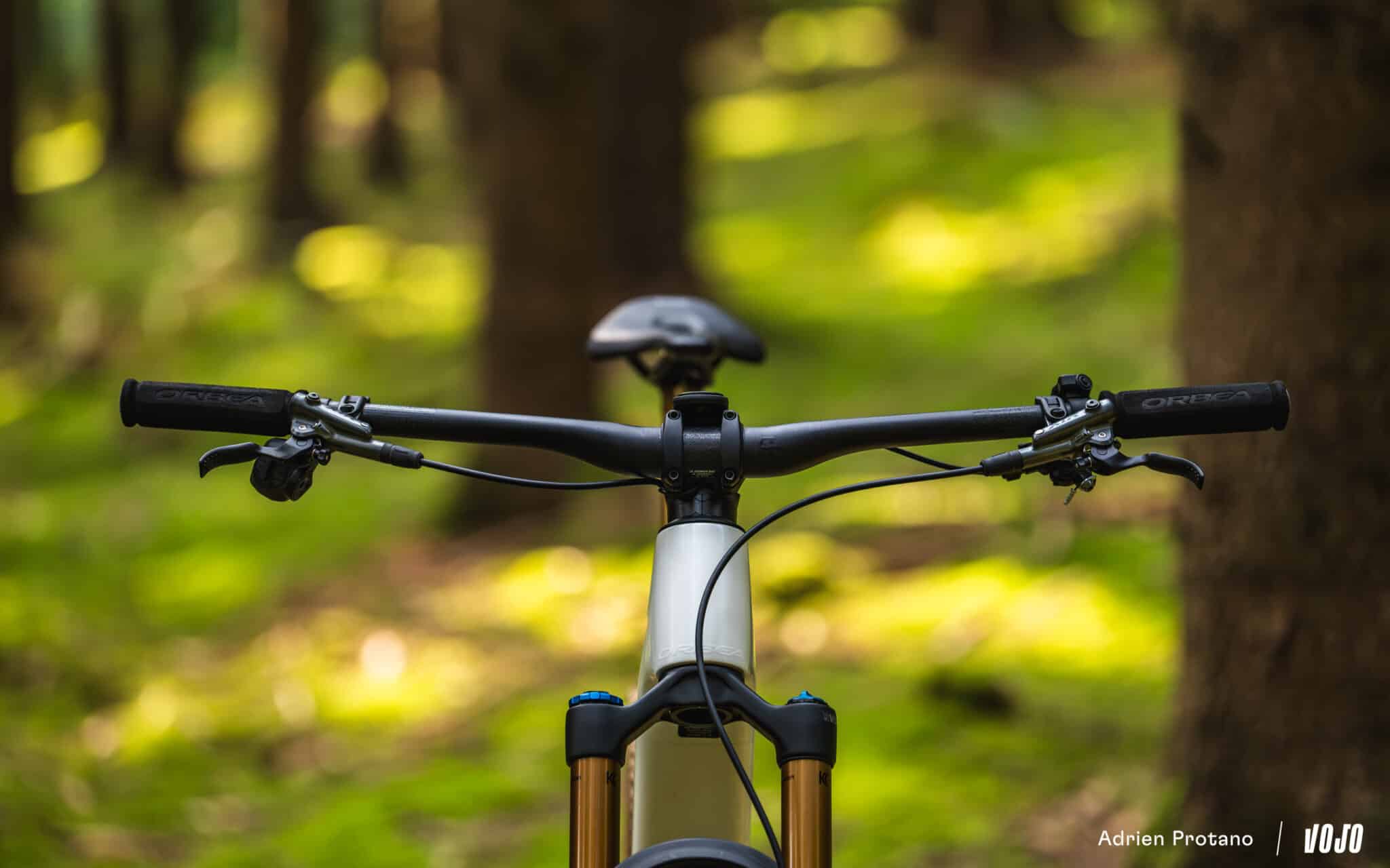 La tige de selle est une Fox Transfer SL (à câble, et non la très récente version sans fil : Nouveauté | Fox Transfer Neo : enfin une tige de selle télescopique sans fil chez Fox !) surmontée d’une selle Fizik Terra Ridon X1 145 mm. Le poste de pilotage est maison avec un cintre OC Mountain Control MC10 en carbone (rise de 20 mm et largeur de 800 mm) associé à une potence en aluminium.