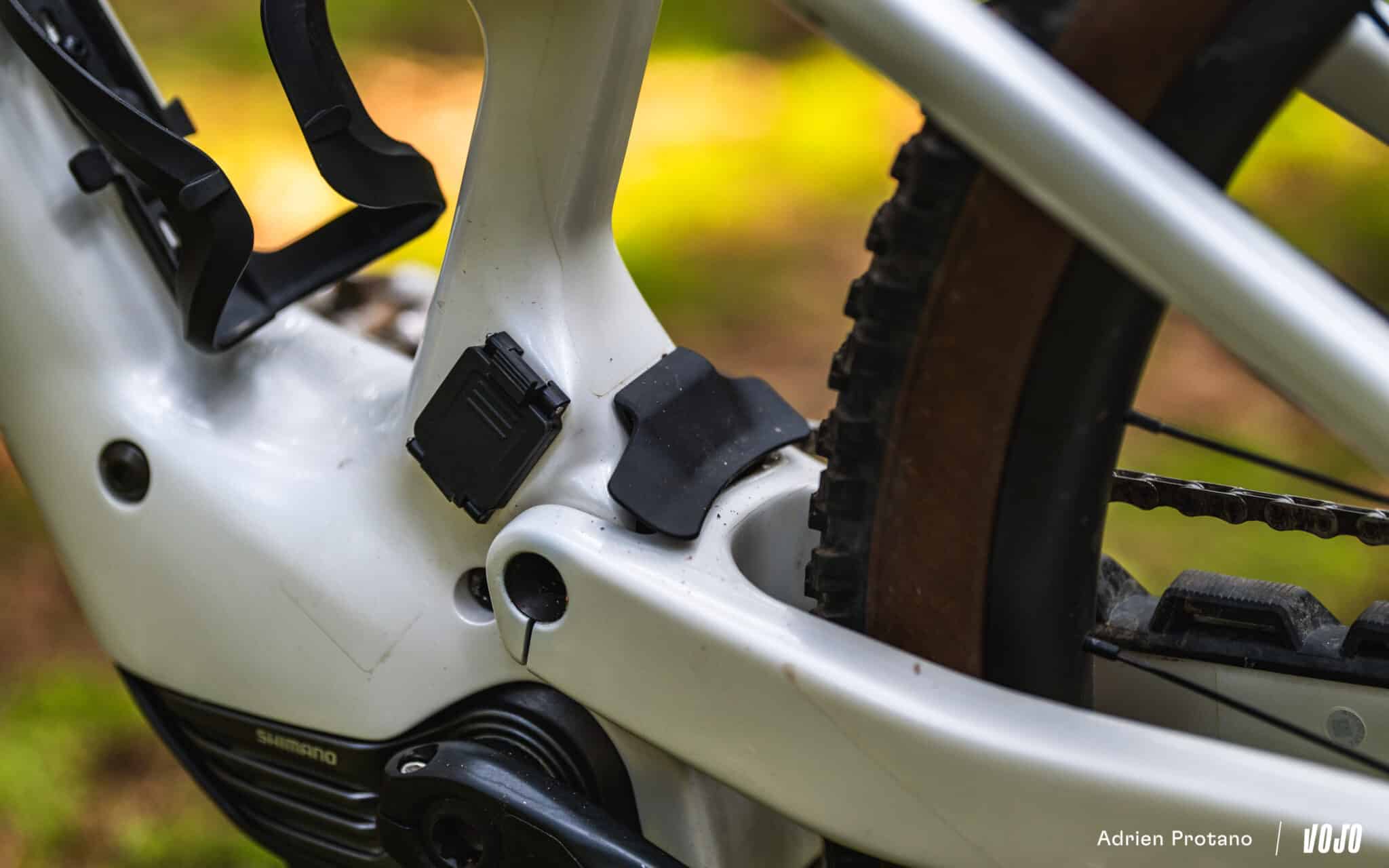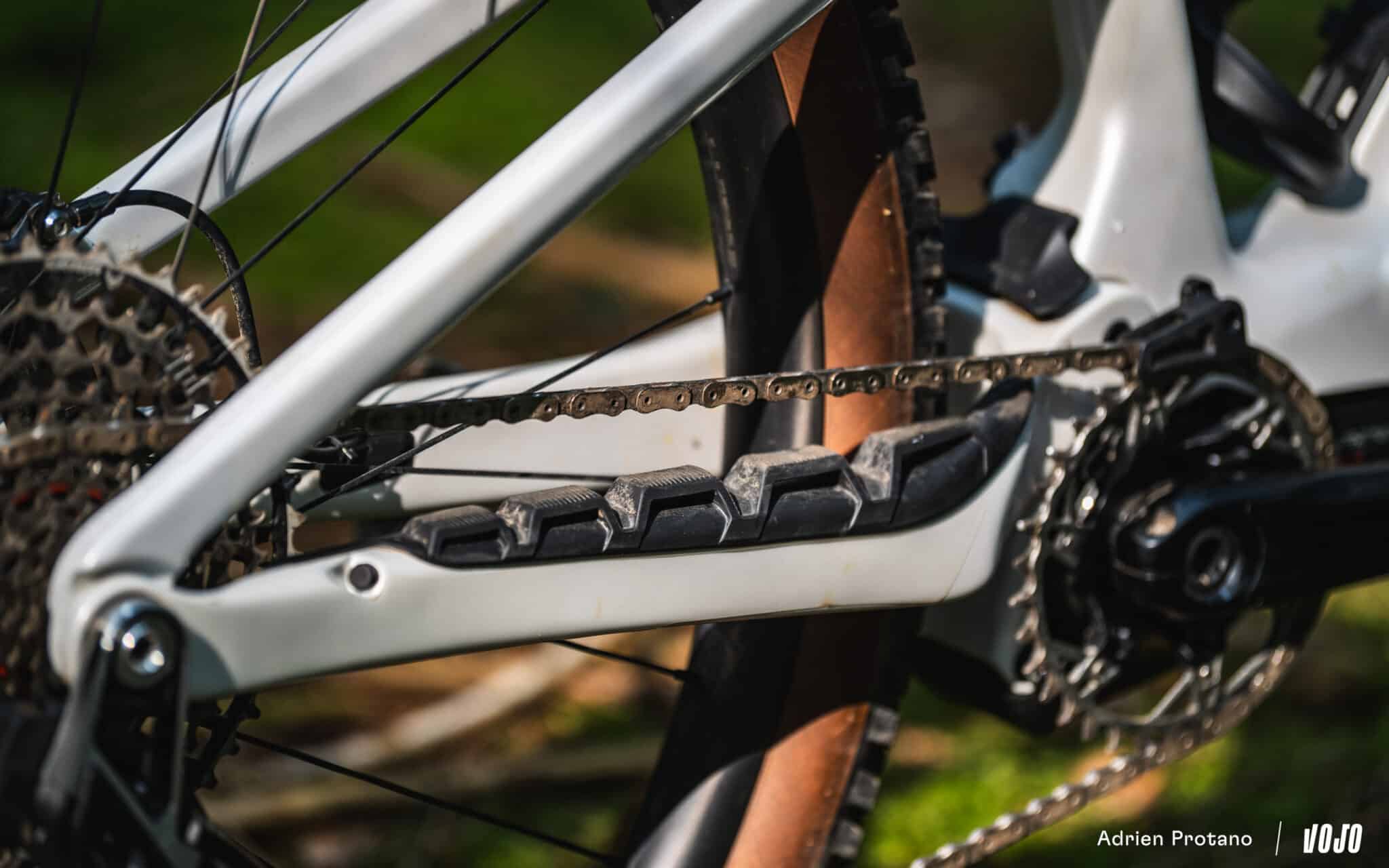 Pour permettre à son cadre d’être le plus durable possible, Orbea a choisi d’équiper le vélo de série d’un film de protection en vinyle. Du côté des autres protections, on notera également la présence d’une protection des bases en caoutchouc ainsi que d’une petite casquette protégeant le point de pivot inférieur des projections de la roue arrière.