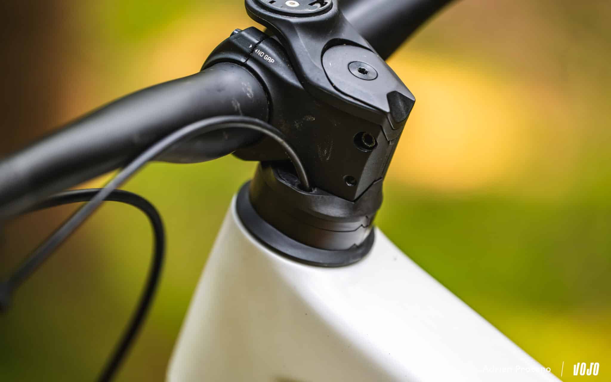 Le passage des gaines et Durits se fait toujours en interne (guidées au sein du triangle avant et arrière), avec une entrée au sein du jeu de direction. Comme on vous l’expliquait au moment du lancement du vélo, la marque est bien consciente des inconvénients pratiques de ce choix, et assure avoir joué la carte de la longévité des roulements pour limiter les opérations de maintenance. Cela passe par l’usage de roulements haut de gamme (à titre d’illustration, le roulement supérieur coûterait 2 fois le prix du jeu de direction complet de l’ancien Rise), et également par une protection généreuse de ceux-ci. Cela n’a pas empêché d’avoir un petit bruit récurrent au début de notre essai, résolu par les techniciens Orbea que nous avons rencontrés à la Pass’Portes en remplaçant une petite bague défectueuse. Le bruit n’est plus jamais revenu par la suite.