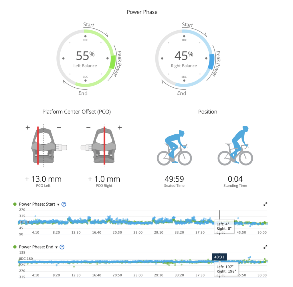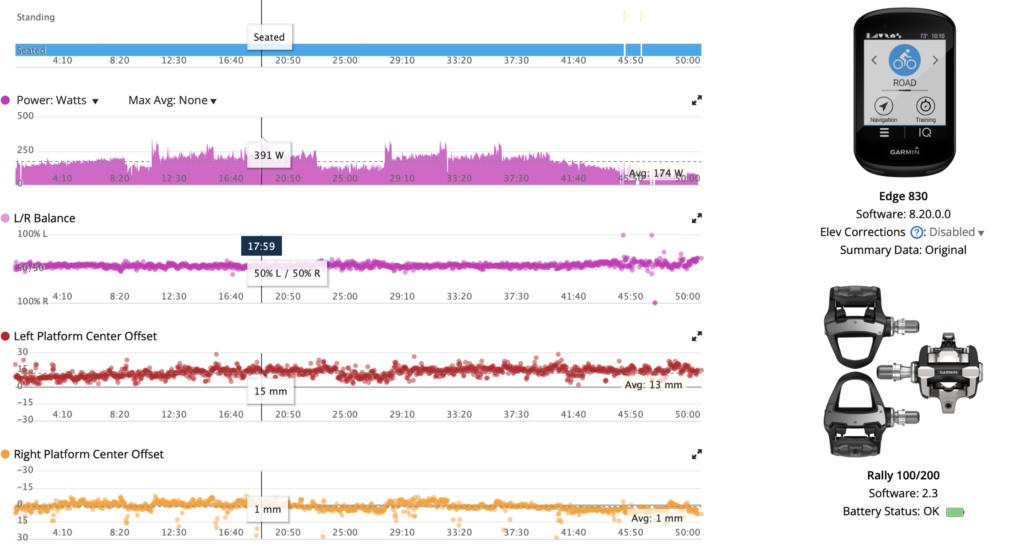 En combinaison avec un GPS Garmin, on a accès à des infos bien plus fines, comme le temps passé debout sur les pédales (pas très fiable selon nous) ou encore la différence de pression gauche/droite (très utile par contre, mais présent uniquement sur les XC200) et une indication par rapport à la position optimale de votre pied sur la pédale (intéressant). Une fois dans Garmin Connect, on peut analyser tout cela au moyen de tableaux lisibles et très complets qui permettront aux « geeks » et aux entraîneurs de faire des analyses fines a posteriori.