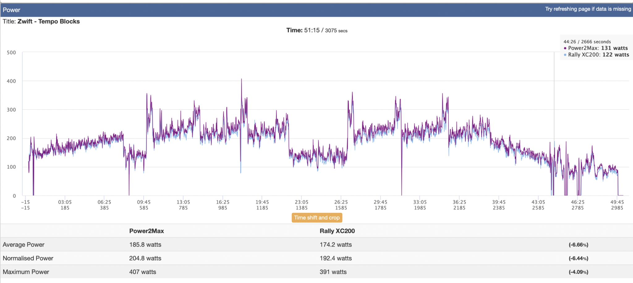 Dans l’ensemble, nous avons mesuré une différence moyenne de l’ordre de 1,5 à 2% de moins que le Sram Quarq avec les pédales Garmin Rally XC200. Avec le Power2Max, nous sommes montés jusque 6% d’écart, ce qui est plus important, mais le P2M est assez « généreux » et surtout la marge est restée assez constante entre les deux capteurs. Ce qui est le plus important.