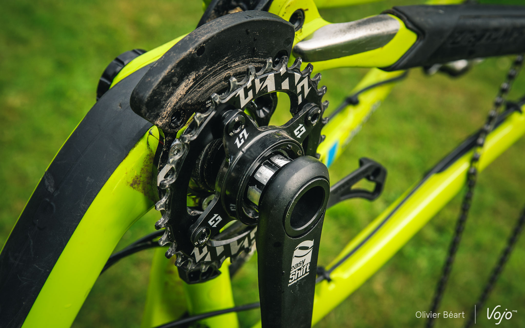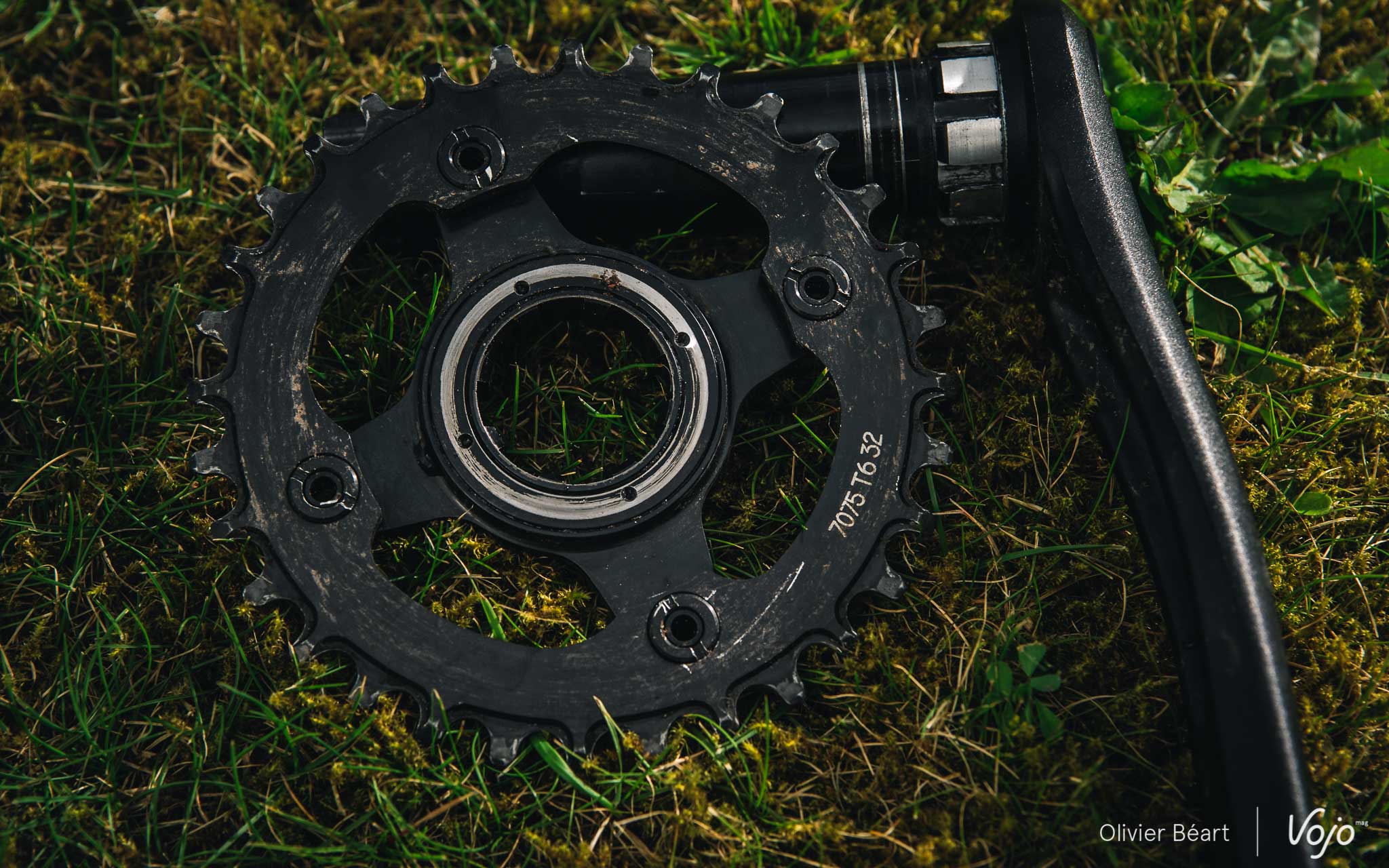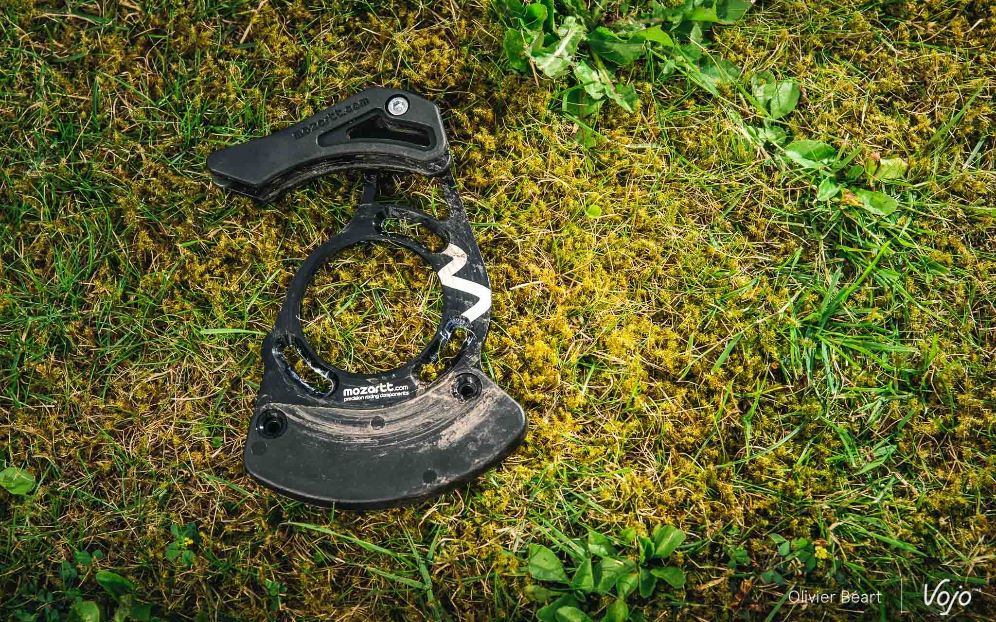 Attention, comme on le voit sur ces images, le montage d’un anti-déraillement avec sabot de protection sur le dessous est indispensable pour respecter les termes de la garantie. Vu que la chaîne et le plateau tournent en permanence, mieux vaut éviter le contact avec le sol, les pierres et les troncs d’arbres indélicats !