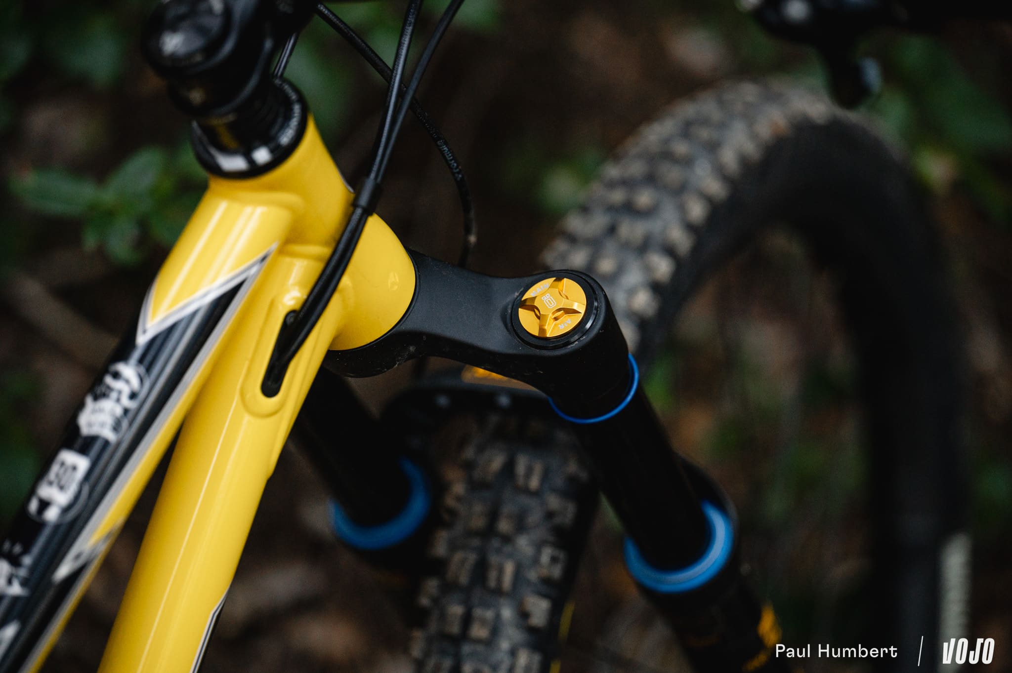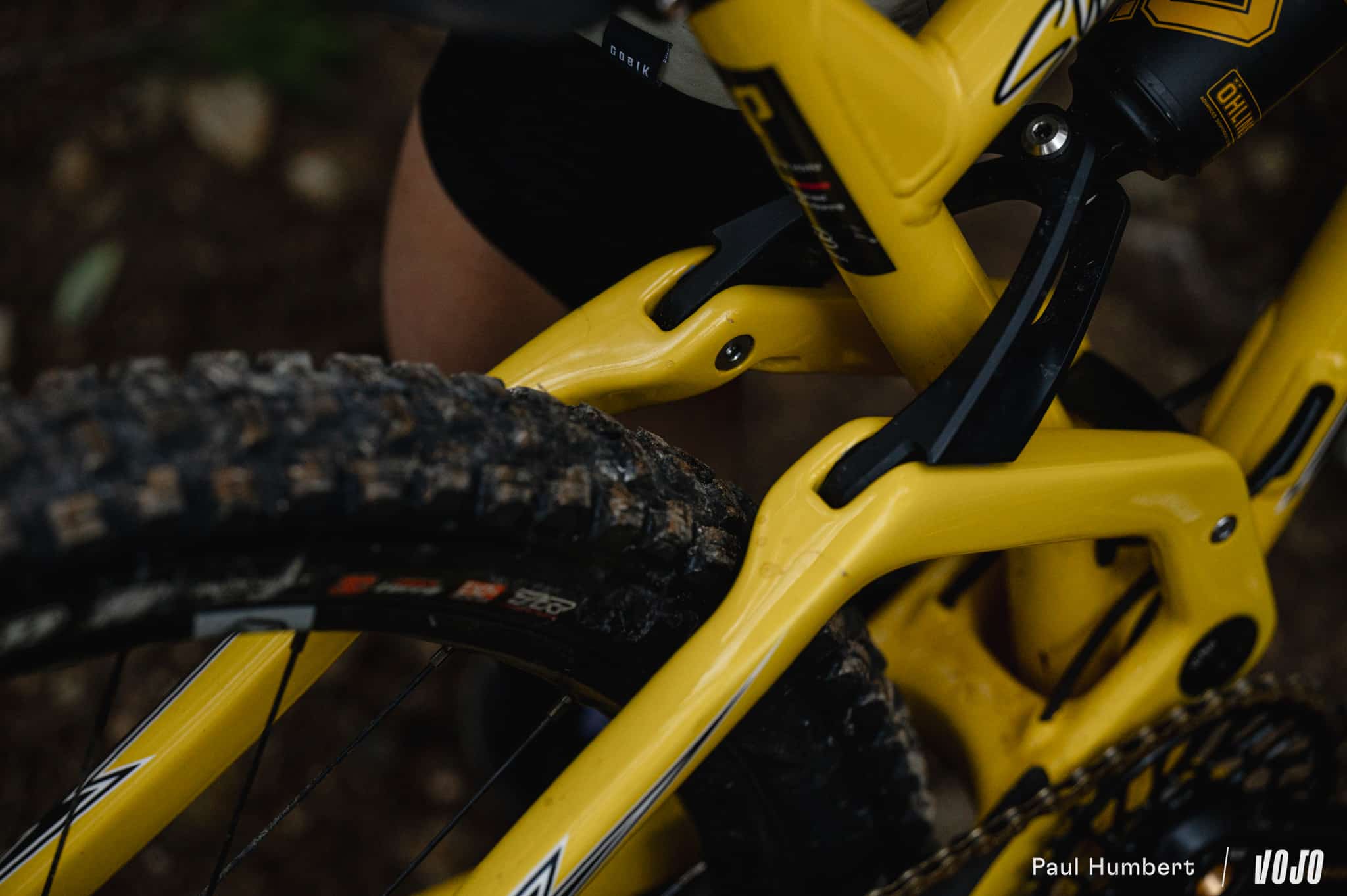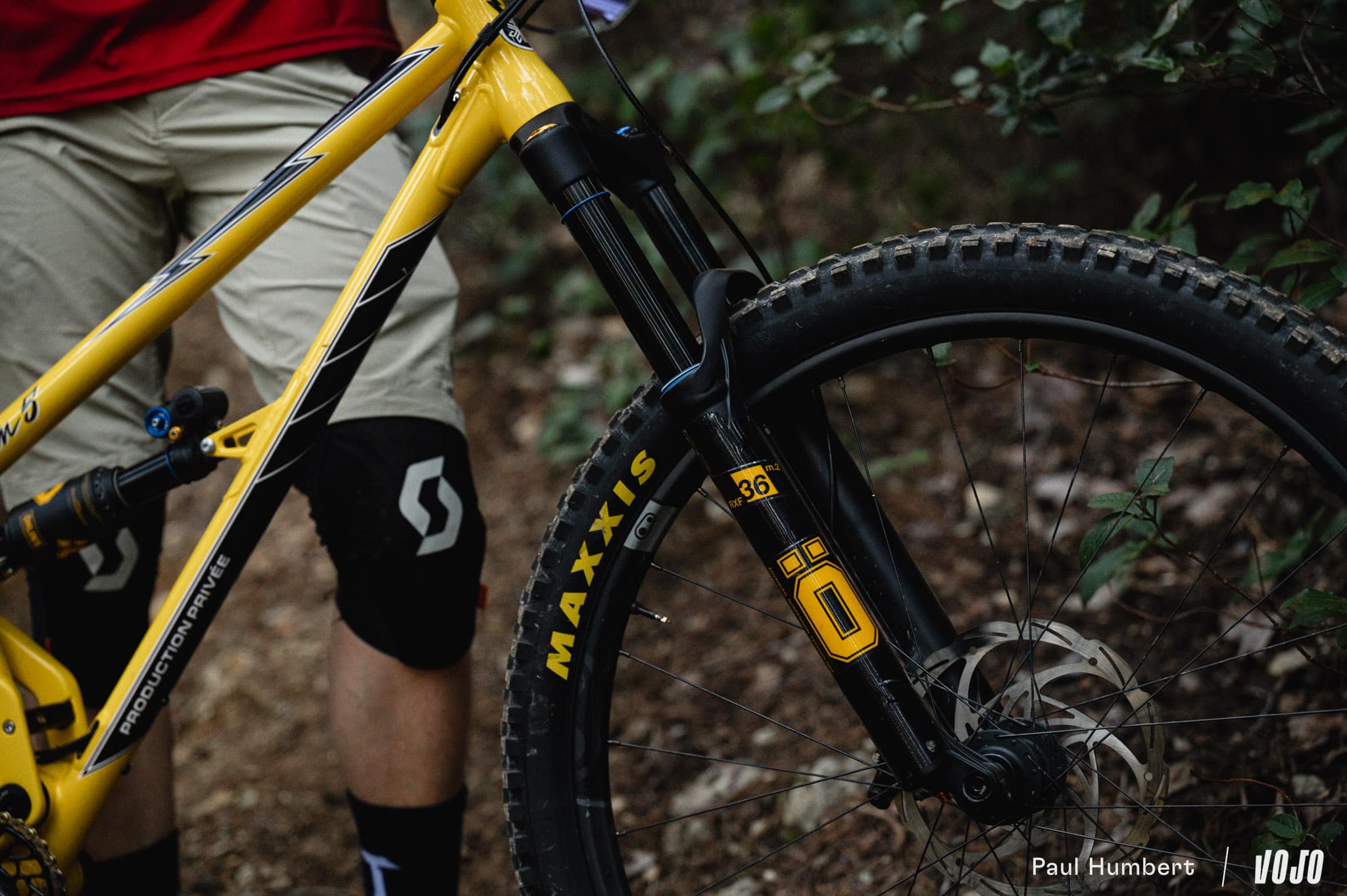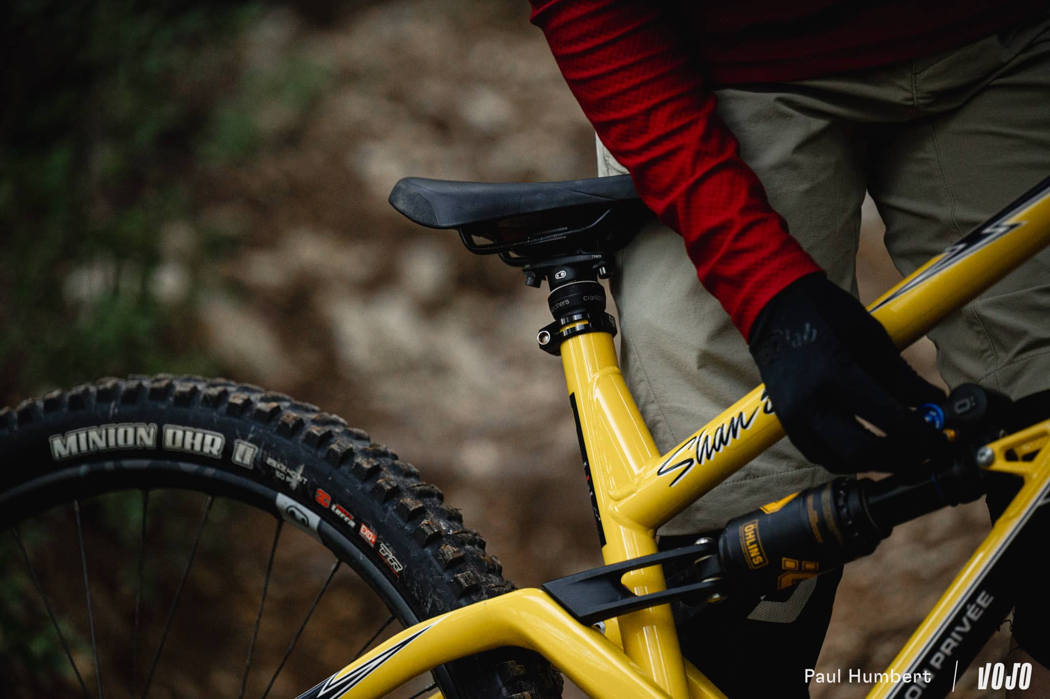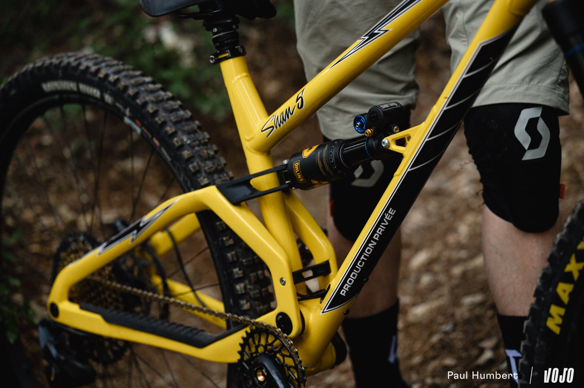 Cette suspension développe 140 mm de débattement, couplée à une fourche en 150 mm. Production Privée a choisi des suspensions Öhlins (dont les détails jaune/or s’accordent très bien au vélo) pour en gérer le comportement, et on a donc un amortisseur TTX2 Air ainsi qu’une fourche RXF36 m.2, démontée à la réception par la marque et relubrifiée avant d’être installée sur le vélo.