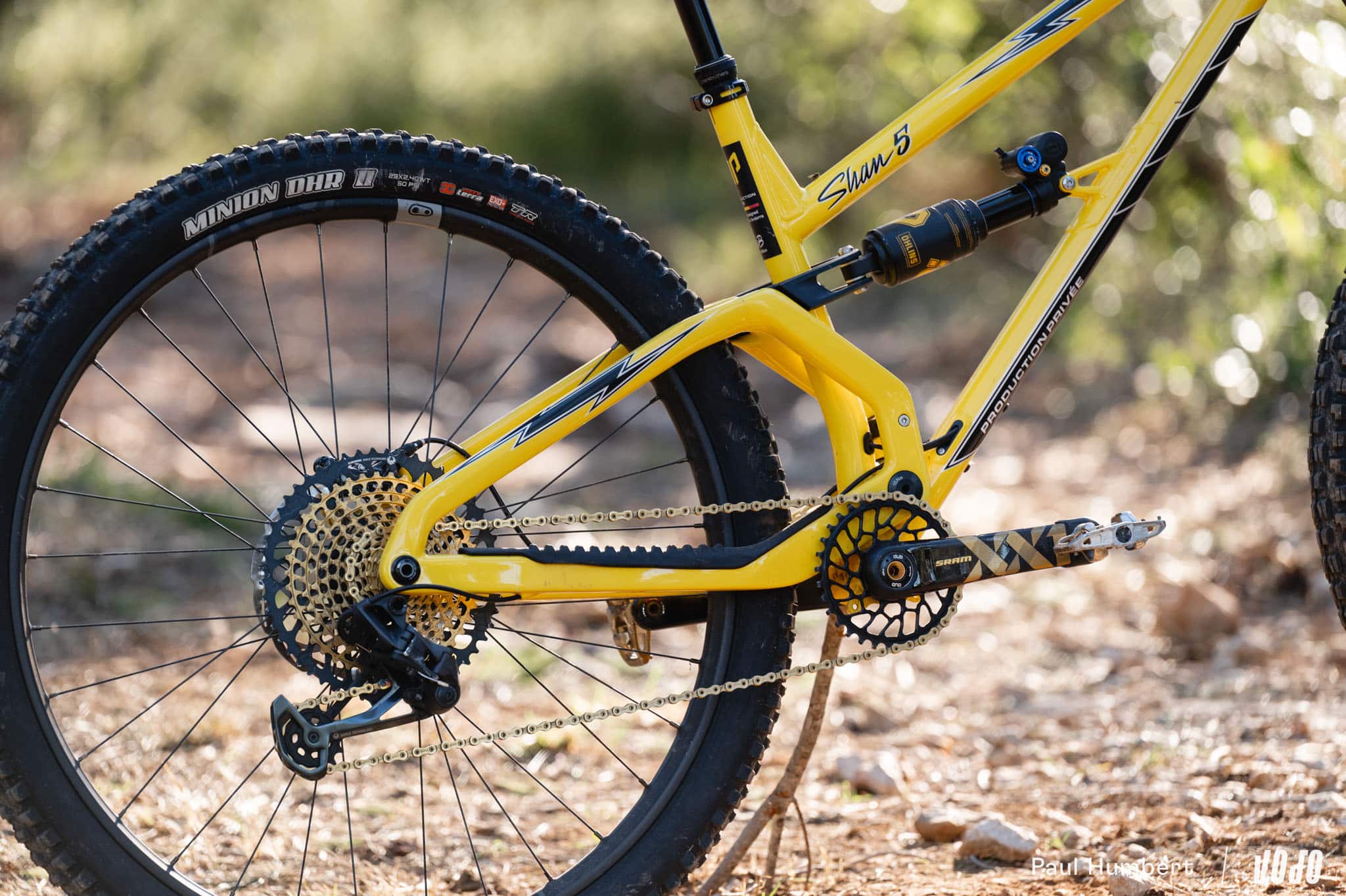 Si le Shan n°5 tout en acier pouvait être vendu en vélo complet, ce n’est plus le cas de ce Shan 5 acier/carbone. A la place, Production Privée propose au mieux un « Rolling Chassis », une draisienne en fait : on a les suspensions, le train roulant et les périphériques mais il manque la transmission et les freins, qui sont donc laissés à la charge de l’acheteur. Un choix qui serait difficile à assumer pour une grande marque mais qui a du sens dans ce marché de niche, où chaque vélo est différent et où les montages personnalisés sont presque la norme.