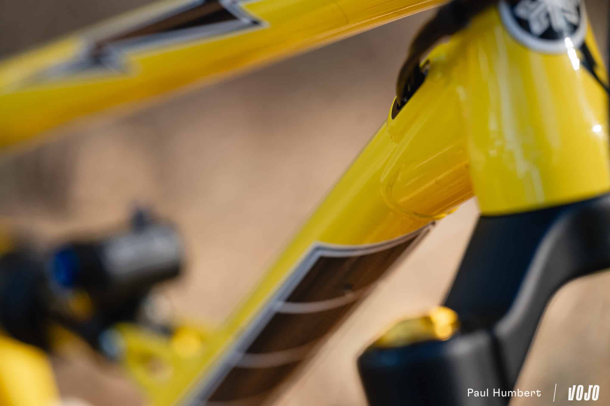 « Au début on était en full acier car ça avait du sens pour les qualités dynamiques et la robustesse. Pour les petites marques l’acier est intéressant, travailler avec des nuances de traitement thermique et de butted c’est beaucoup plus facile qu’ouvrir un moule pour du carbone ou hydroformer pour de l’aluminium », nous explique Damien Nosella, « mais là on voulait passer un cap de performance. A l’avant l’acier a un ratio poids/performance correct mais c’est un matériau très limité à l’arrière, surtout en monopivot. Avec les ressources de Forestal pour le carbone on a essayé et le passage est vraiment bénéfique, c’est très solide et on gagne en poids. »