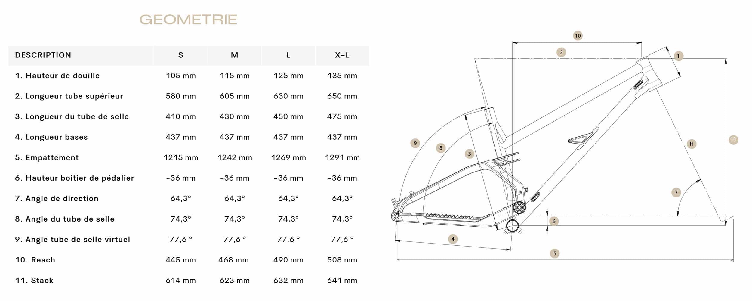 « Un débattement de trail/AM avec une géométrie d’enduro », voici comment Damien Nosella nous décrivait sa machine. En effet ! Avec 64,3° d’angle de direction et un reach généreux (468 mm en taille M), le Production Privée Shan 5 n’a rien à envier aux dernières machines de la catégorie. On note aussi un angle de tube de selle bien droit (77,6°) qui devrait donner une bonne position de pédalage ainsi que des bases relativement courtes (437 mm) pour un tout-suspendu de ce débattement et en roues de 29″.