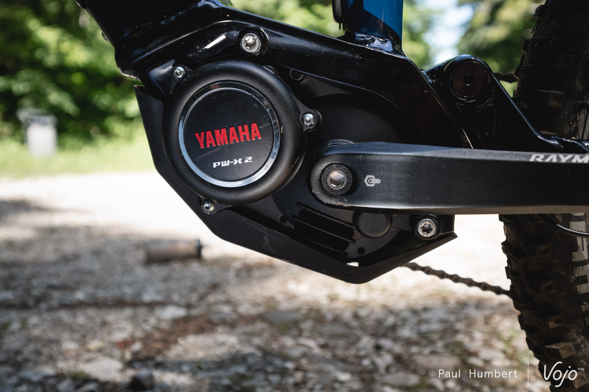 L’assistance Yamaha est confortable à utiliser, même si les 5 modes sont de trop selon nous. 4 suffiraient (voire 3, pour faire au plus simple), car l’Eco+ est si faible qu’on ne le sent presque pas. Nous avons majoritairement roulé en Standard et High, avec des passages en EXPW (Extra Power) lorsque le terrain le demandait, et exceptionnellement en Eco. Nous y sommes maintenant habitués pour l’avoir rencontré sur d’autres vélos mais on rappellera tout de même qu’elle est assez sensible à la fréquence de pédalage et qu’il ne faut pas hésiter à jouer du dérailleur pour conserver une cadence assez élevée.