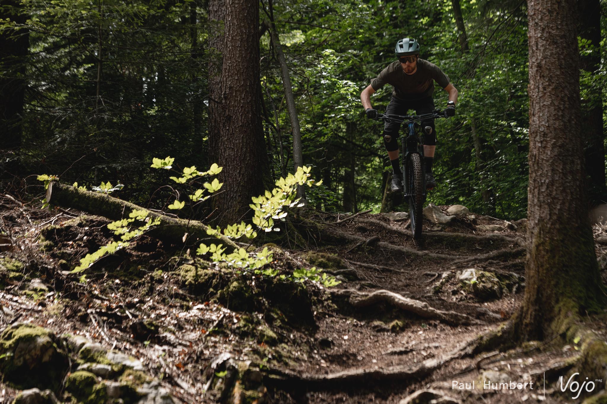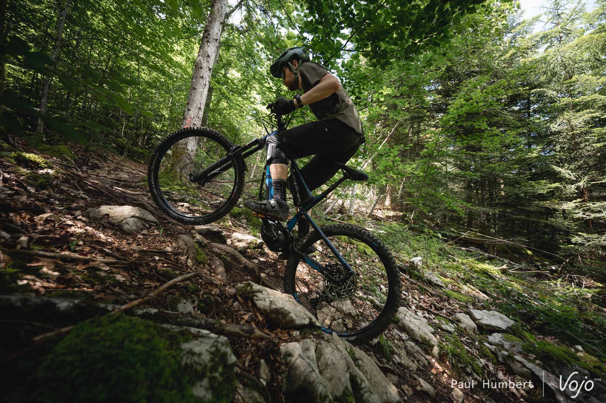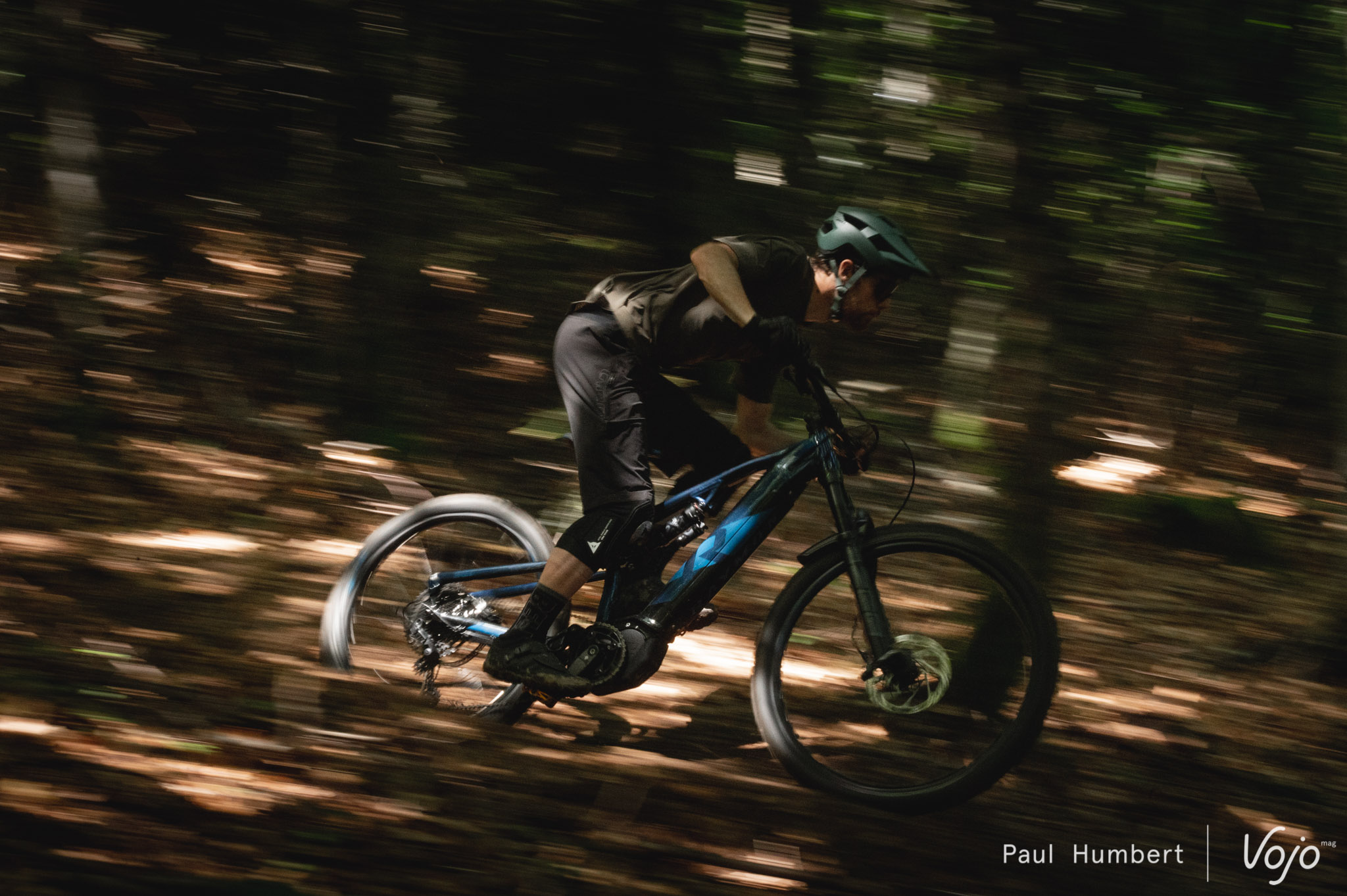 Tout d’abord, il est lourd. La marque l’annonce à 25,9 kg et on peut vous confirmer que la sensation de poids est (très) présente. Sur les sentiers, cela se traduit par un vélo peu réactif dans le technique à basse vitesse et qui peut facilement embarquer son pilote lorsque le rythme est plus élevé. L’inertie est importante et quand on essaie d’attaquer, on a vite l’impression de se battre contre la machine, notamment pour la placer en entrée de courbe ou pour refermer les virages et ne pas sortir à l’extérieur du chemin.