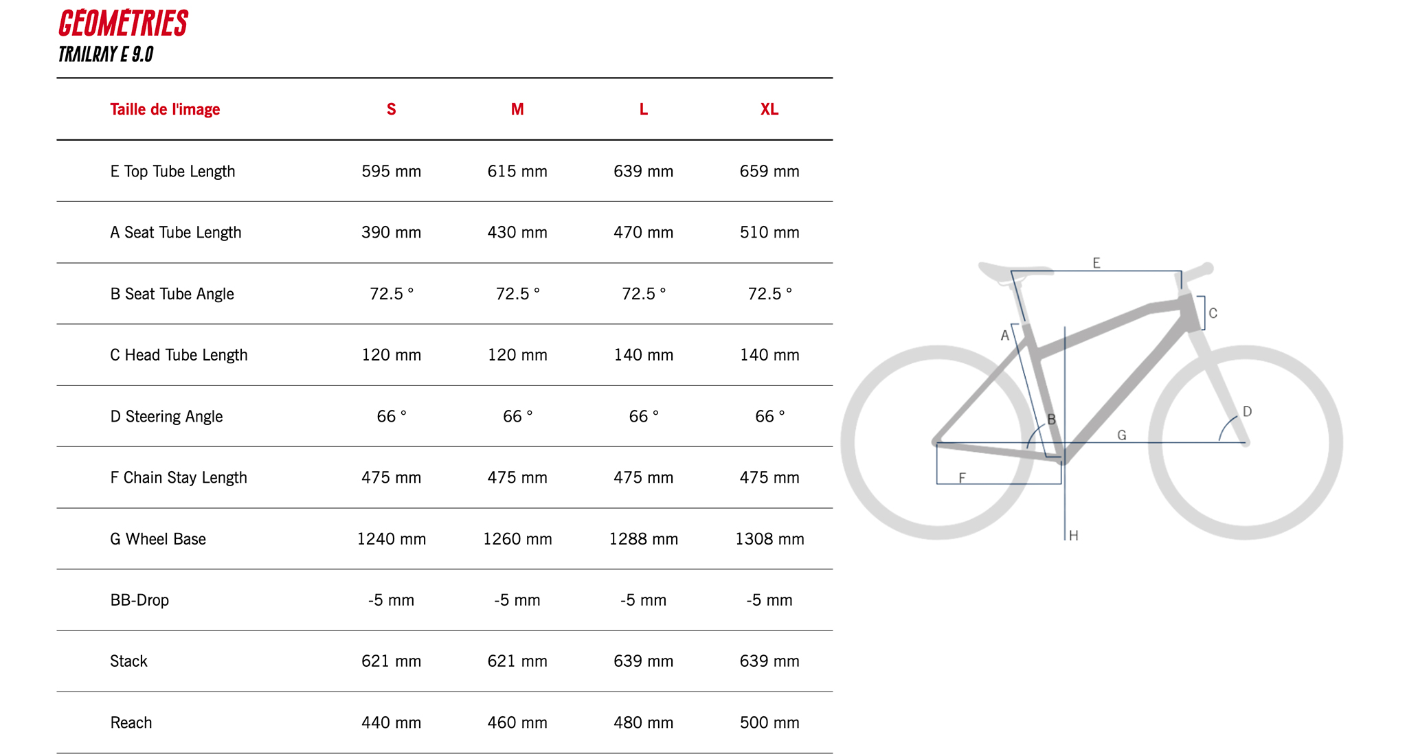 La gamme TrailRay compte 4 modèles, qui proposent tous un rapport prix / équipement très compétitif. La famille commence avec le TrailRay E 8.0, à 3 999 €, se poursuit avec le TrailRay E 9.0 testé ici (4 599 €) puis le 10.0 à 4 999 € et se termine avec le modèle E 11.0. Pour 1000 € de plus que notre 9.0 (5 599 €), ce dernier offre un équipement de premier ordre avec une fourche Fox 38 Grip 2 Factory, un amortisseur Fox DPX2 Factory, des freins Sram G2 RSC, une transmission Sram GX Eagle et des roues DT Swiss E 1900 Spline 30.