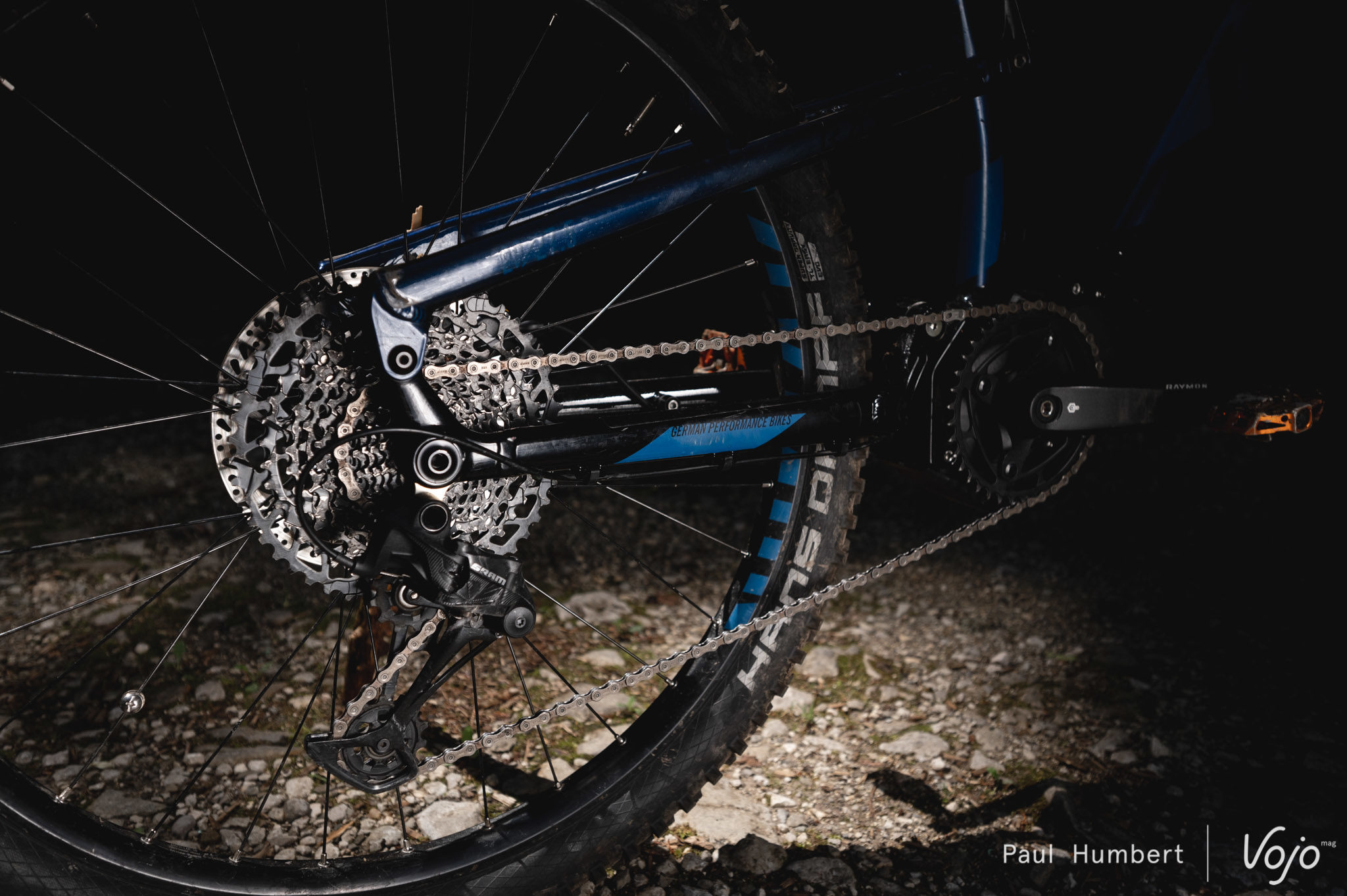 C’est Sram qui fournit la transmission, avec un ensemble complet SX Eagle et manette Single Click spécialement conçue pour les e-bikes (on ne peut passer qu’un pignon à la fois pour limiter les contraintes sur la chaîne, le dérailleur et la cassette et éviter ainsi les casses ou l’usure prématurée). C’est la transmission d’entrée de gamme de Sram en VTT et on sent effectivement qu’elle n’a pas la douceur et la précision des modèles plus haut de gamme, GX Eagle ou X01 Eagle par exemple, mais nous n’avons connu aucun souci de fiabilité ou de réglage au long de ce test.