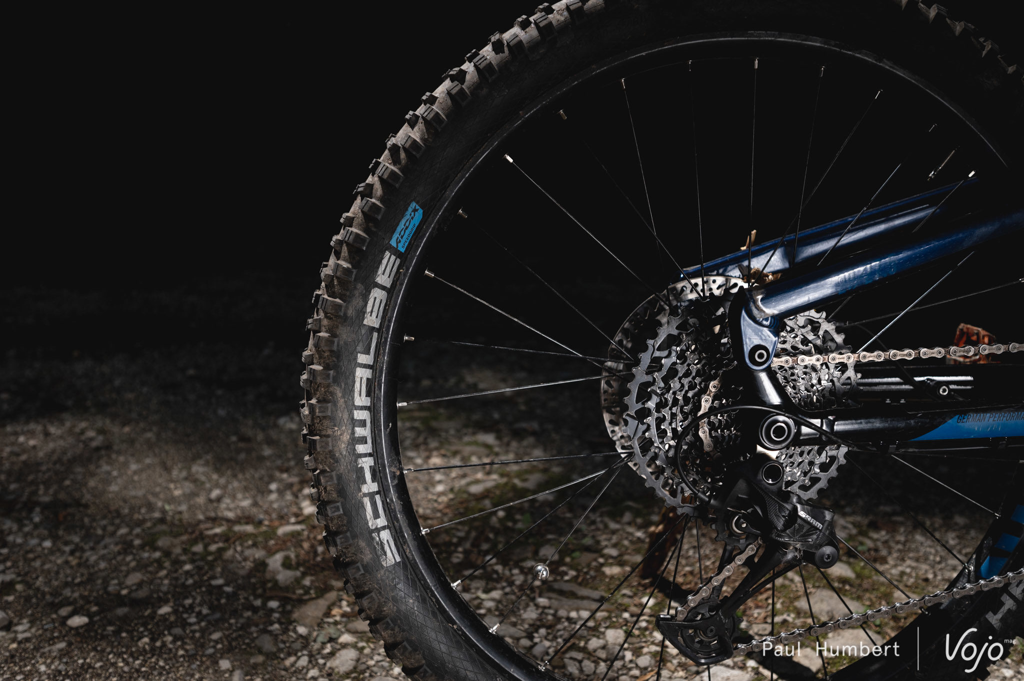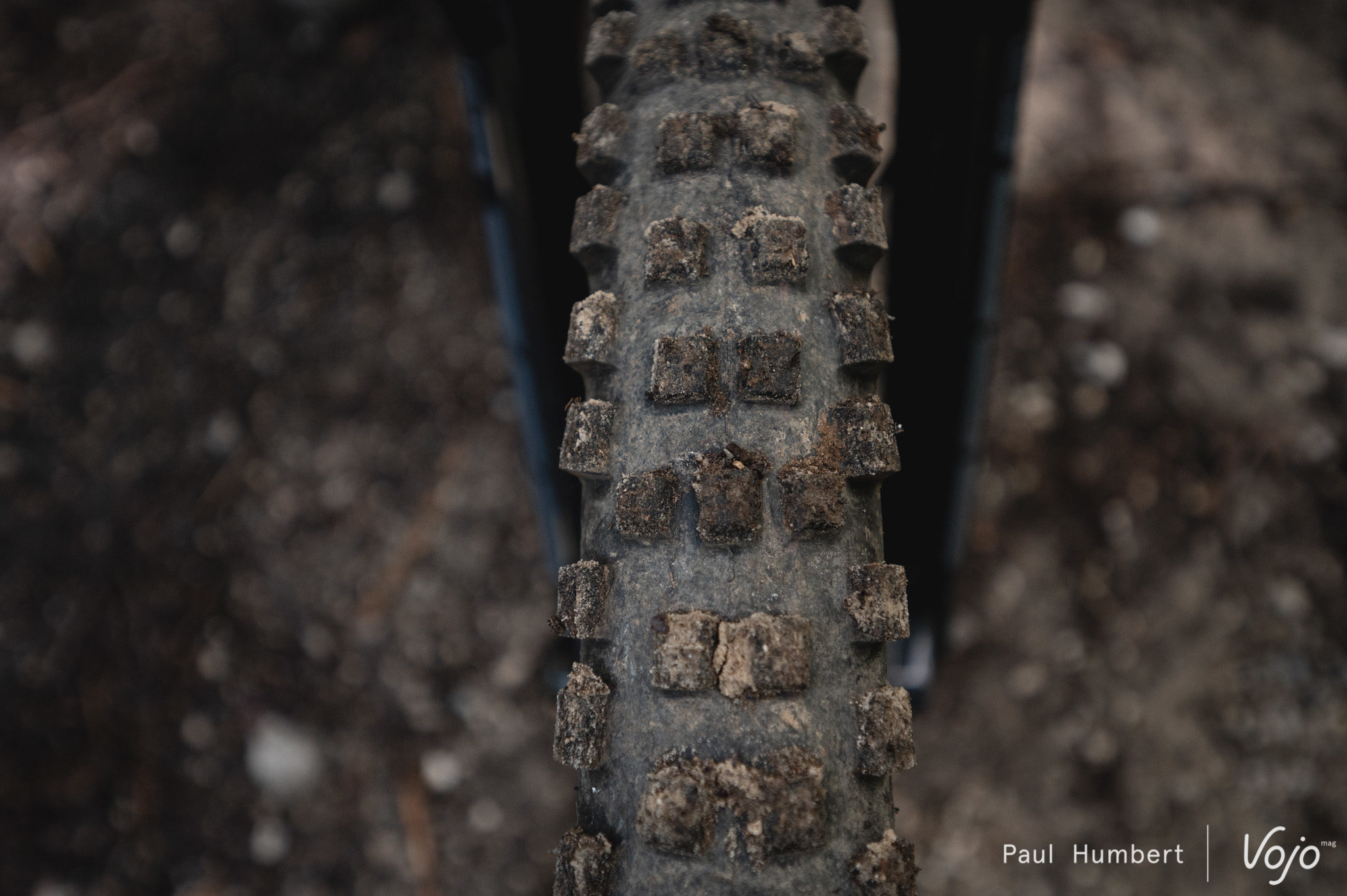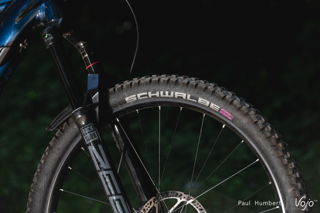 On l’a vu quelques paragraphes plus haut, le vélo est équipé de suspensions tout à fait honnêtes et c’est également le cas au niveau des pneus, puisqu’on retrouve le très bon duo Magic Mary (à l’avant) / Hans Dampf (à l’arrière), en carcasse SnakeSkin dans les deux cas. On notera par ailleurs que le premier est en section de 2,4″ et gomme UltraSoft pour maximiser la précision et le grip tandis que le second est en 2,6″ et SpeedGrip pour optimiser le confort et la durée de vie. Ils sont montés sur des cercles Mach1 Trucky en 30 mm de largeur interne.