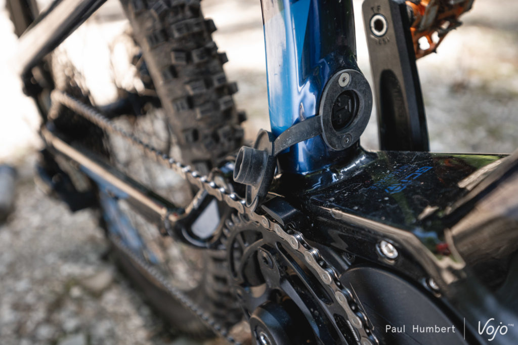 Placé au milieu des bases, il n’est pas du tout intégré au cadre et communique avec un basique aimant fixé sur un rayon. Au-delà de l’apparence discutable, on sait que ce type d’assemblage n’est pas très fiable et que l’aimant peut par exemple bouger, ce qui entraîne des problèmes dans le fonctionnement de l’assistance. Dommage, d’autant que l’aimant placé au niveau du disque est maintenant la norme chez la concurrence.