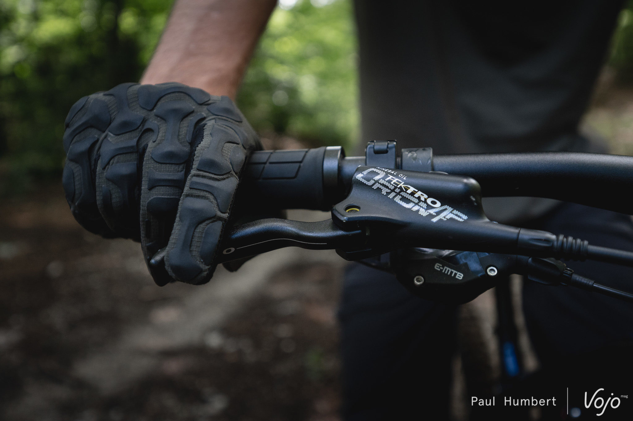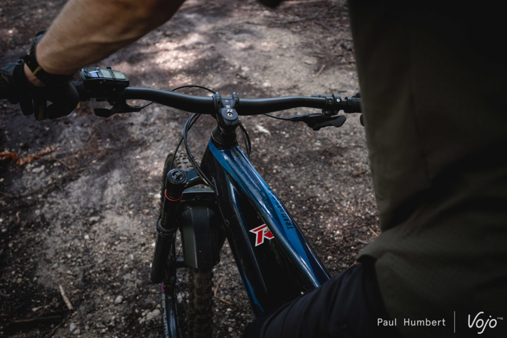 L’autre point noir, et c’est réellement problématique, concerne les freins Tektro Orion. Ce sont des modèles à 4 pistons et Tektro les annonce comme « recommandés pour les e-bikes à moteur central », mais ils manquent cruellement, dangereusement même, de puissance en freinage à un doigt. On a également essayé de freiner à deux doigts mais cela n’améliore pas beaucoup les choses et surtout, on tient moins bien le cintre, donc c’est à déconseiller. Le retour est le même chez tous nos testeurs, c’est la première fois que nous rencontrons une telle situation.