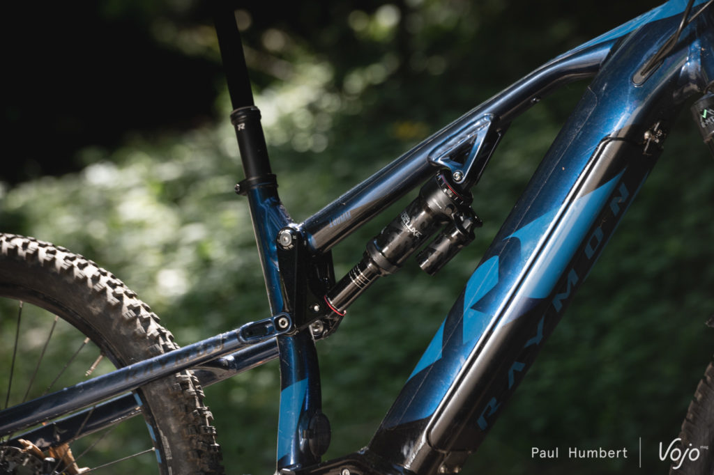 Les formes du triangle arrière peuvent être trompeuses, avec ce fameux angle à l’arrière des bases, mais il s’agit bien d’une architecture monopivot + biellette et non d’un 4 bar linkage. Elle développe 160 mm de débattement et, sur le TrailRay E 9.0, c’est un RockShox SuperDeluxe Select+ qui s’occupe de gérer tout ça. Malgré le tarif accessible pour un e-bike, R Raymon a fait le choix de monter un gros amortisseur adapté au programme du vélo. Ce n’est pas toujours le cas ailleurs et on apprécie cette décision.