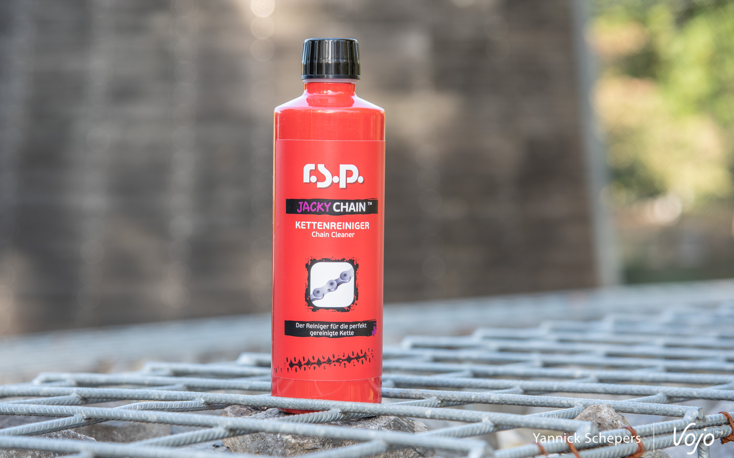 Voilà pour l’approche théorique, mais c’est la pratique qui compte. R.s.p. conseille de toujours dégraisser la chaîne au préalable avec son nettoyant pour chaîne Jacky Chain. Nous avons l’habitude de dégraisser nos chaînes pendant une demi-heure dans un bain à ultrasons à 50 degrés pour un effet en profondeur, mais il est tout à fait possible de nettoyer » légèrement » la chaîne en vaporisant le produit sur la chaîne et en le laissant pénétrer.
