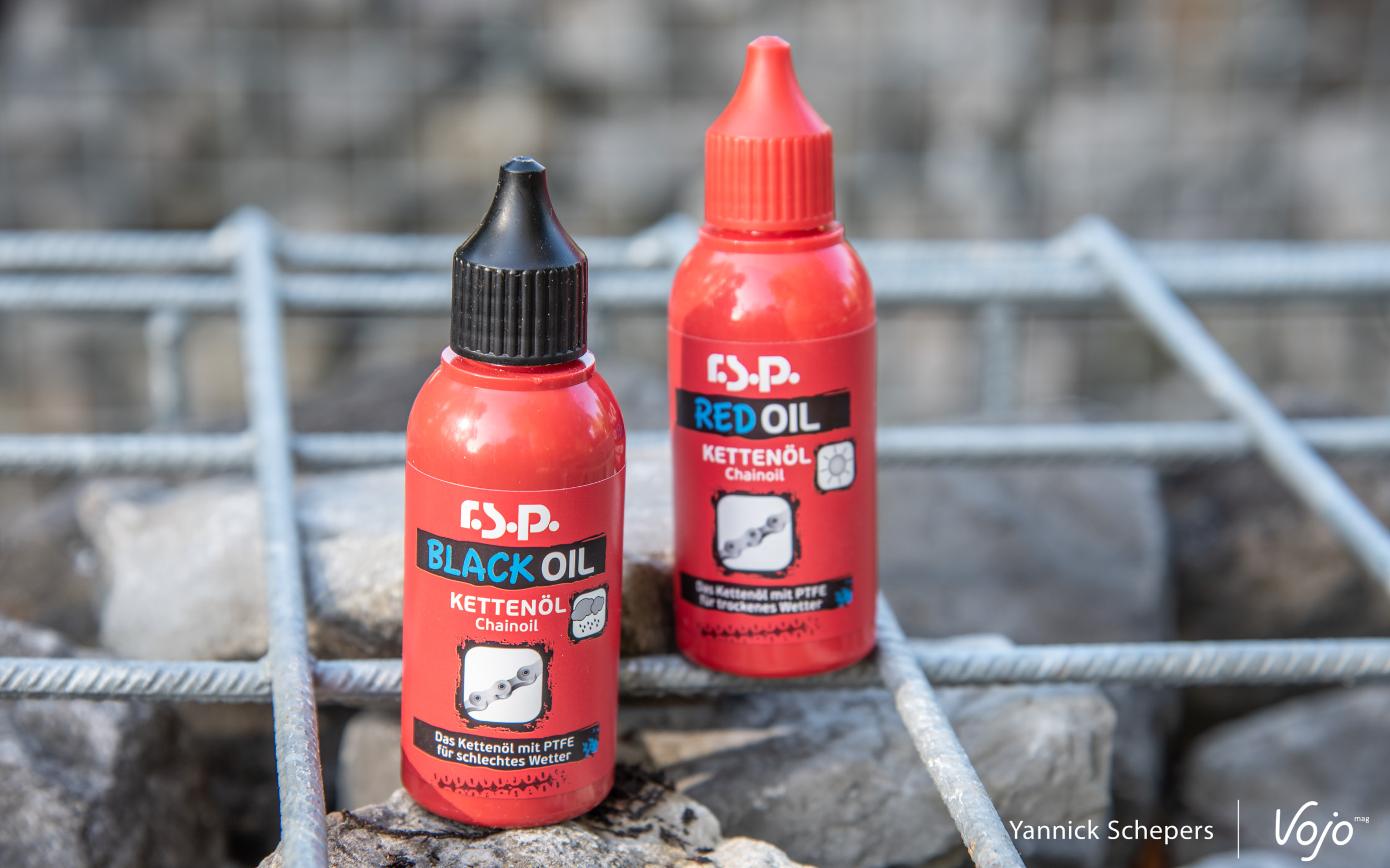 Chez r.s.p., l’huile rouge est pour les conditions sèches et chaudes et l’huile noire pour les conditions humides et froides. Toutes deux contiennent du PTFE et des additifs antisalissures, mais elles sont clairement différentes, il suffit de mettre une goutte de chaque sur son doigt pour s’en apercevoir. L’huile noire-bleue est plus collante et reste en cercle sur la peau tandis l’huile rouge rose, en revanche, est moins visqueuse et coule. Elle est également plus facile à essuyer, surtout avec un chiffon humide. Les particules de poussière sèches ont tendance à se répandre avec l’huile rouge, tandis qu’avec l’huile noire, il faut ajouter un peu d’eau à la « saleté » et on observe une sorte d’effet hydrophobe.