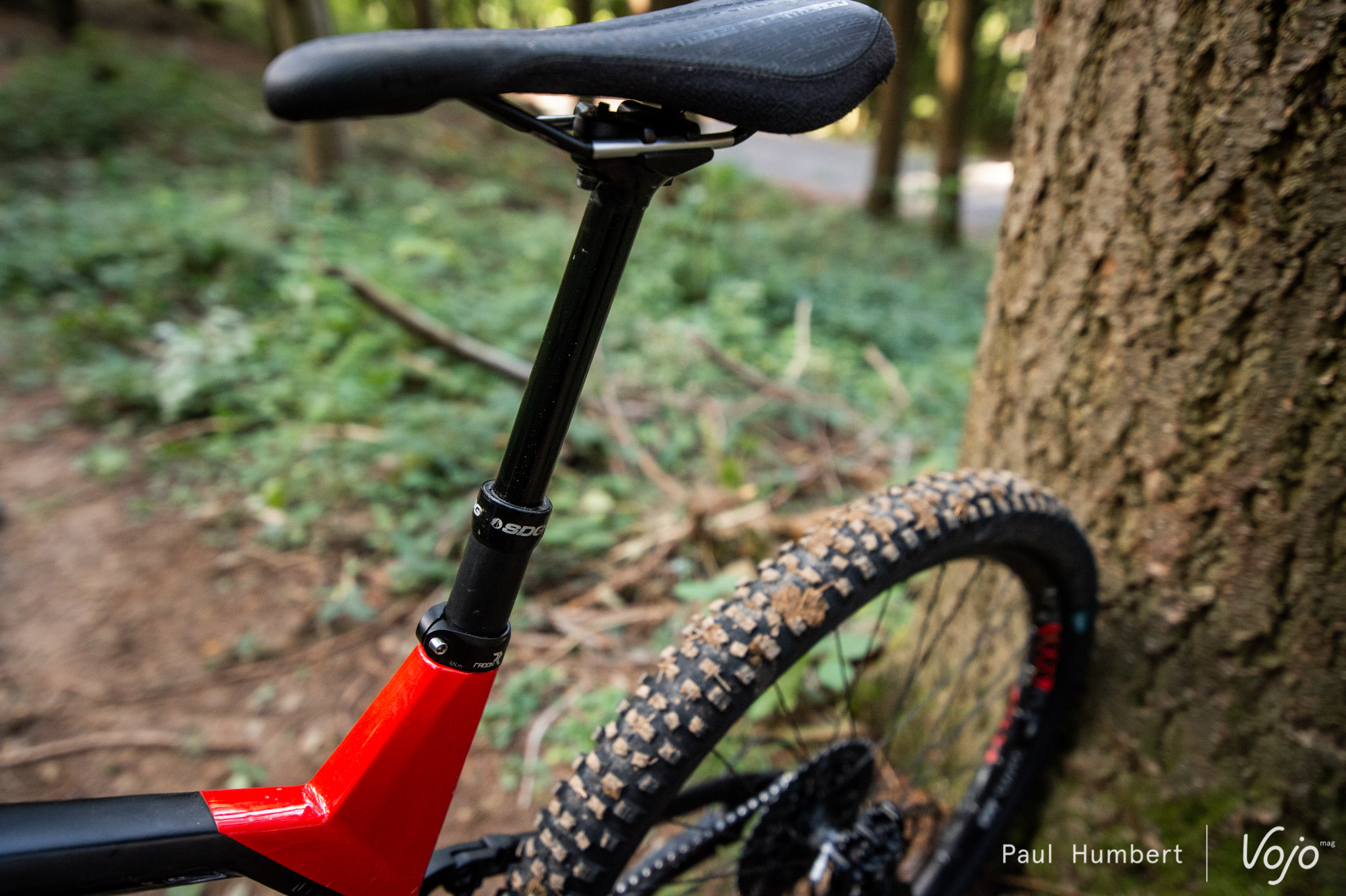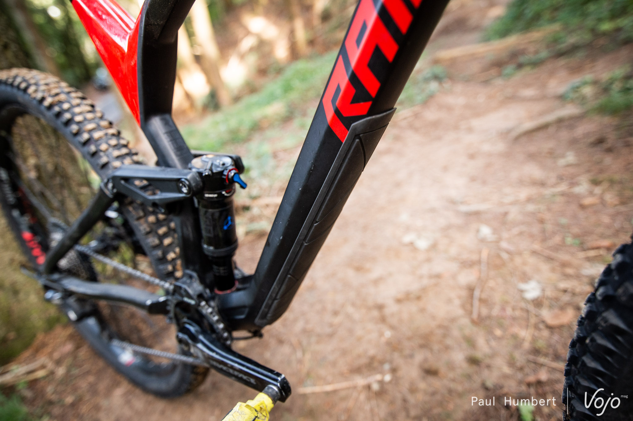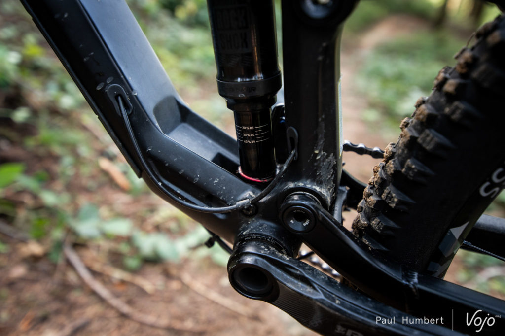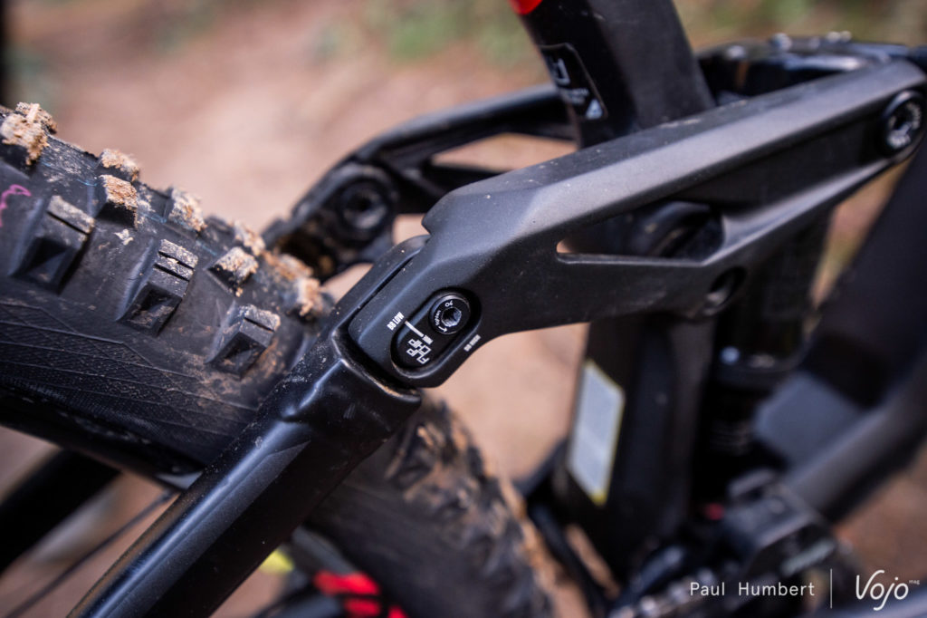 La suspension pompe peu et nous n’avons que rarement utilisé le levier 3 positions de l’amortisseur. Même en mode ouvert, le tube de selle reste suffisamment droit et cela permet d’avoir un peu plus de grip dans les sections plus techniques.