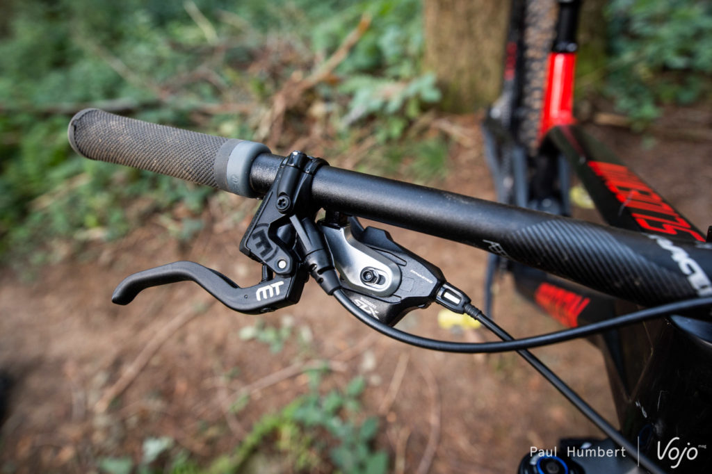 La seule remarque négative est unanime et concerne l’ergonomie des freins. Les leviers 2 doigts des Magura MT5 sont bien plus longs que ceux de leurs concurrents, ce qui impose de les décaler de manière importante vers l’intérieur, rendant inaccessible le shifter monté sur un matchmaker. A moins d’avoir des mains de géant, il est impossible de trouver une position permettant à la fois de changer de vitesse et de freiner à un doigt. Magura propose la paire de leviers 1 doigt en pièces détachées pour 65 €, mais c’est tout de même dommage de devoir changer une pièce dès la réception du vélo.