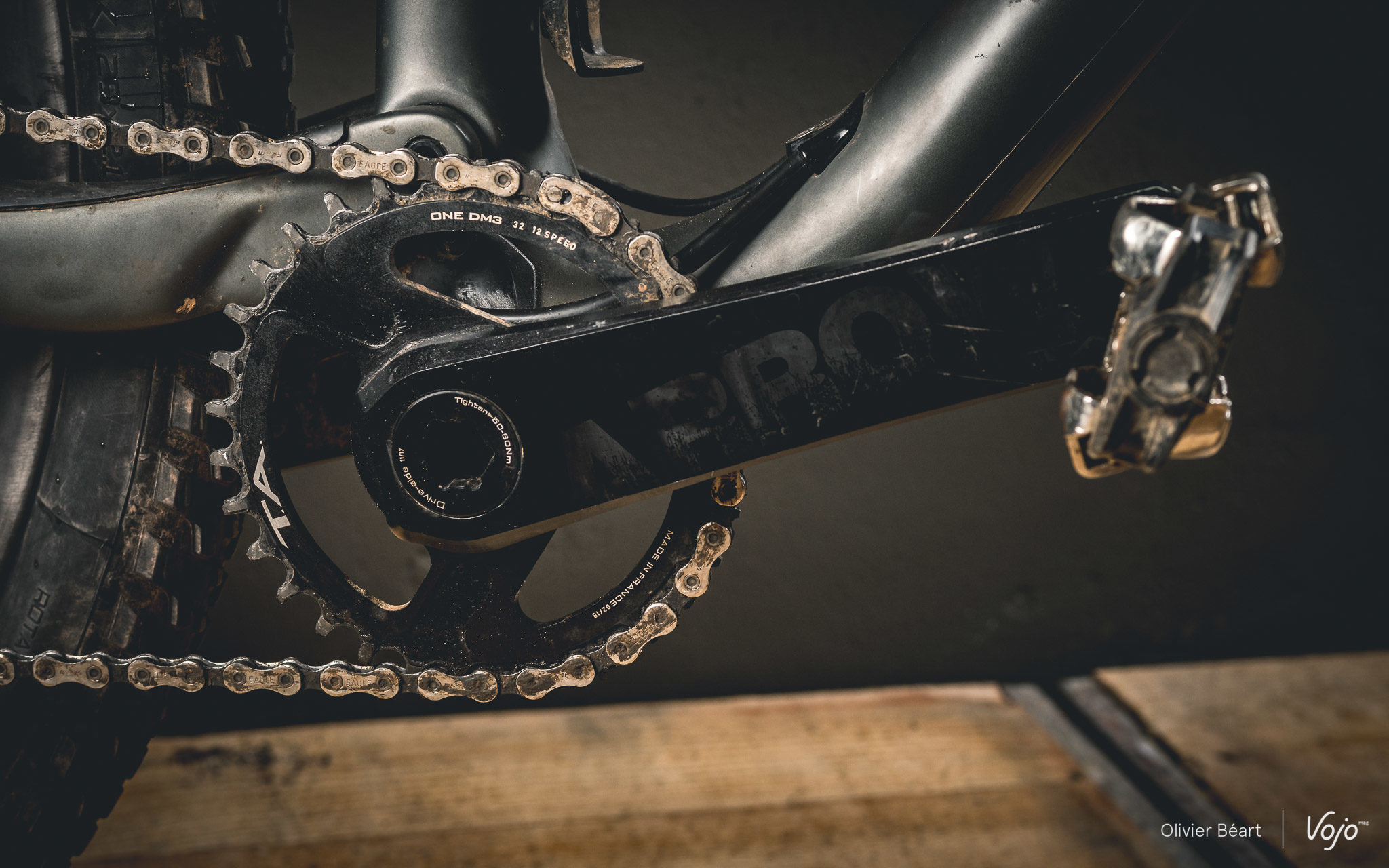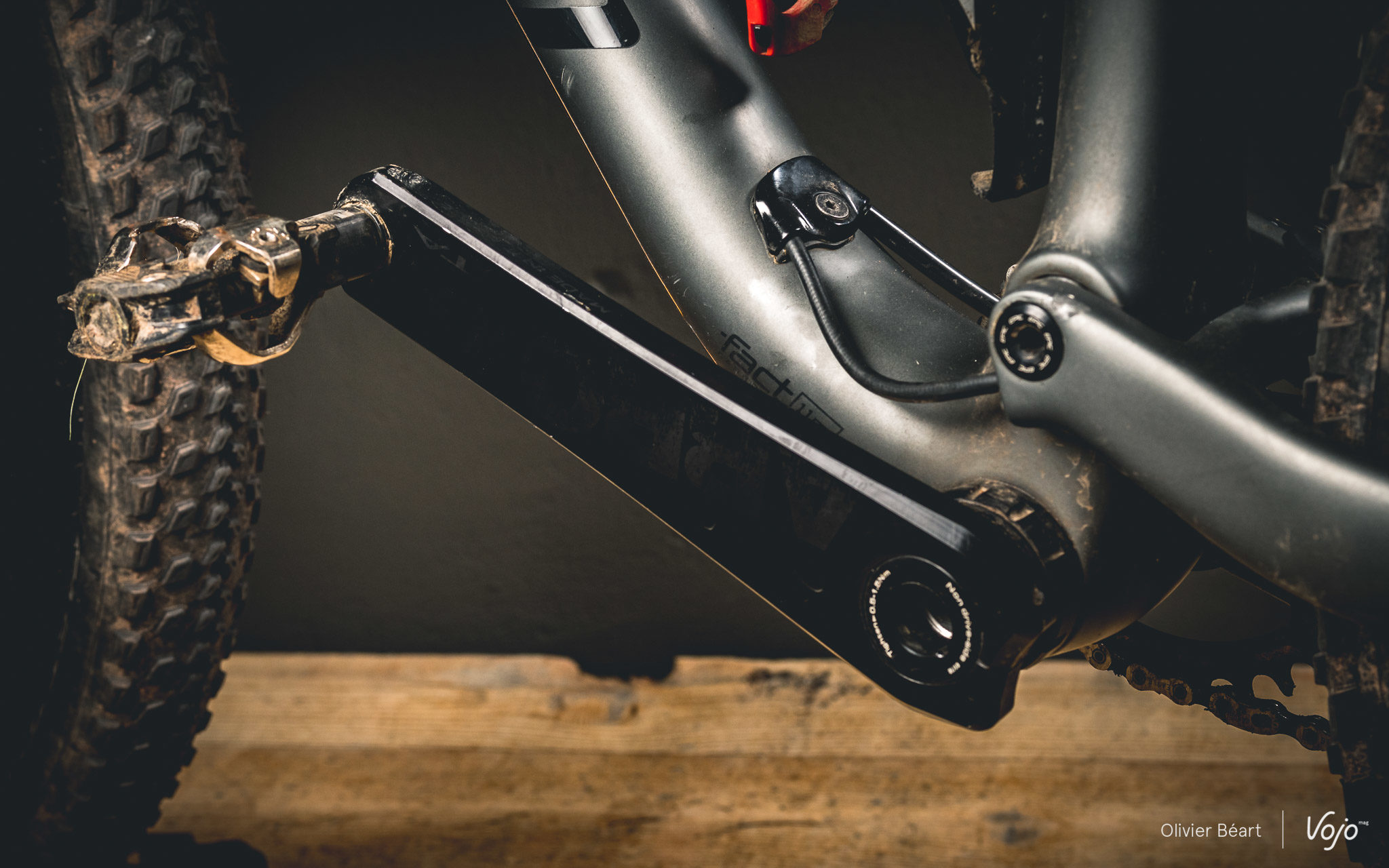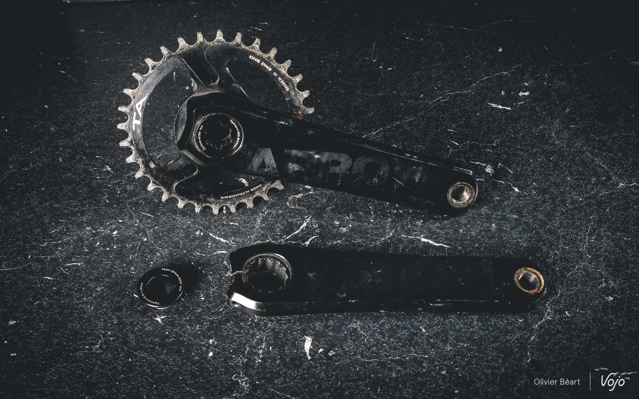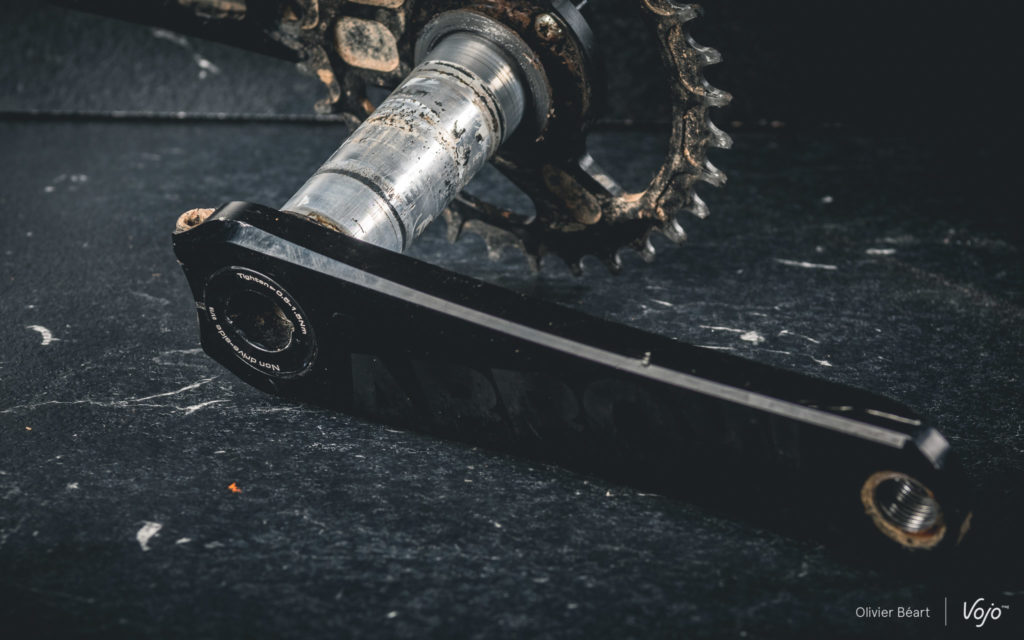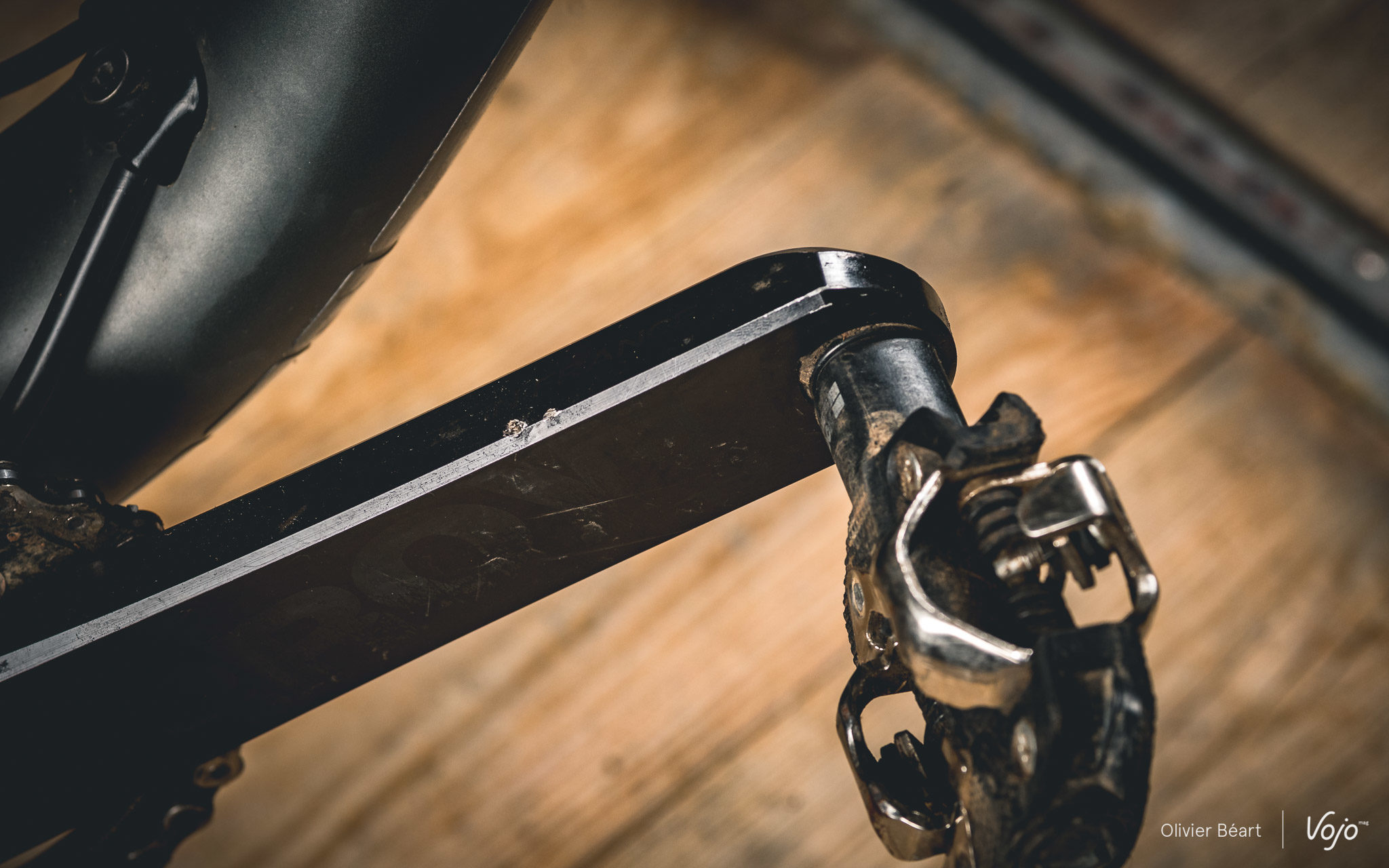 Fort logiquement vu l’ADN de l’entreprise, les manivelles sont en aluminium. Hautes et fines, elles sont généreusement évidées dans leur partie interne. C’est peu visible de l’extérieur, ça a un peu tendance à accumuler la saleté en vtt, mais quand on y regarde de près, il faut admettre que c’est bien réalisé. A noter aussi, et cela séduira les gabarits « hors normes » : il est disponibles de 5 en 5mm de longueur entre 155 et 180mm !